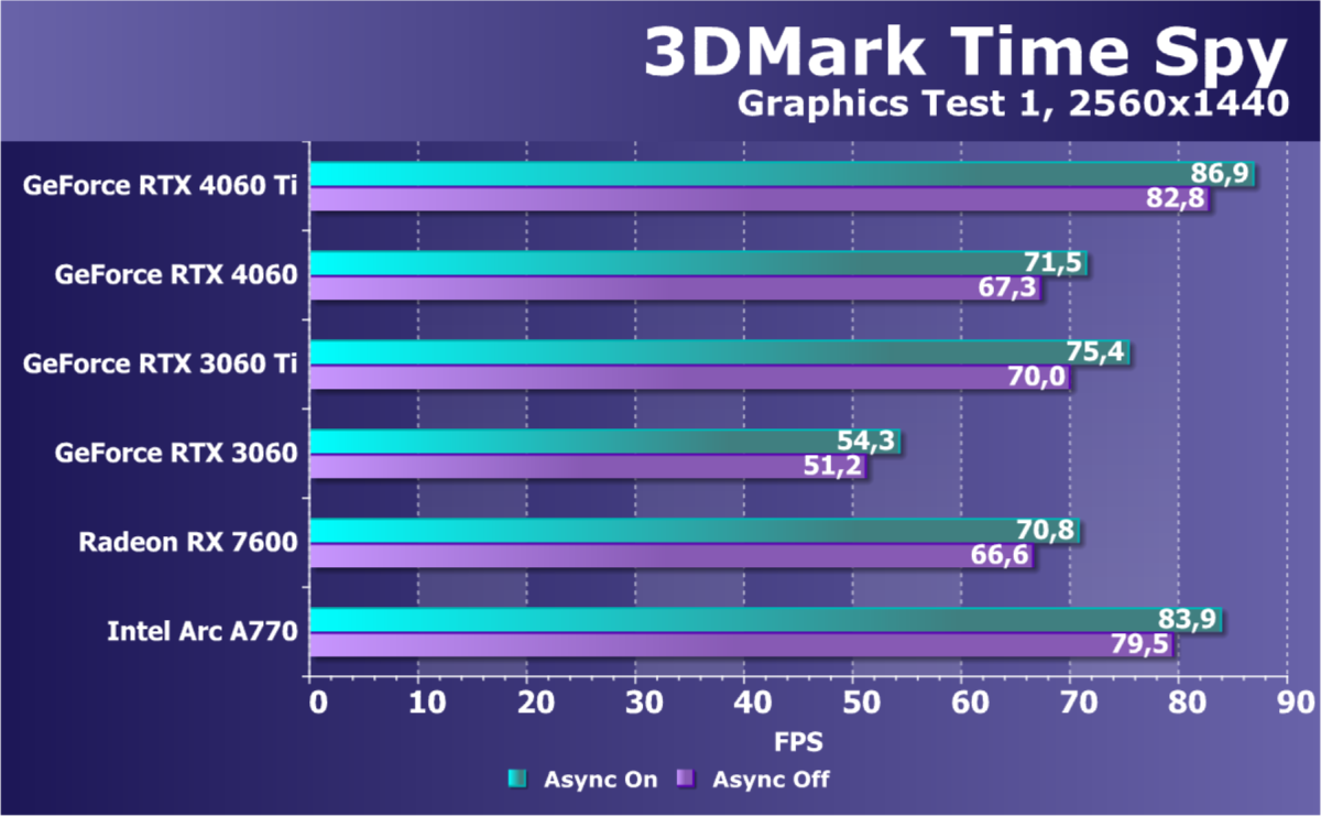 Поддержка RT и DLSS 3.0 в трех тестовых играх подняли рейтинг нового ускорителя, но Arc A770 всё равно остался вне досягаемости. А вот карта Gigabyte с ее разгоном сумела догнать GeForce RTX 3060 Ti. Заметим, что обычно каждое новое поколение GeForce RTX оказывает на ступеньку быстрее предыдущего, то есть даже референсный GeForce RTX 4060 должен обгонять GeForce RTX 3060 Ti. Тут Nvidia похвалить, по сути, не за что, и это мы еще не вспоминали про цены (сравните стоимость GeForce RTX 3060 Ti и GeForce RTX 4060!).