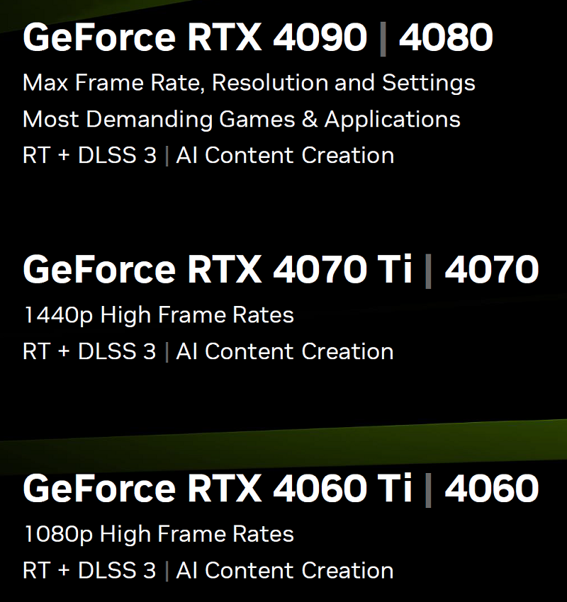 Как видно по позиционированию, GeForce RTX 4090 и RTX 4080 предназначены для разрешения 4K при всех максимальных графических настройках, вместе с трассировкой лучей, а также для полупрофессионального использования в ПО для создания цифрового контента и средств, использующих возможности нейросетей. GeForce RTX 4070 Ti и RTX 4070 уже обеспечат максимум графики лишь в разрешении 2560×1440, хотя без трассировки лучей их вполне хватит и для 4K. Ну а анонсированные позднее остальных решения среднего ценового сегмента GeForce RTX 4060 Ti и RTX 4060 годятся уже только для Full HD-разрешения, если говорить о самых современных играх. Их мощности должно хватать для того, чтобы обеспечить высокую частоту кадров при Full HD-разрешении и максимальных (или как минимум очень высоких) графических настройках даже в таких ресурсоемких играх, как Cyberpunk 2077, Microsoft Flight Simulator и других.