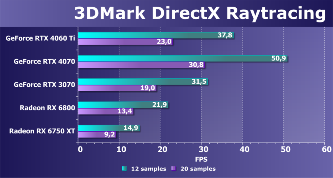 Наши исследования показали, что GeForce RTX 4060 Ti имеет относительно привлекательное соотношение цены и производительности в своей группе исключительно в играх с применением технологии трассировки лучей и масштабирования DLSS 3.0 — тогда он еще худо-бедно дотягивается до GeForce RTX 3070/Ti. В остальных случаях это уровень чуть выше GeForce RTX 3060 Ti, максимум — посредине между последним и GeForce RTX 3070.