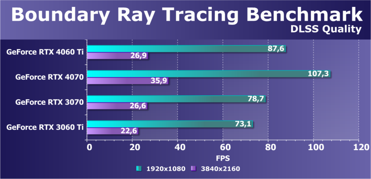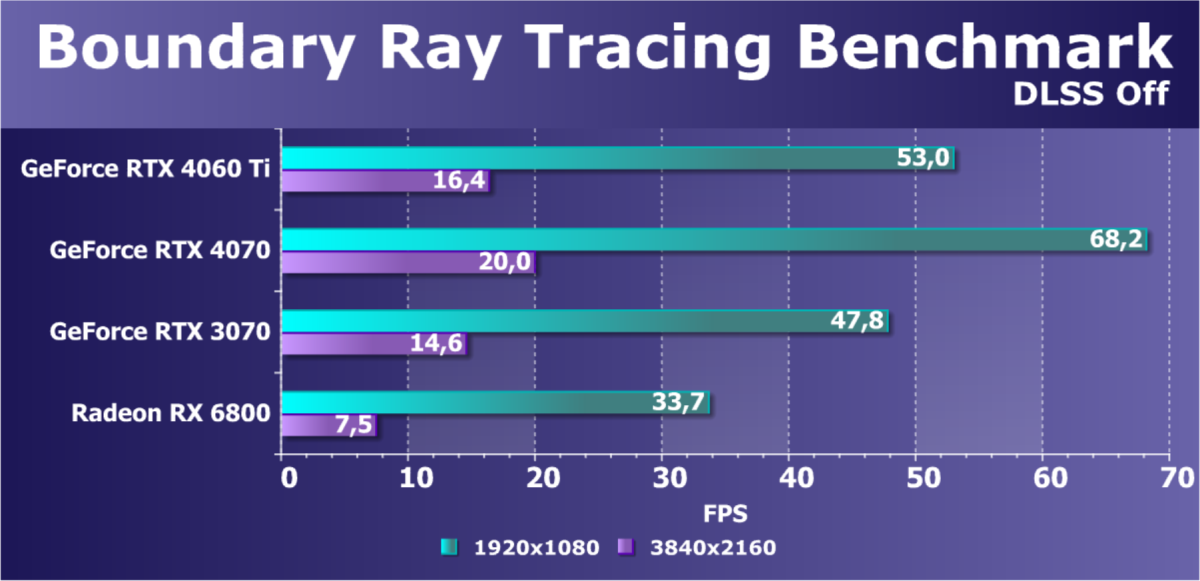 C учетом некоторого падения производительности при активации в играх трассировки лучей (при этом появляется всё больше и больше игр с поддержкой Nvidia DLSS, а эта технология масштабирования позволяет резко поднять производительность, в том числе компенсируя падение от включения RT), а также того факта, что у видеокарт Radeon RX 6000 падение FPS куда более драматичное, новинка GeForce RTX 4060 Ti смотрится довольно убедительно. К тому же, приобретая GeForce RTX 4060 Ti, игрок получает и поддержку DLSS 3, так что в соответствующих играх можно будет вообще никогда не отключать трассировку лучей. Однако это относится уже только к разрешению 1080p (Full HD). В разрешении 2.5K отменный комфорт можно получить лишь без трассировки лучей и с DLSS 3.0 (а эта технология пока применена всего в нескольких десятках игр) или по крайней мере с DLSS 2.0.
