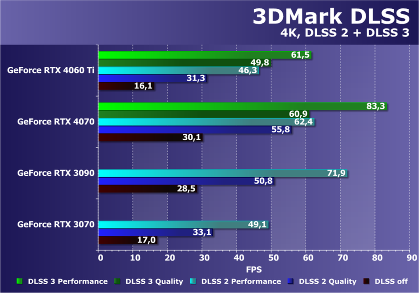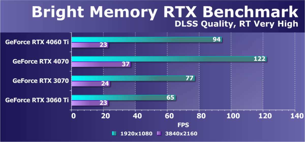 Главное нововведение DLSS 3 заключается в создании дополнительных интерполированных кадров на основе пары существующих, для чего используется специализированный аппаратный движок Optical Flow Accelerator, интерполирующий соседние кадры и создающий на их основе новые. Но даже без учета этого мощности RTX 4060 Ti вполне достаточно для того, чтобы обеспечить высокую частоту кадров при Full HD-разрешении и максимальных или очень высоких графических настройках в таких ресурсоемких играх, как Cyberpunk 2077, Microsoft Flight Simulator и многих других.