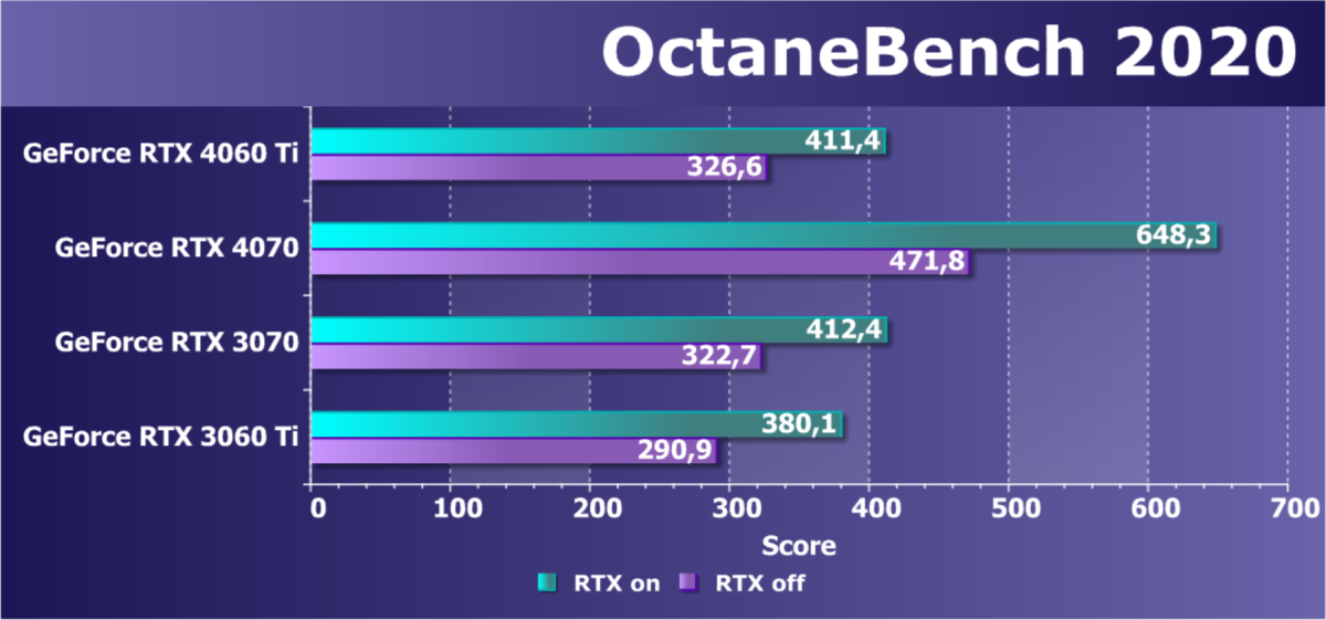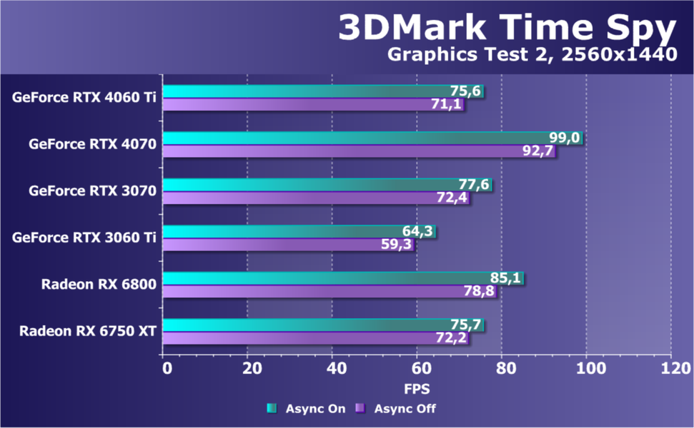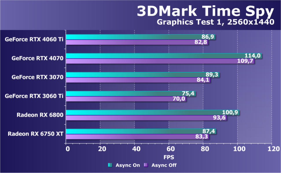 В целом наблюдается явная тенденция к сокращению разрыва между соответствующими уровнями ускорителей двух поколений: GeForce RTX 4070 Ti — это, по сути, GeForce RTX 3090 Ti (опережение на 3 уровня); GeForce RTX 4070 — это, по сути, GeForce RTX 3080 (10 ГБ), то есть опережение уже всего на 1 уровень; а в случае с GeForce RTX 4060 Ti даже и такого нет: до GeForce RTX 3070 эта карта просто не дотягивает.