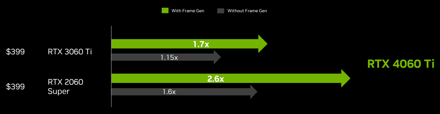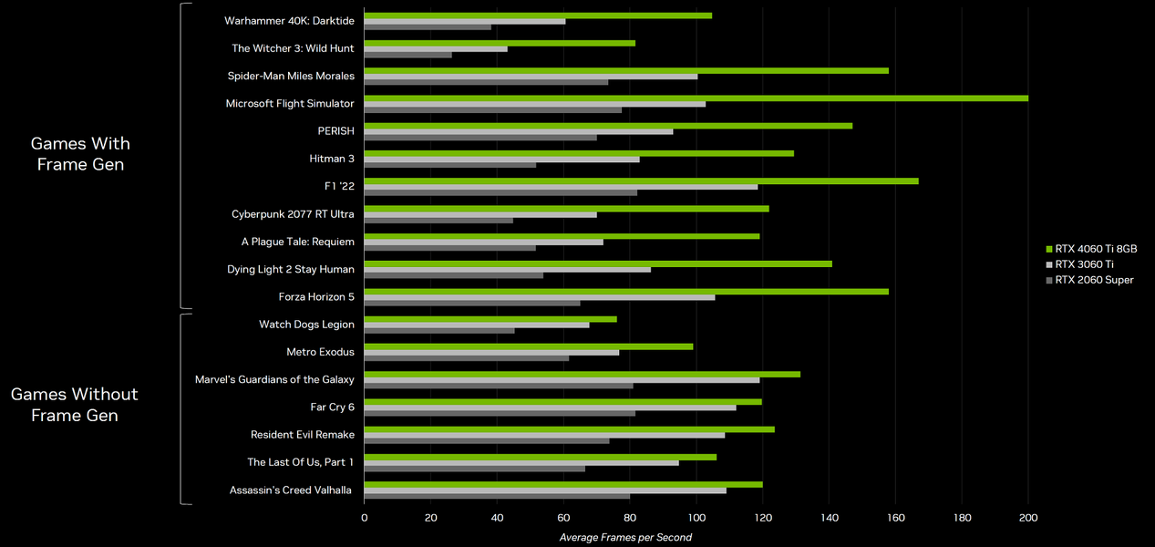 Что касается производительности в играх, то GeForce RTX 4060 Ti предлагает скорость рендеринга где-то между RTX 3060 Ti и RTX 3070 с возможностью дополнительного увеличения частоты кадров в играх с поддержкой технологии DLSS 3. На системе с процессором Intel Core i9-12900K в Full HD-разрешении при максимальных настройках и с включенными трассировкой лучей и DLSS в играх с их поддержкой, новая модель показывает следующую производительность относительно своих предшественниц: RTX 3060 Ti и RTX 2060 Super (по данным Nvidia):