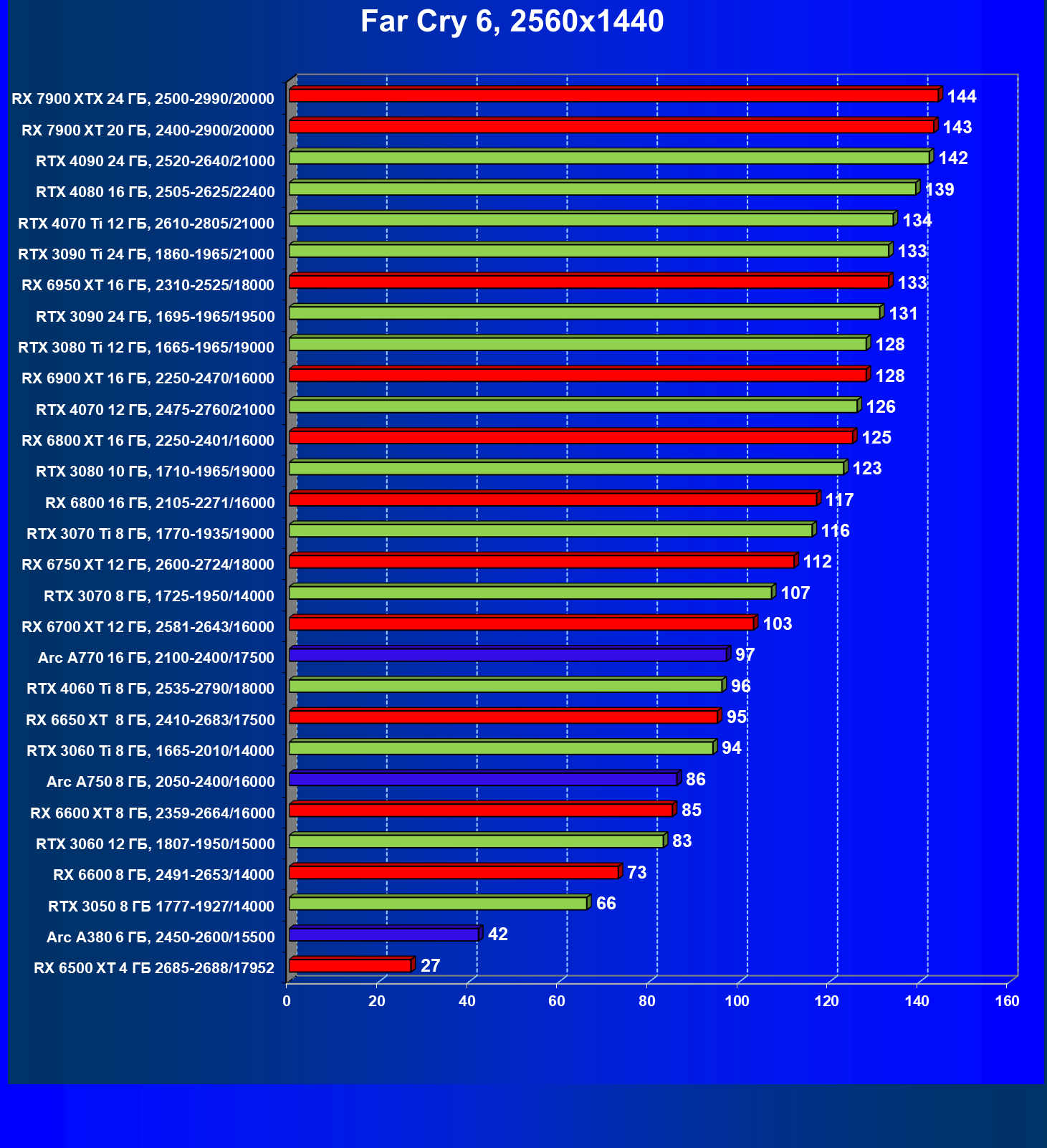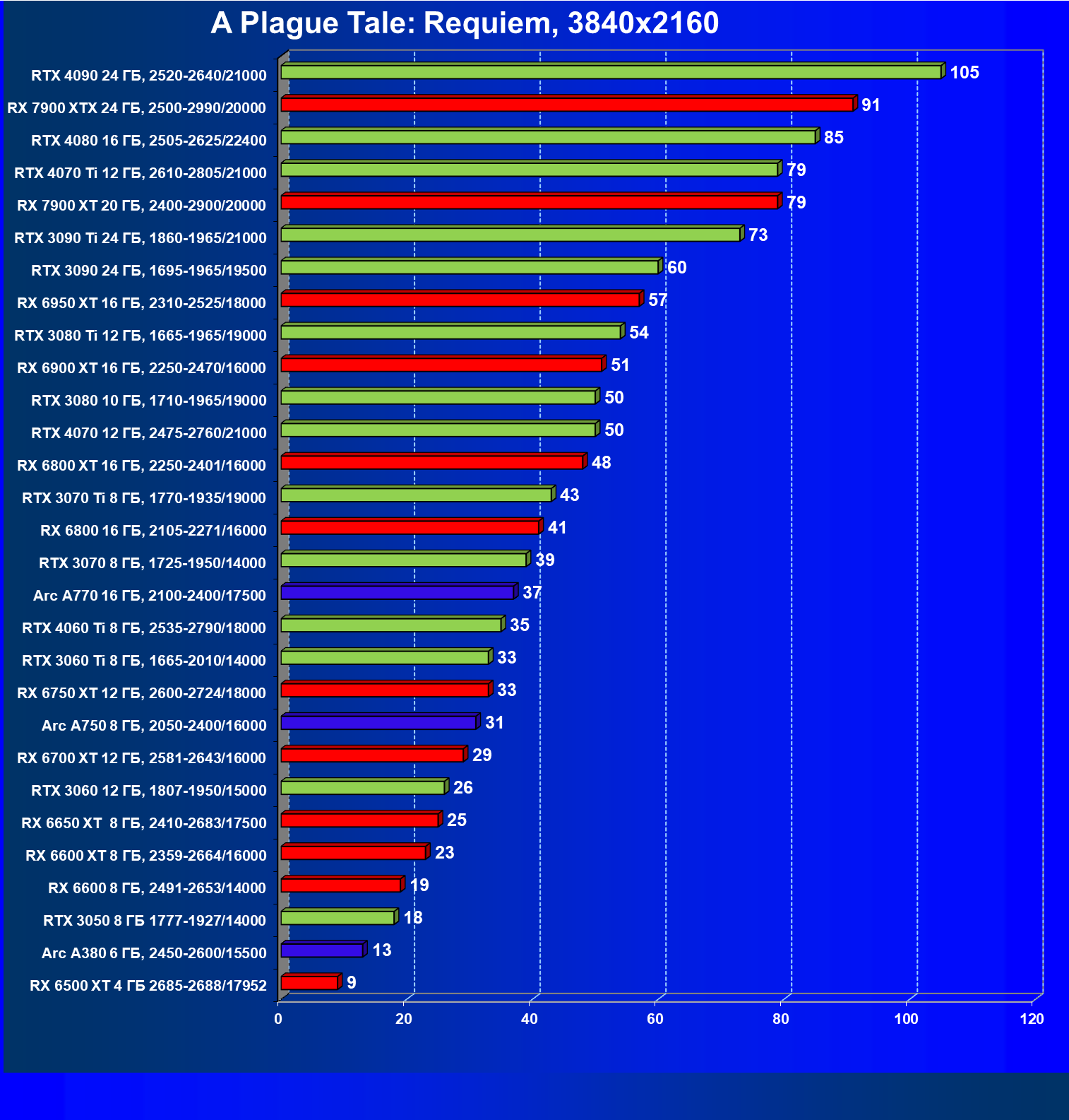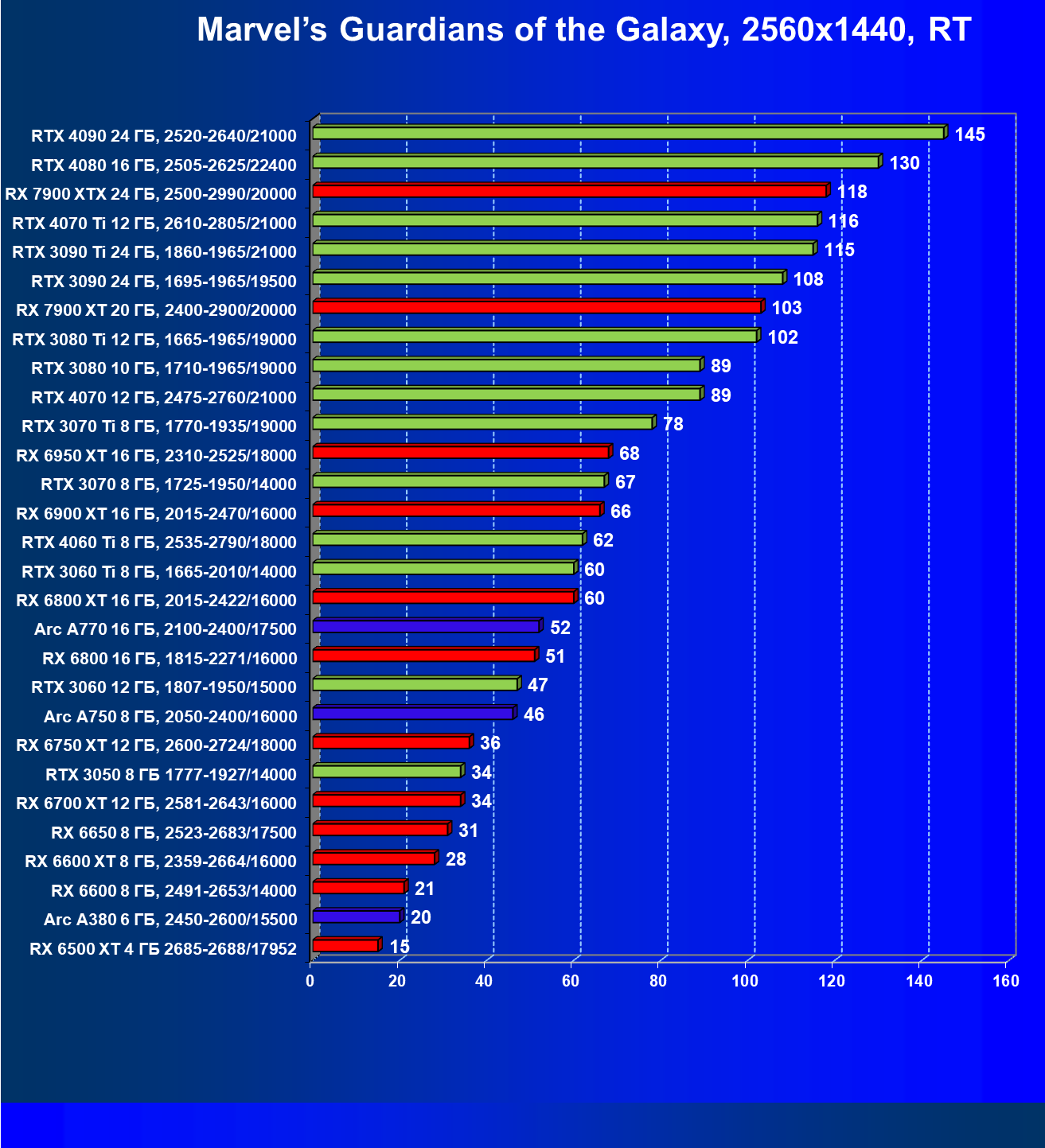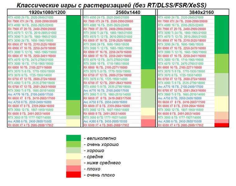| 19 | Arc A770 16 ГБ, 2100—2400/17500 | 447 | 159 | 28 000 |