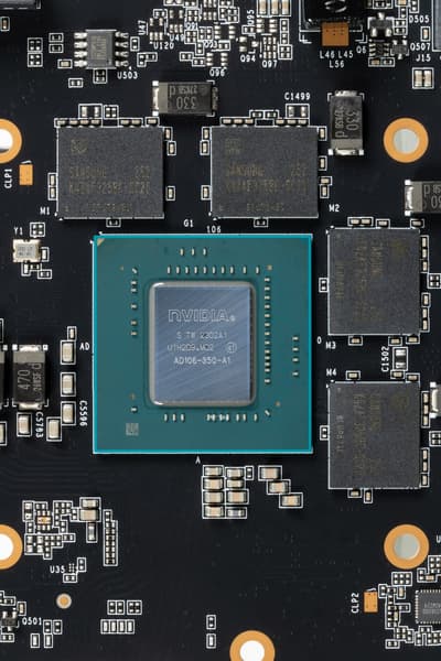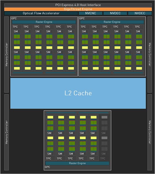 Графический процессор AD106 имеет три кластера обработки графики GPC, они содержат по шесть кластеров обработки текстур TPC, каждый из которых имеет по два потоковых мультипроцессора SM. Каждый мультипроцессор, в свою очередь, содержит по 128 CUDA-ядер в четырех разделах. Половина из них умеют вычислять данные в формате FP32, а другие поддерживают FP32 или INT32 — есть возможность параллельной обработки FP32 и INT32. Каждый мультипроцессор SM также содержит RT-ядро третьего поколения, четыре тензорных ядра четвертого поколения, кэш-память и четыре текстурных блока TMU.