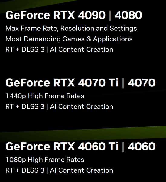 Nvidia позиционирует свою текущую линейку определенным образом. Если модели GeForce RTX 4090 и RTX 4080 предназначены для разрешения 4K при всех максимальных графических настройках, вместе с трассировкой лучей, а также для полупрофессионального использования в ПО для создания цифрового контента и средств, использующих возможности нейросетей, то GeForce RTX 4070 Ti и RTX 4070 уже обеспечат максимум графики лишь в разрешении 2560×1440, хотя без трассировки лучей их вполне хватит и для 4K. Ну а анонсированные недавно GeForce RTX 4060 Ti и RTX 4060 годятся уже только для Full HD-разрешения, если говорить о самых современных играх.