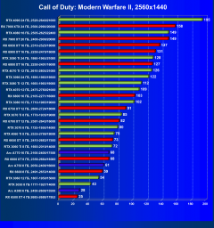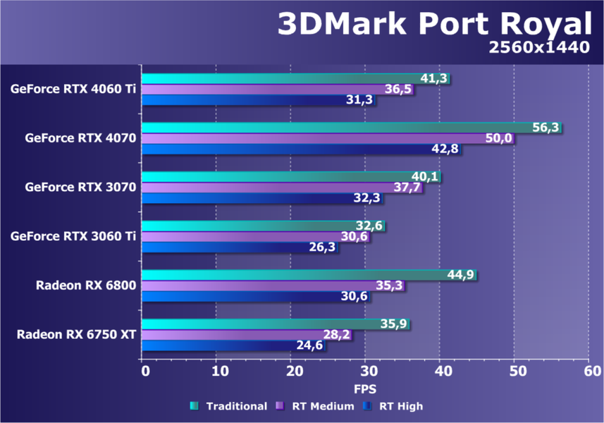 В среднем при Full HD-разрешении в современных играх с использованием трассировки лучей, GeForce RTX 4060 Ti почти равна с RTX 3070 предыдущего поколения и аналогична еще более старой RTX 2080 Ti. Но прирост производительности от поколения к поколению очень невелик — около 15%, это заметно меньше того, что дали старшие модели линейки GeForce RTX 40 по сравнению с аналогами из RTX 30. Если сравнивать с AMD Radeon, то новая RTX 4060 Ti превосходит по скорости Radeon RX 6750 XT, а в некоторых играх с трассировкой она быстрее RX 6800 и даже RX 6800 XT. В Full HD-разрешении и при максимальных настройках, GeForce RTX 4060 Ti обычно достигает 60 кадров в секунду и более практически во всех играх, кроме самых требовательных. Новинка также вполне способна запускать многие игры и в разрешении 2560x1440, но иногда может потребоваться некоторое снижение настроек.
