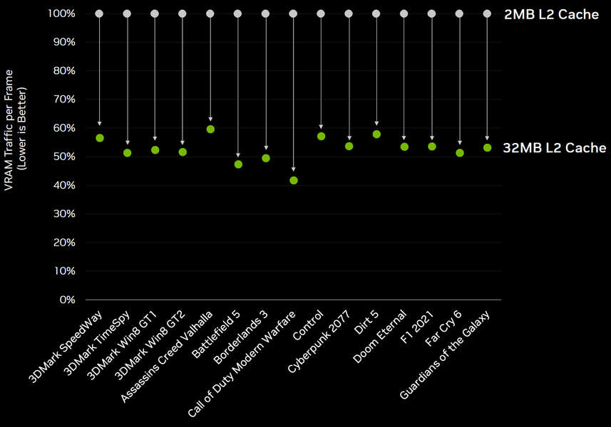 Для сравнения эффективности увеличенного L2-кэша Nvidia привела данные RTX 4060 Ti с 32 МБ L2-кэша и специальной версией такой же видеокарты со всего лишь 2 МБ кэша — как в 128-битных графических процессорах предыдущего поколения с 512 КБ L2-кэша на каждый 32-битный контроллер памяти. Как видно на иллюстрации, наличие 32 МБ кэша снизило передачу данных из памяти на 40%—60% по сравнению с вариантом с 2 МБ. А среднее сокращение трафика на 50% позволяет GPU использовать пропускную способность памяти вдвое эффективнее, и в результате всех улучшений графический процессор в RTX 4060 Ti с пропускной способностью памяти в 288 ГБ/с демонстрирует вдвое бо́льшую эффективную производительность — 554 ГБ/с (теоретический показатель). В общем, увеличенный объем кэша в Ada повышает производительность и улучшает общую энергоэффективность — при необходимости использовать более узкую шину памяти.