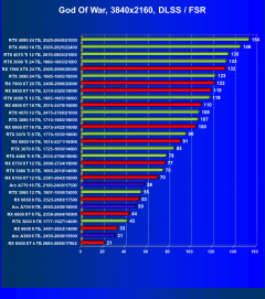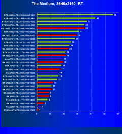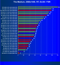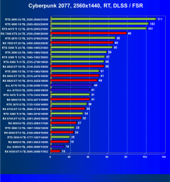 Рейтинг составлен по 9 тестам, в которых используется технология трассировки лучей и одновременно технология Nvidia DLSS, AMD FSR или Intel XeSS. Этот рейтинг нормирован по самому слабому ускорителю в данной группе — Radeon RX 6500 XT (то есть сочетание скорости и функций Radeon RX 6500 XT приняты за 100%).