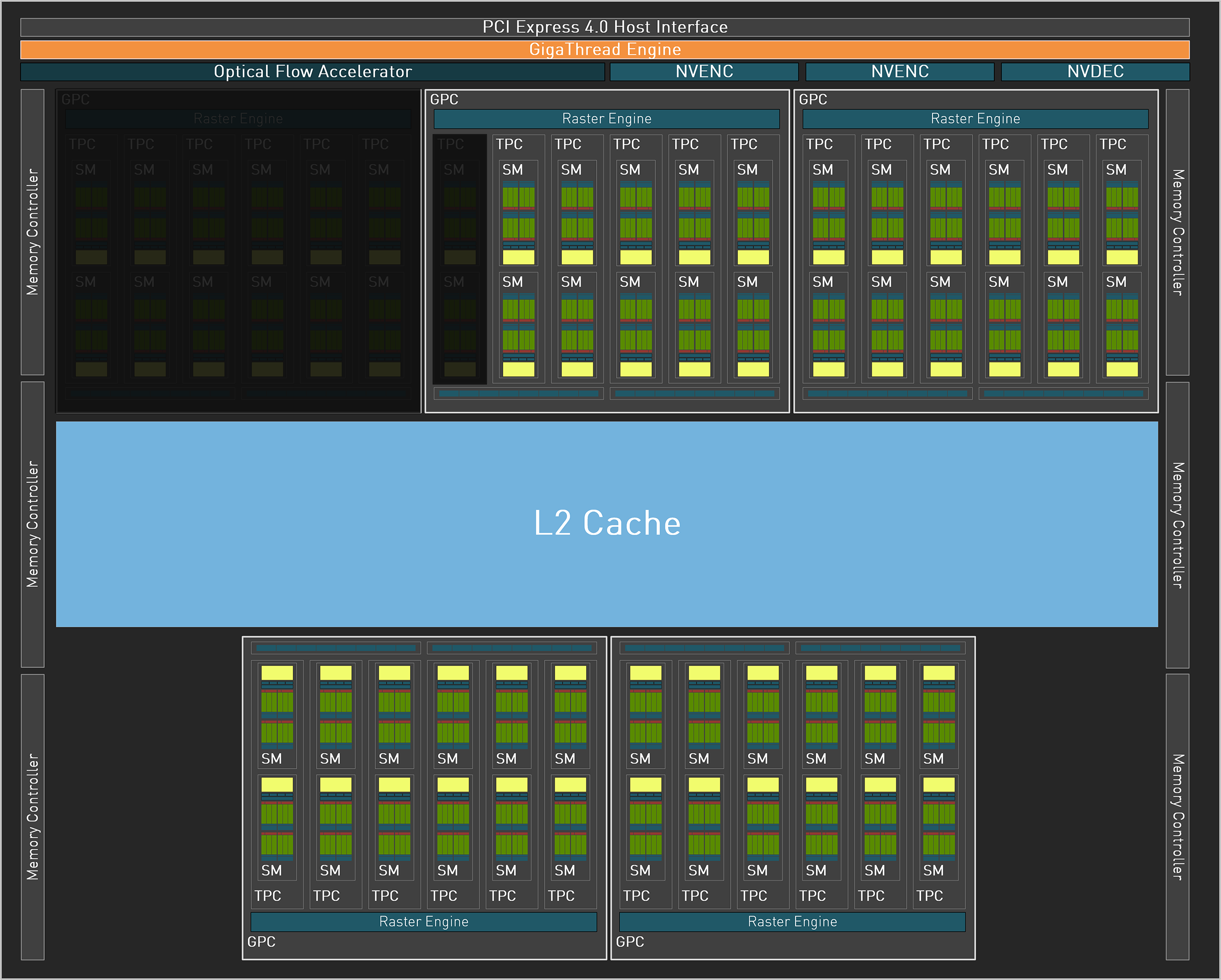 Как и все графические процессоры компании Nvidia, чип AD104 состоит из укрупненных кластеров Graphics Processing Cluster (GPC), которые включают несколько кластеров текстурной обработки Texture Processing Cluster (TPC), содержащих потоковые процессоры Streaming Multiprocessor (SM), блоки растеризации ROP и контроллеры памяти. Как и в предыдущих архитектурах, кластер GPC самостоятельно производит все основные вычисления внутри кластера, и включает свой движок растеризации Raster Engine, шесть кластеров TPC, состоящих из 12 мультипроцессоров SM. Но выше мы говорили о полноценном GPU, а в RTX 4070 применяется урезанная версия: