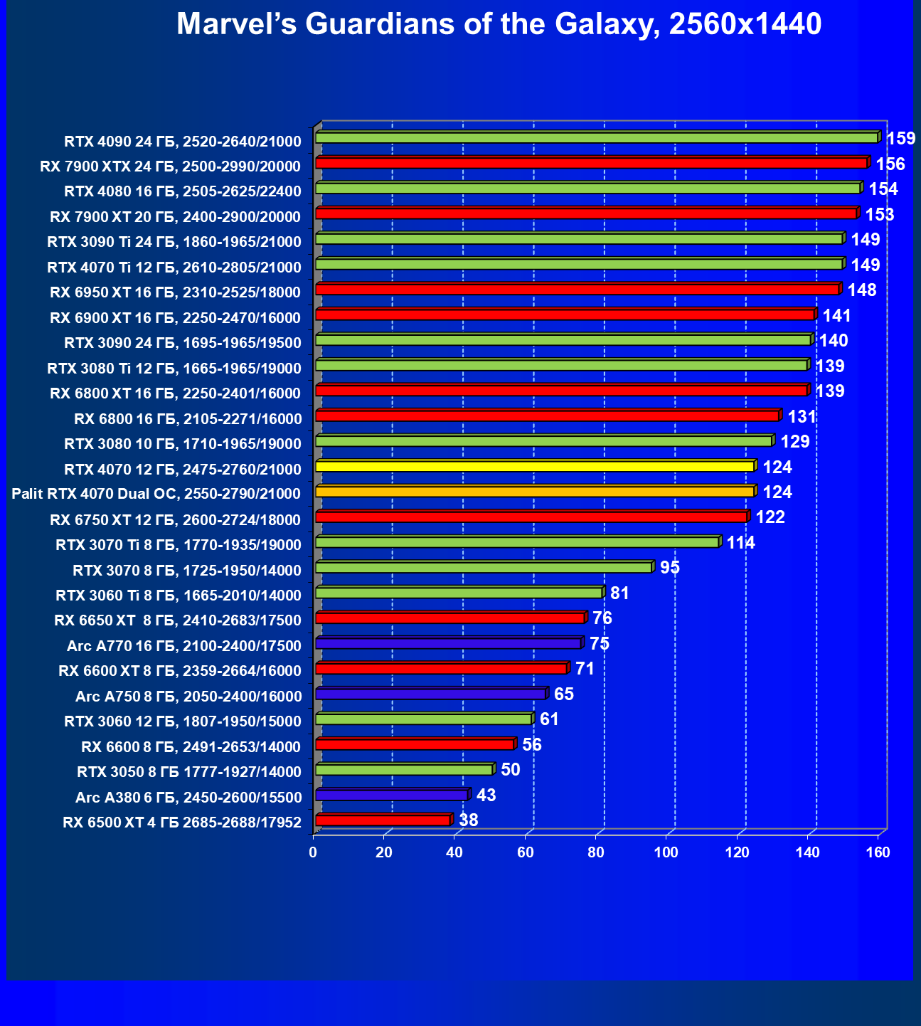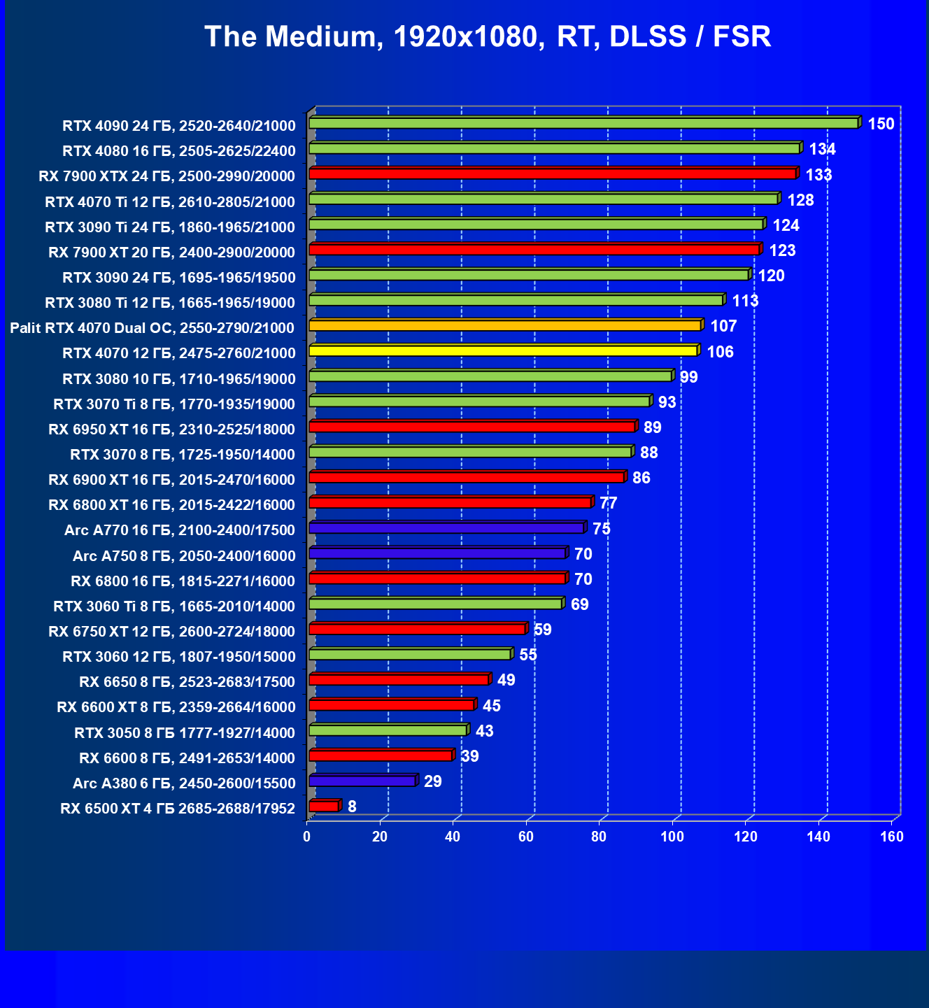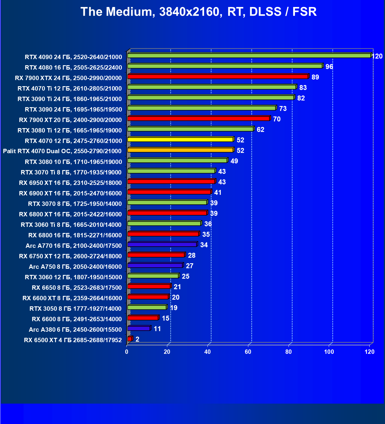 Как и следовало ожидать, у карт Radeon падение FPS более драматичное, так что они в этом рейтинге сместились вниз, а GeForce RTX 4070 является лидером в своей группе. При этом из-за поддержки DLSS 3.0 в ряде игр новинка обходит и более дорогой GeForce RTX 3080 Ti.
