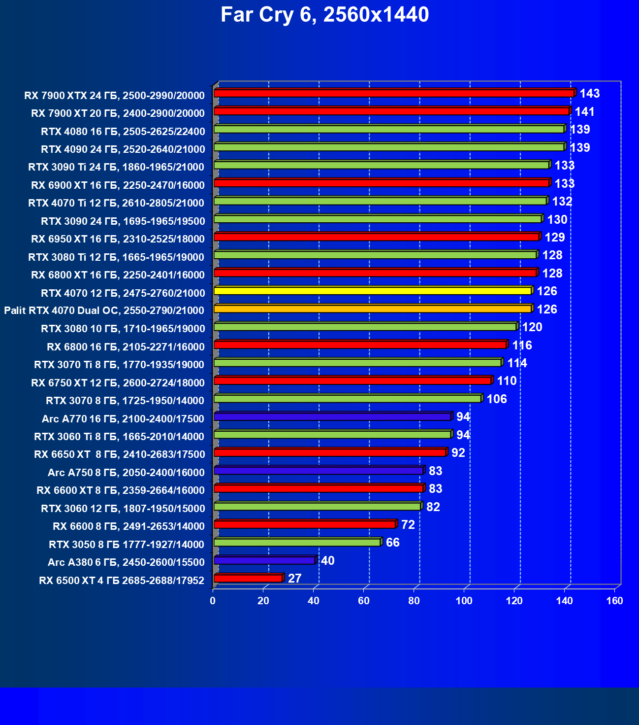 Прекрасно видно, что в целом в классических играх GeForce RTX 4070 идет наравне с GeForce RTX 3080 (10 ГБ), даже чуть быстрее. При этом карта Palit за счет чисто формального разгона чуть-чуть опережает референсный вариант GeForce RTX 4070. Также очевидно, что уже успевший подешеветь Radeon RX 6800 XT существенно обходит GeForce RTX 4070, да и почти равный по стоимости Radeon RX 6900 XT смотрится явно лучше. Но это мы говорим об играх без современных технологий трассировки лучей и «умного» масштабирования.