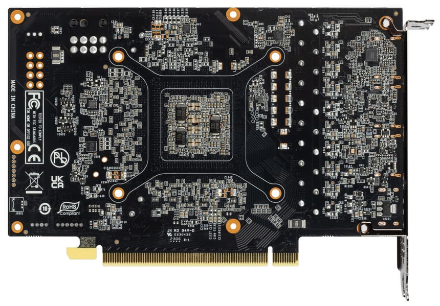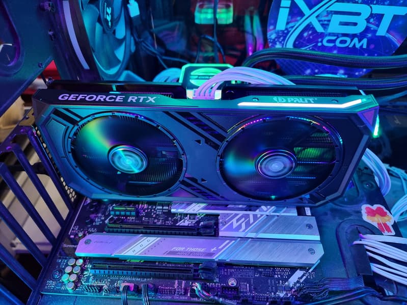 При этом переход с GeForce RTX 4070 Ti на GeForce RTX 4070 у компании Palit почему-то вызвал резкое желание упростить всё до предела: комплект поставки — никакой, кулер чрезвычайно упрощен, при вращении вентиляторы издают звенящий призвук. Спасает только то, что без нагрузки вентиляторы останавливаются, поэтому при обычной работе ПК данная карта тихая. И заметим, что имеется вероятность того, что этот призвук есть только у отдельных экземпляров, включая наш. Проверить на других таких же картах не представлялось возможным.