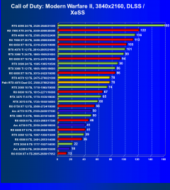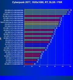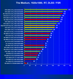 Рейтинг составлен по 9 тестам, в которых используется технология трассировки лучей и одновременно технология Nvidia DLSS, AMD FSR или Intel XeSS. Этот рейтинг нормирован по самому слабому ускорителю в данной группе — Radeon RX 6500 XT (то есть сочетание скорости и функций Radeon RX 6500 XT приняты за 100%).