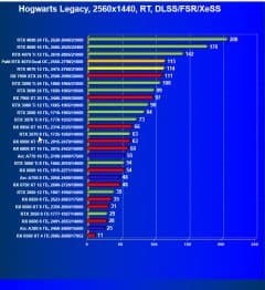Результаты тестов со включенной аппаратной трассировкой лучей и/или DLSS/FSR/XeSS в разрешениях 1920×1080, 2560×1440 и 3840×2160