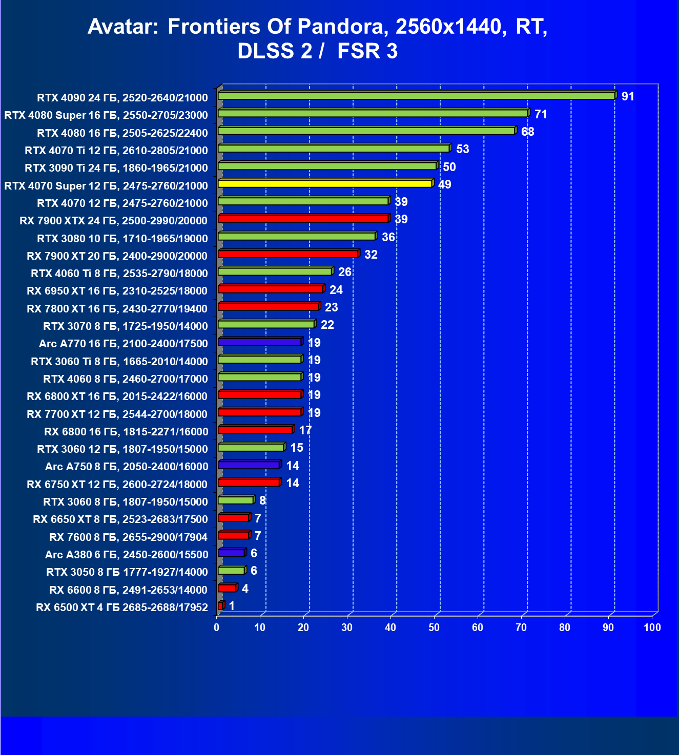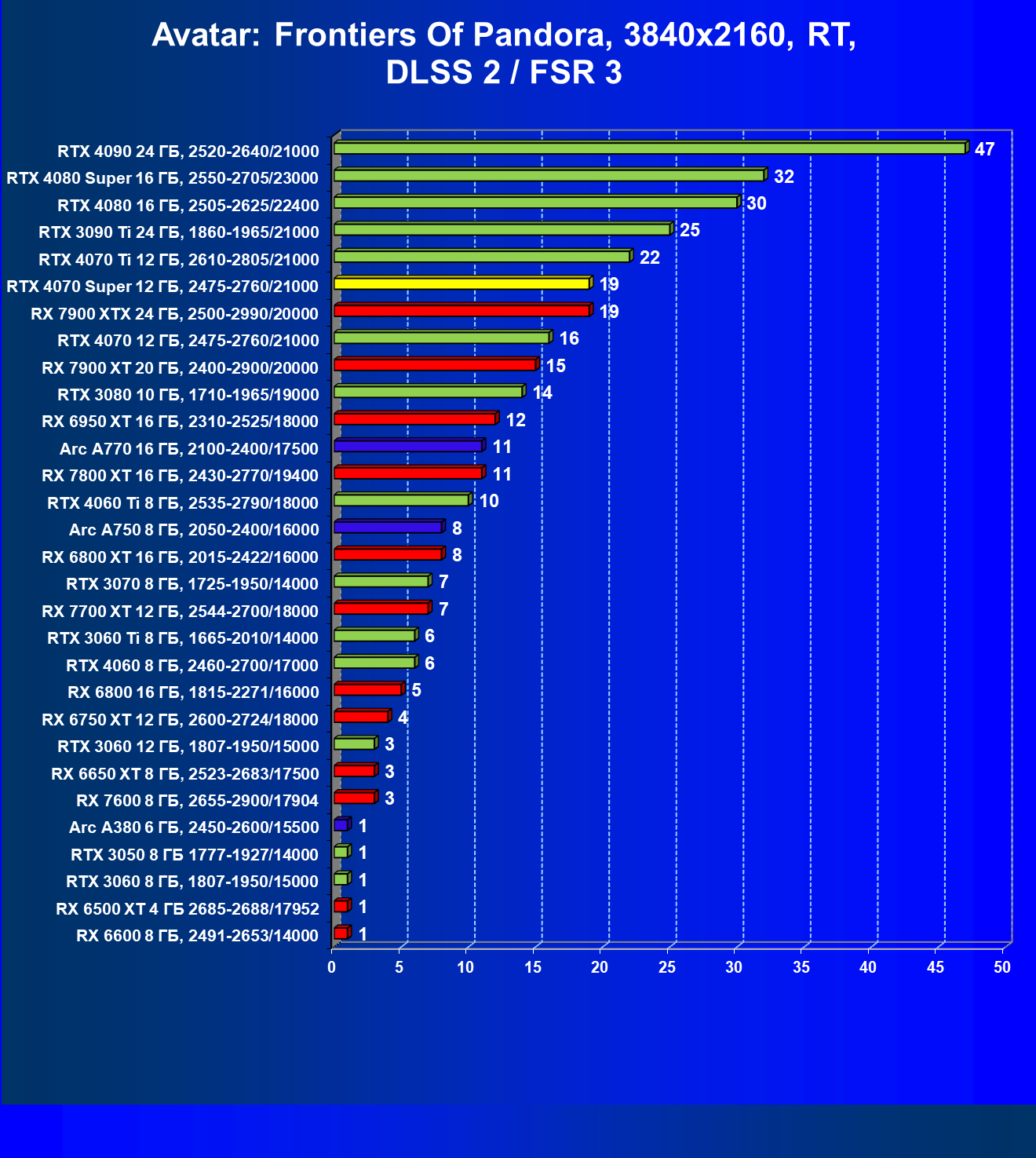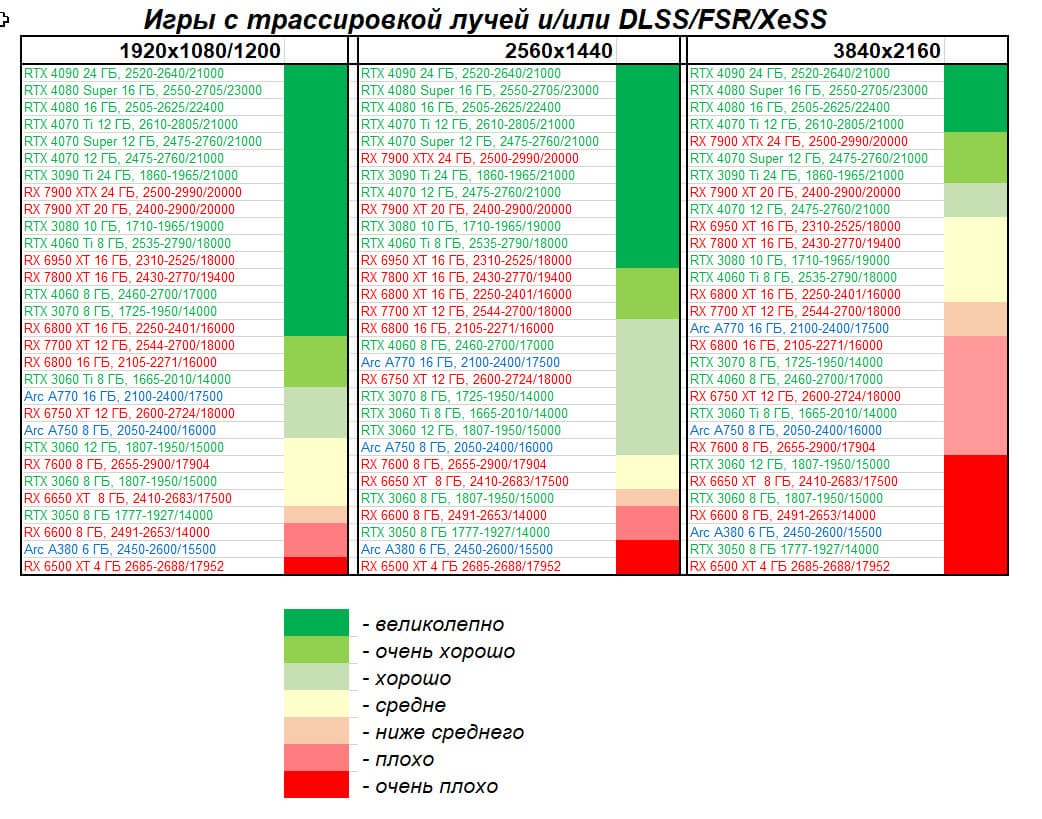 А здесь уже всё более-менее встало на свои места (хотя, как мы уже говорили, GeForce RTX 4070 Super должен по цене приблизиться к GeForce RTX 4070, лишь тогда он сможет стать абсолютным лидером в рейтинге полезности). Видеокарты AMD же, даже несмотря на более низкие цены, соревнование после включения RT категорически проигрывают.