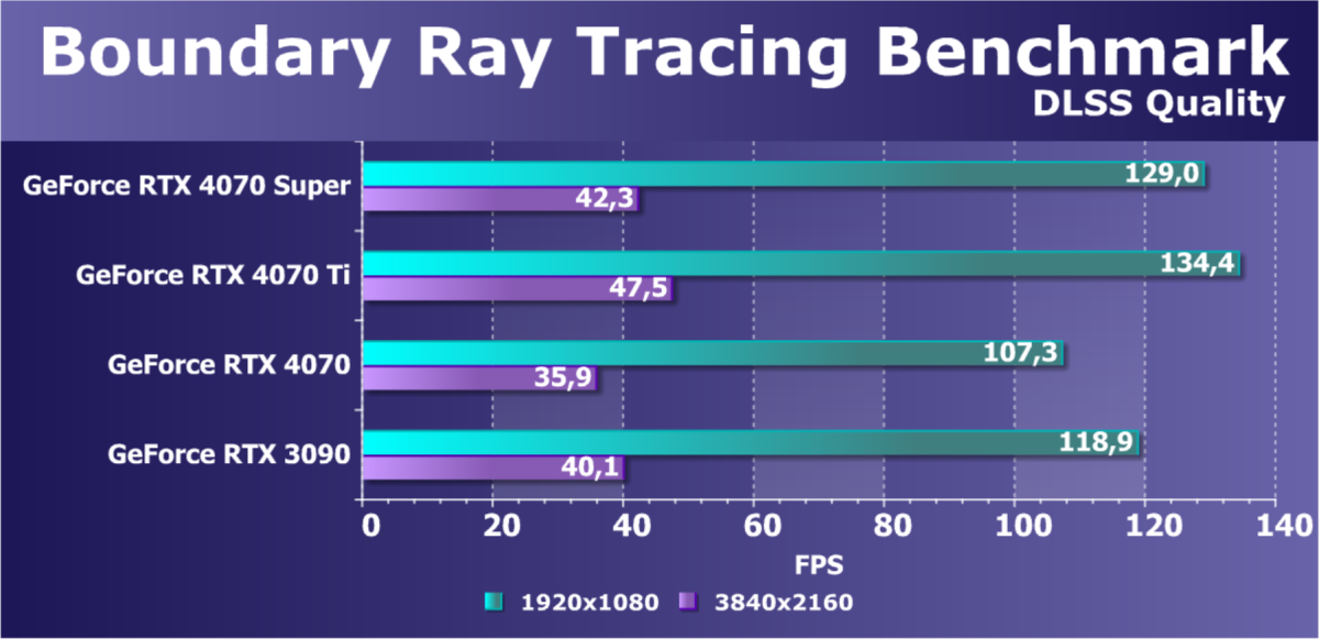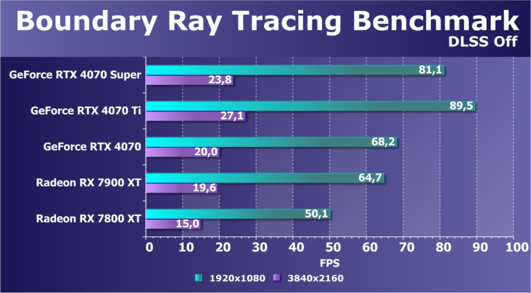 Точно так же GeForce RTX 4070 Super хорошо подходит и для игр с трассировкой лучей с поддержкой DLSS/FSR/XeSS, обеспечивая прекрасный комфорт в разрешениях 1080p и 1440p, а для получения такого же отменного комфорта в разрешении 2160p (4K) потребуется поддержка в игре DLSS 3. Если же игра с трассировкой лучей не поддерживает технологии масштабирования, то зона комфорта будет ограничена разрешением 1440p (2.5K).