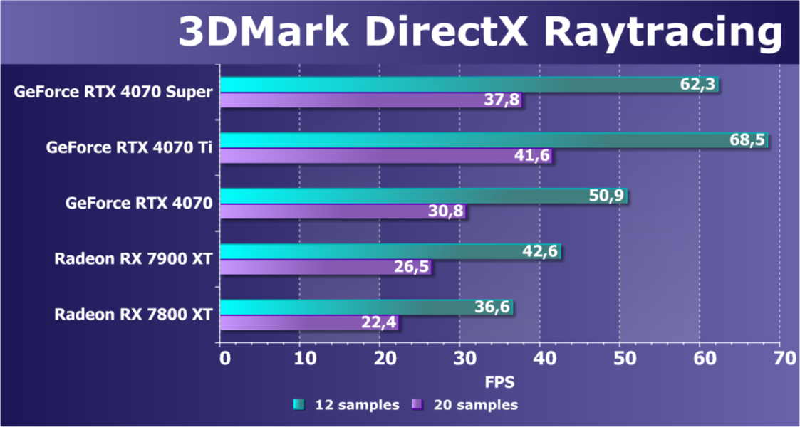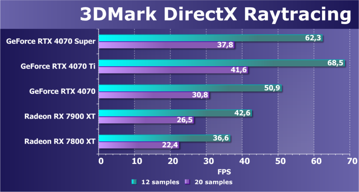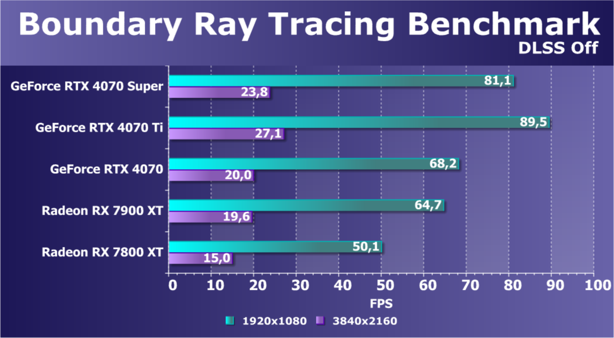 Неудивительно, что в трассировке лучей GeForce RTX 4070 Super чувствует себя еще лучше, превосходя порой не только Radeon RX 7800 XT, но и Radeon RX 7900 XT, а то и Radeon RX 7900 XTX. Конечно, всё зависит от сложности этой самой трассировки, а также используемого объема видеопамяти, ведь в 4K-разрешении без DLSS/FSR уже могут наблюдаться случаи, когда 12 ГБ не хватает. Кроме этого, сравнительно узкая 192-битная шина также может ограничивать скорость этого GPU в высоких разрешениях, хотя ему сильно помогает увеличенный L2-кэш. Хорошо бы иметь 256-битную шину и 16 ГБ памяти, конечно, но в случае AD104 это просто невозможно, туда можно лишь поставить 24 ГБ памяти, что было бы чересчур дорого, да и почти бесполезно.