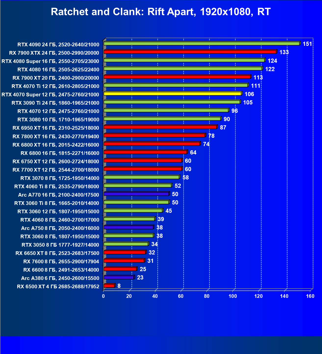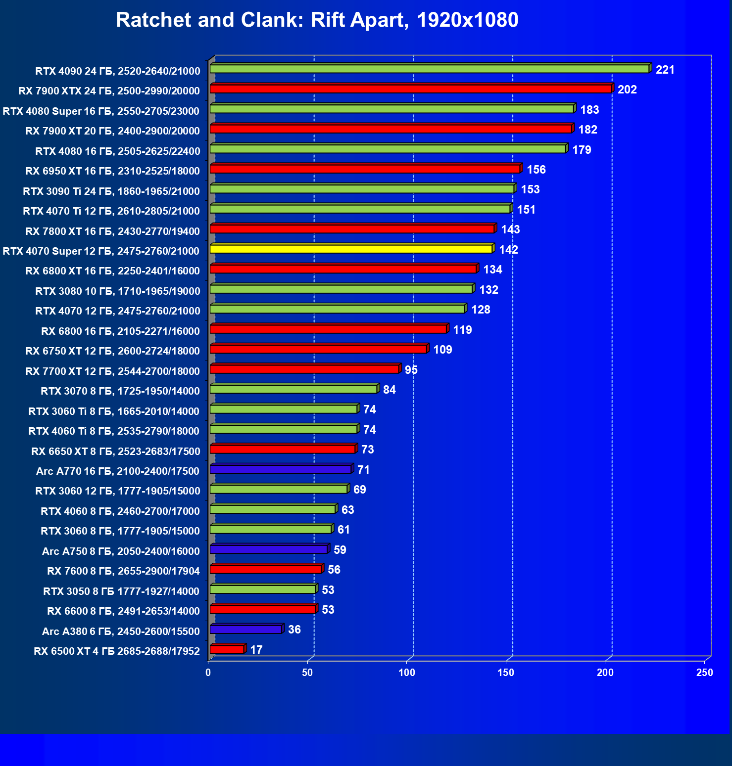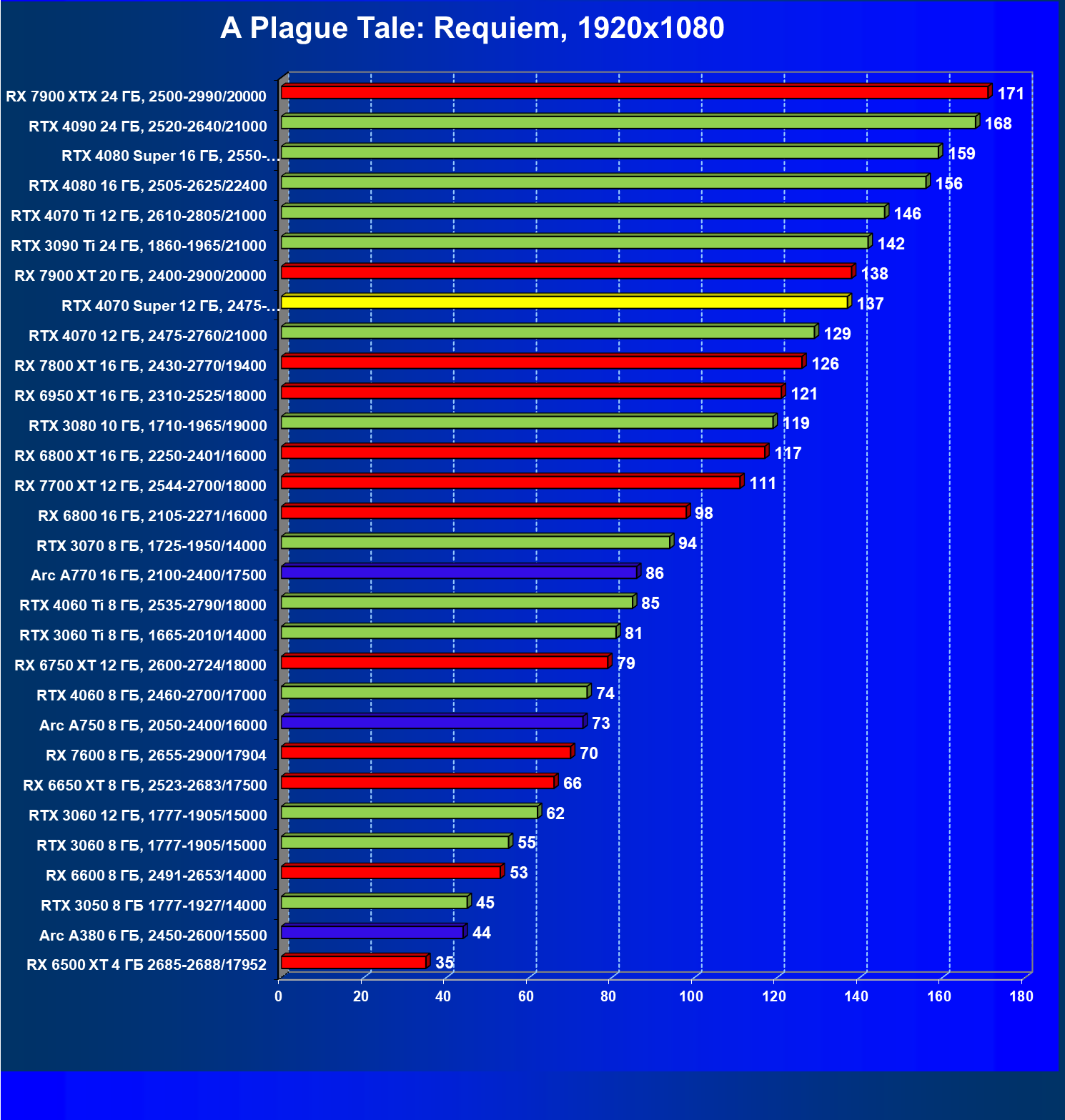 В играх с трассировкой лучей и технологиями масштабирования GeForce RTX 4070 Super опережает предшественника GeForce RTX 4070 в среднем на 13%, при этом отставая от GeForce RTX 4070 Ti на 9,5%, то есть также находится ближе к последнему. Все конкуренты компании AMD сильно отстают. Совершенно неудивительно, что мировые цены на Radeon RX 7900 XTX пошли вниз (лишь на отечественном рынке всё еще пытаются сбывать такие карты по ценам около 100 тысяч рублей и выше). Да, в классических играх Radeon RX 7900 XTX в ряде случаев оказывается быстрее, чем даже GeForce RTX 4080 Super, но кто сейчас будет покупать флагманский ускоритель с огромным объемом памяти и не использовать современные технологии типа RT?