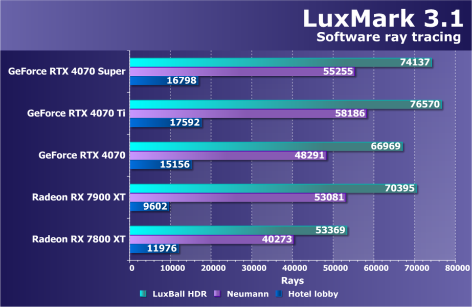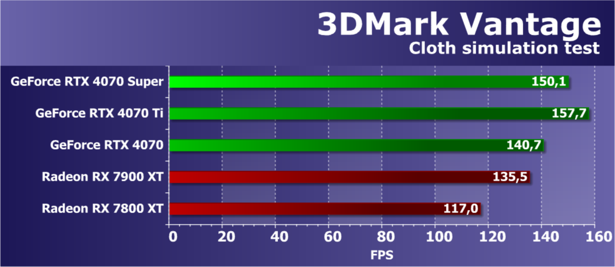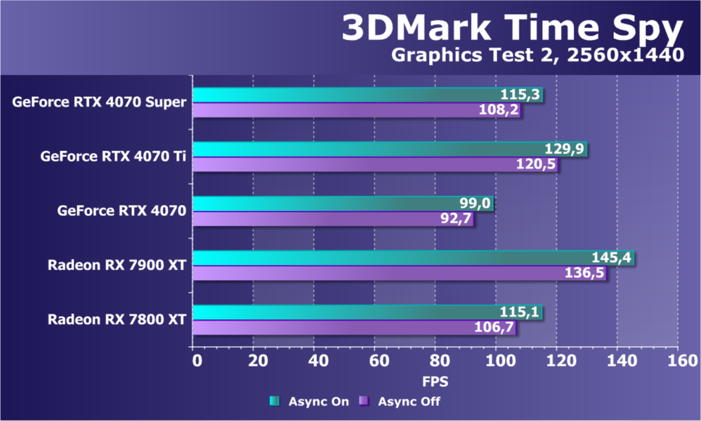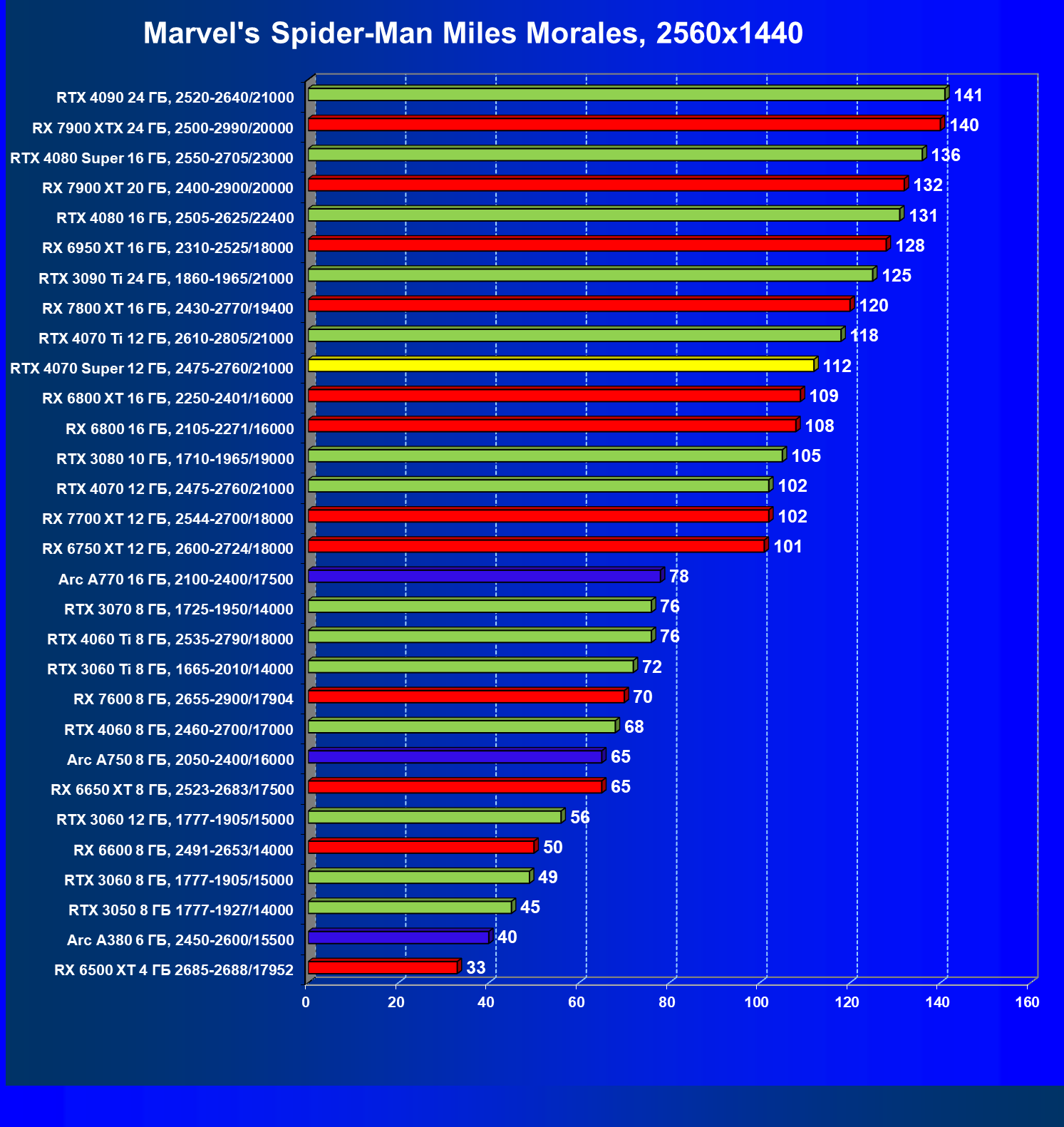 В играх с трассировкой лучей и технологиями масштабирования GeForce RTX 4070 Super опережает предшественника GeForce RTX 4070 в среднем на 13%, при этом отставая от GeForce RTX 4070 Ti на 9,5%, то есть также находится ближе к последнему. Все конкуренты компании AMD сильно отстают. Совершенно неудивительно, что мировые цены на Radeon RX 7900 XTX пошли вниз (лишь на отечественном рынке всё еще пытаются сбывать такие карты по ценам около 100 тысяч рублей и выше). Да, в классических играх Radeon RX 7900 XTX в ряде случаев оказывается быстрее, чем даже GeForce RTX 4080 Super, но кто сейчас будет покупать флагманский ускоритель с огромным объемом памяти и не использовать современные технологии типа RT?