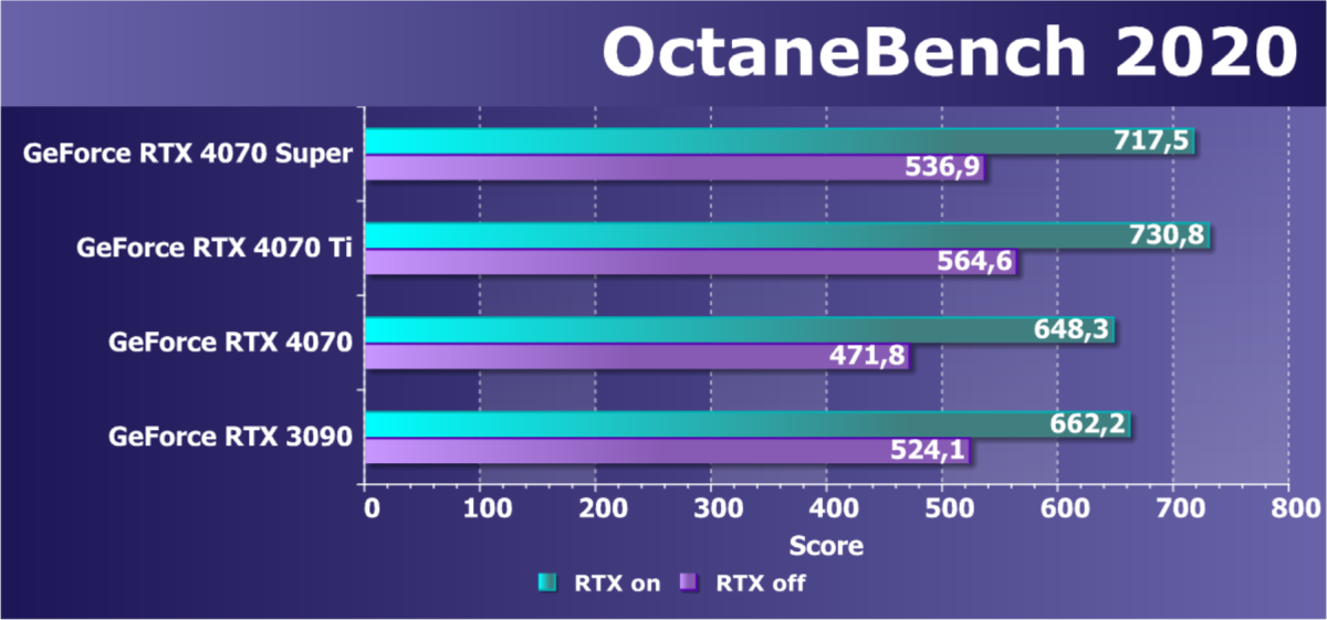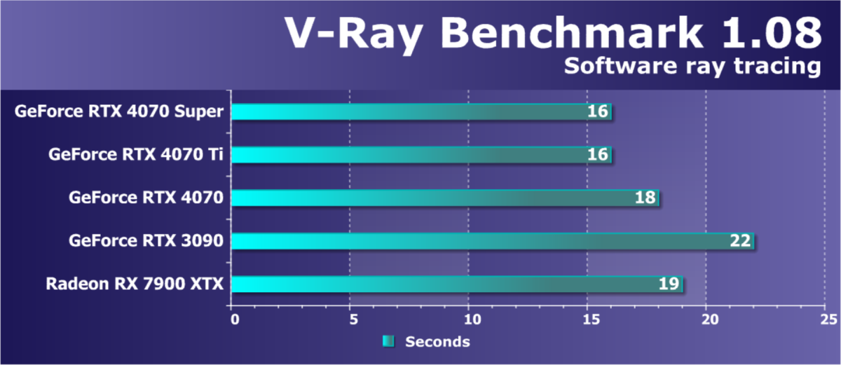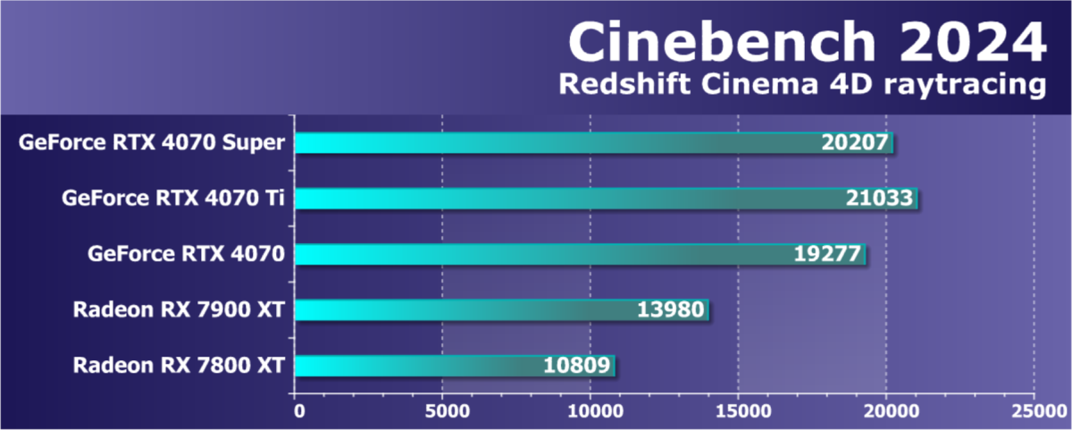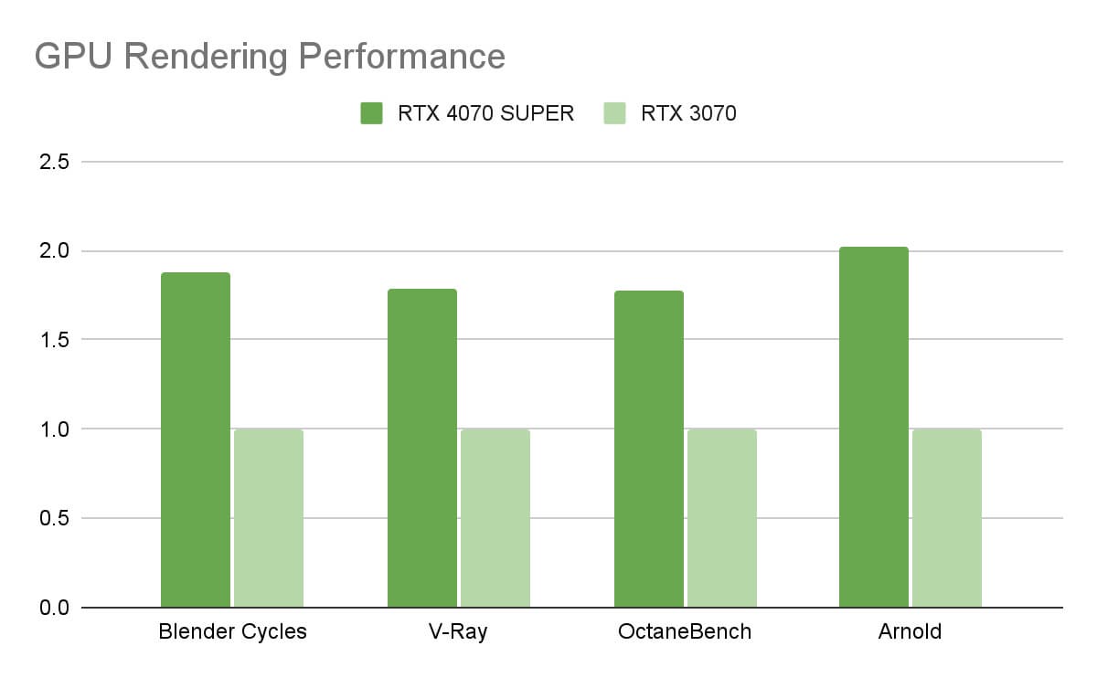 GeForce RTX 4070 Super подходит и для применения в профессиональных задачах по созданию цифрового контента: новинка достаточно производительна для своей цены, имеет тензорные ядра, которые способны ускорять инструменты на основе искусственного интеллекта, а также аппаратные блоки для ускорения трассировки лучей, работа которых поддерживается в таких 3D-пакетах и движках, как Blender Cycles, Redshift, V-Ray, Octane и других. Всё это позволит ускорить визуализацию сложных сцен и эффективнее работать над проектами по сравнению с аналогичной по позиционированию видеокартой из предыдущего поколения — GeForce RTX 3070 в таких задачах медленнее в 1,7-2 раза, по данным Nvidia: