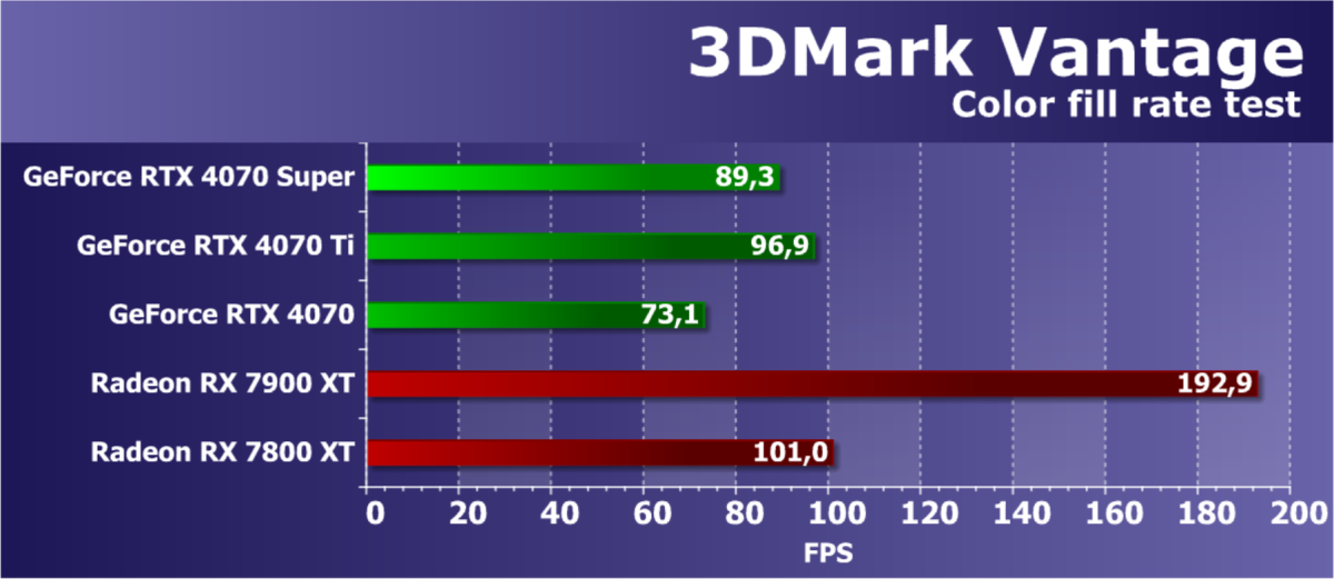 Это очень близко к тому, что было в GeForce RTX 4070 Ti, за исключением 4 мультипроцессоров и мелких блоков, входящих в их состав. По сравнению с GeForce RTX 4070 это более чем 20% прироста, и мы еще не учитываем дополнительные блоки ROP и больший объем L2-кэша. К слову, подсистема памяти у Super-модели такая же, что и у GeForce RTX 4070 Ti, она включает 7168 КБ L1-кэша и 48 МБ L2-кэша. Большой объем кэш-памяти положительно сказывается во многих сложных вычислительных задачах, вроде аппаратной трассировки лучей и растеризации — в играх и тестах с большим количеством полупрозрачных частиц. Память применяется также уже знакомая нам по оригинальной модели — GDDR6X с эффективной частотой в 21 ГГц. С учетом 192-битной шины пропускная способность памяти составляет 504 ГБ/с.