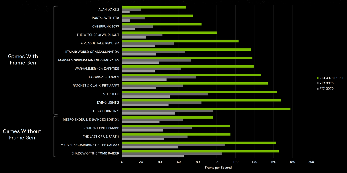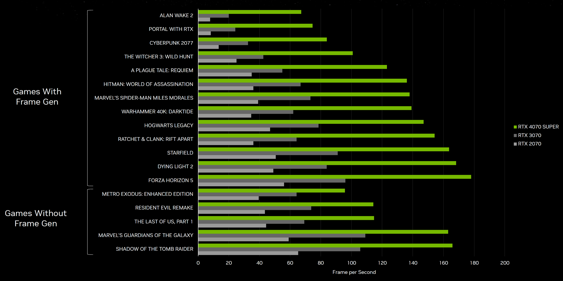 Подобное обновление линейки видеокарт между новыми поколениями выгодно не только самой Nvidia, но и их партнерам, выпускающим видеокарты, которые могут теперь продвигать уже новые модели, а не просто разогнанные старые. Более выгодных ценовых предложений на рынке становится больше, и видеокарты Super в целом предназначены скорее для тех, у кого установлен GPU из довольно старых поколений, явно не GeForce RTX 40. Обладатели более старых решений вполне могут захотеть провести модернизацию, увидев более привлекательные Super-варианты. Ведь та же GeForce RTX 4070 Super по данным самой Nvidia обеспечивает значительный прирост чистой производительности до уровня GeForce RTX 3090, и это очень хорошая прибавка.