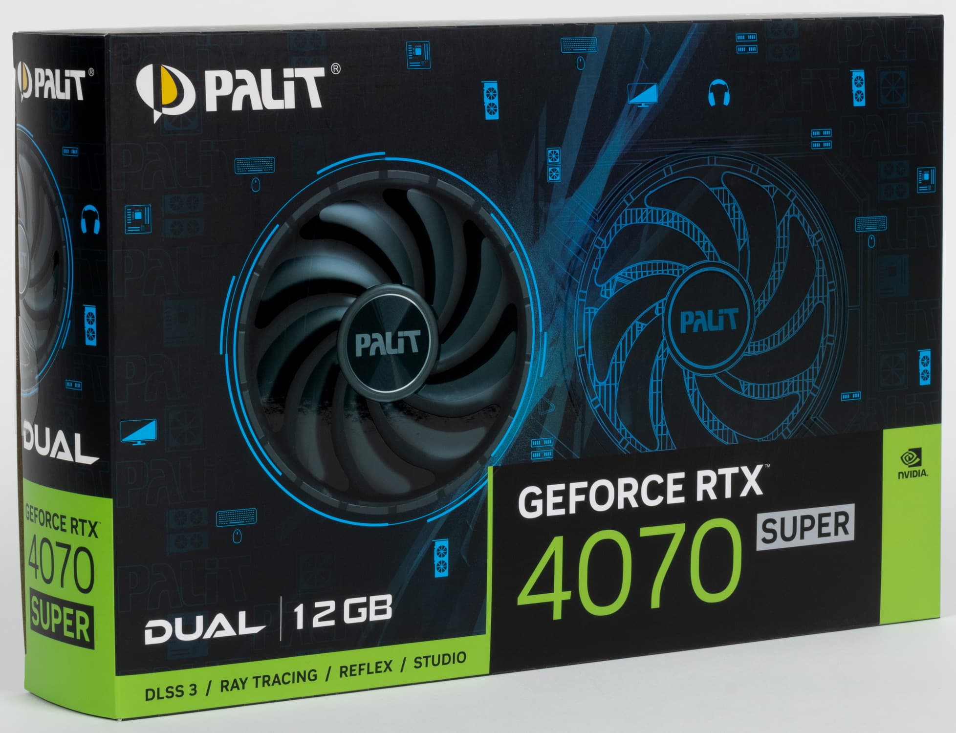 Кроме NVEnc, в графические процессоры архитектуры Ada включен аппаратный декодер пятого поколения NVDec, который появился в Ampere. Он поддерживает декодирование видеоданных с аппаратным ускорением в форматах: MPEG-2, VC-1, H.264 (AVCHD), H.265 (HEVC), VP8, VP9 и AV1. Также полностью поддерживается и декодирование видеоданных в разрешении 8K при 60 FPS. На этом с теоретической частью мы закончили и переходим к рассмотрению практических особенностей видеокарты GeForce RTX 4070 Super в исполнении компании Palit.