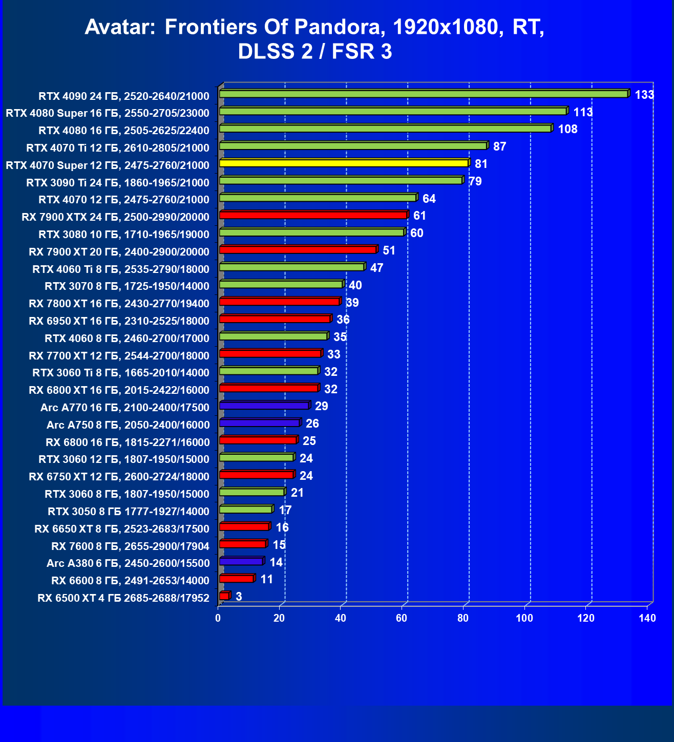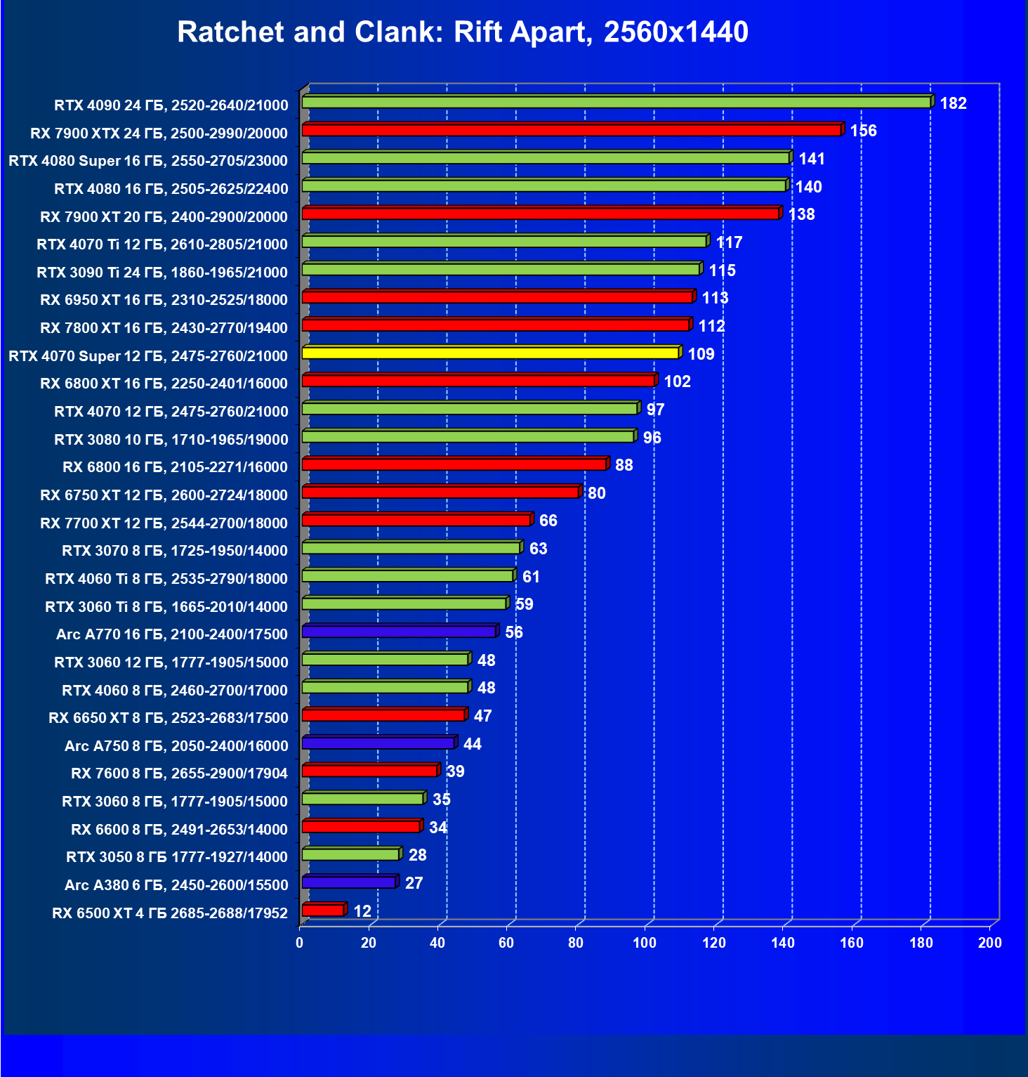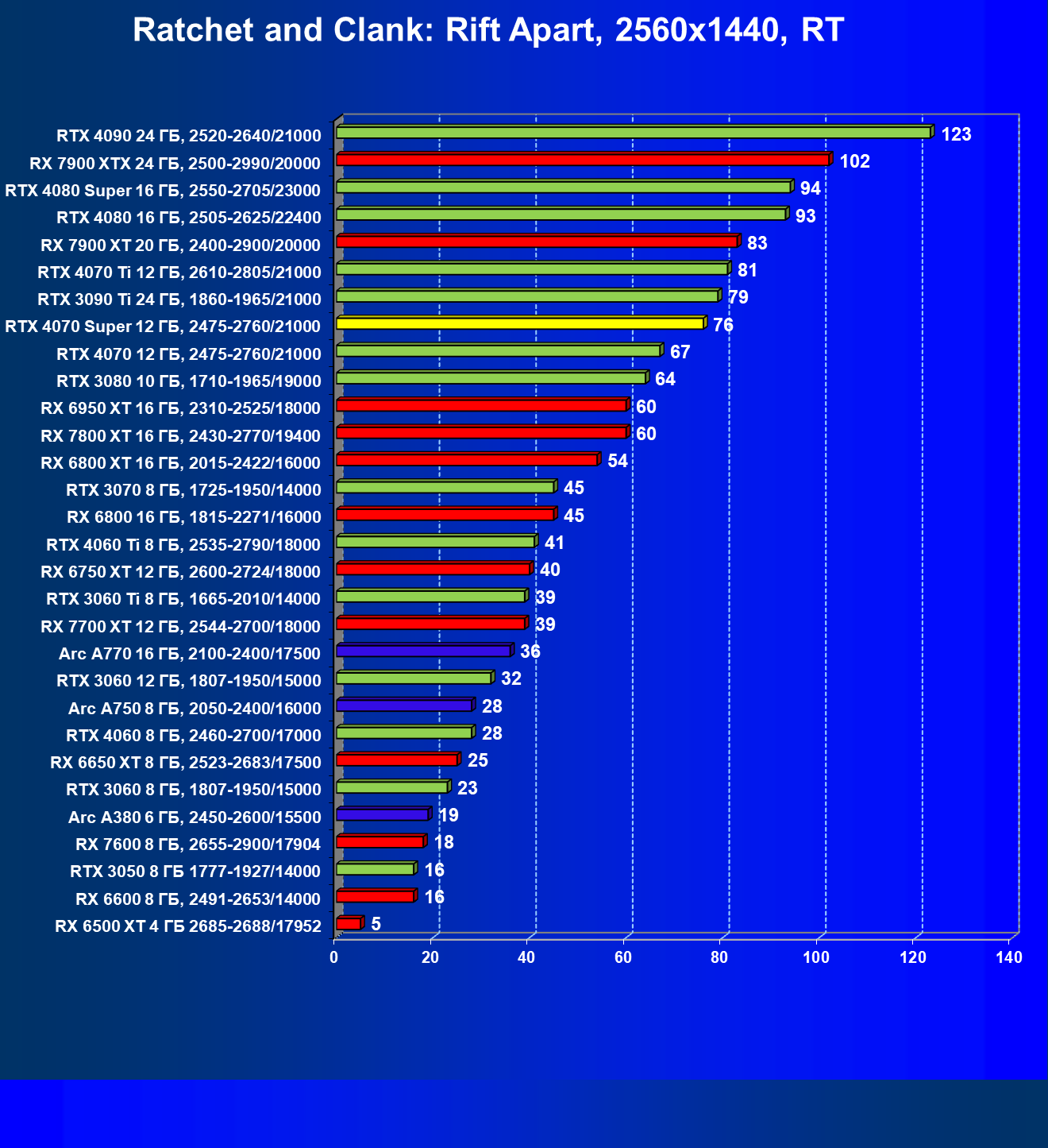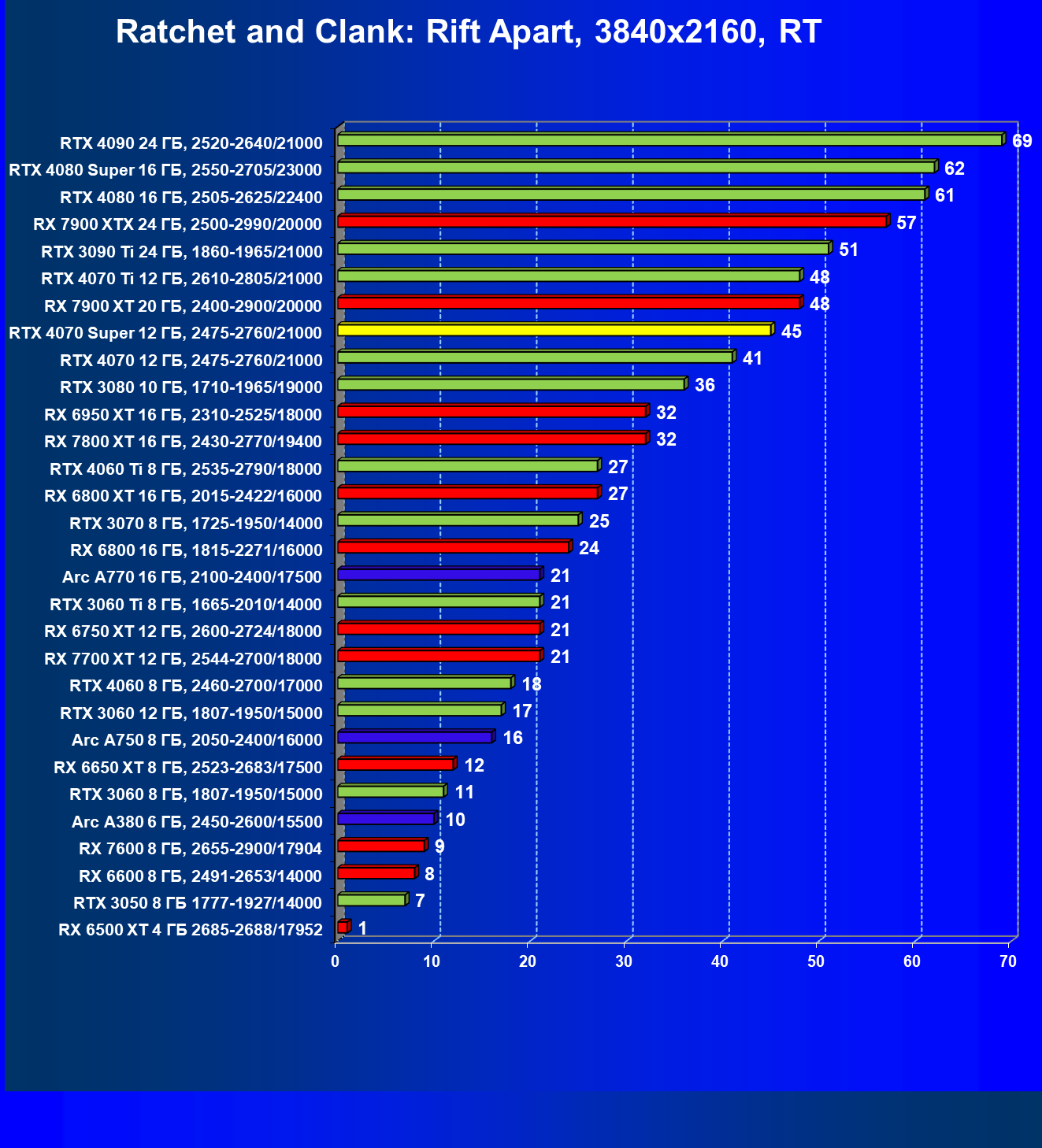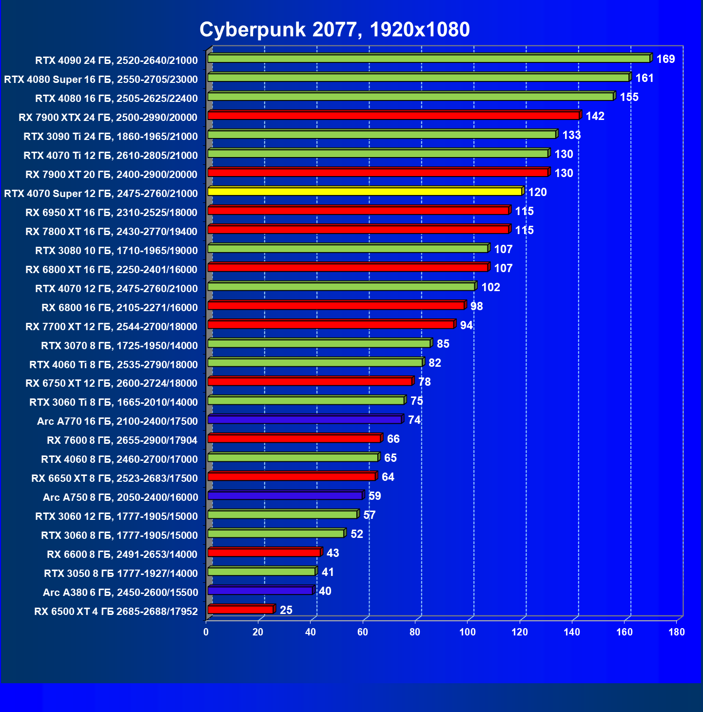 | 19 | RTX 4070 Super 12 ГБ, 2475—2760/21000 | 76 | 569 | 75 000 |