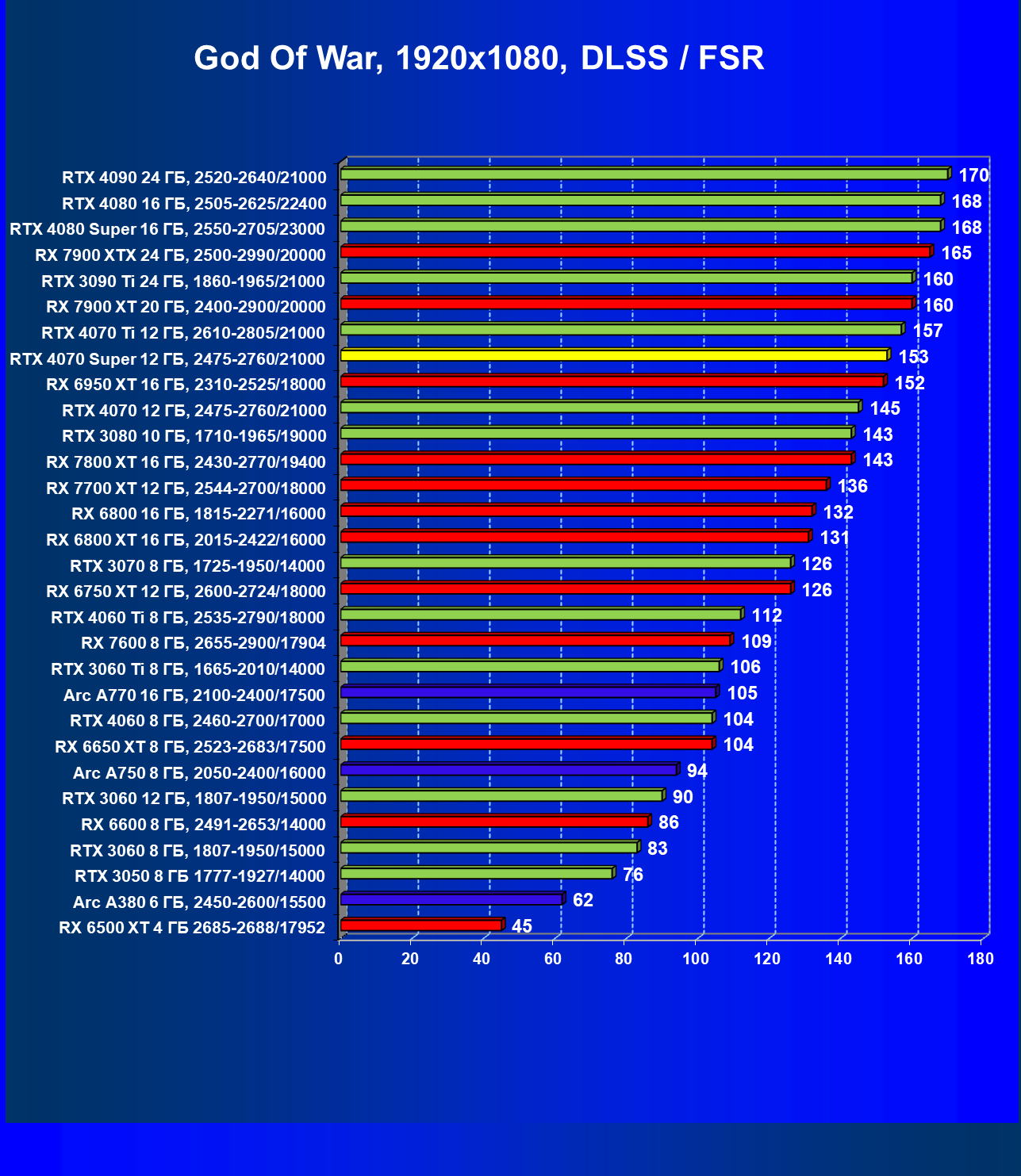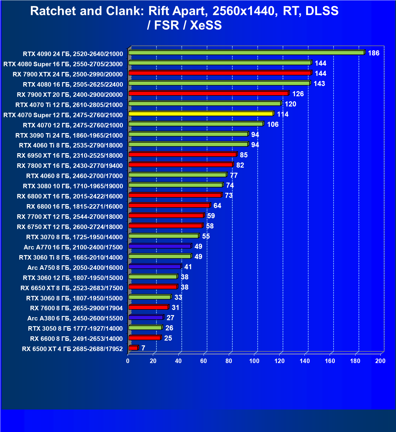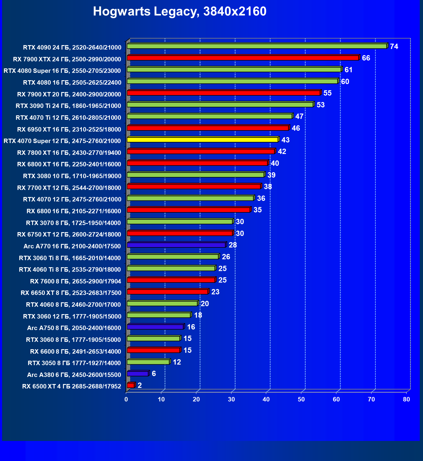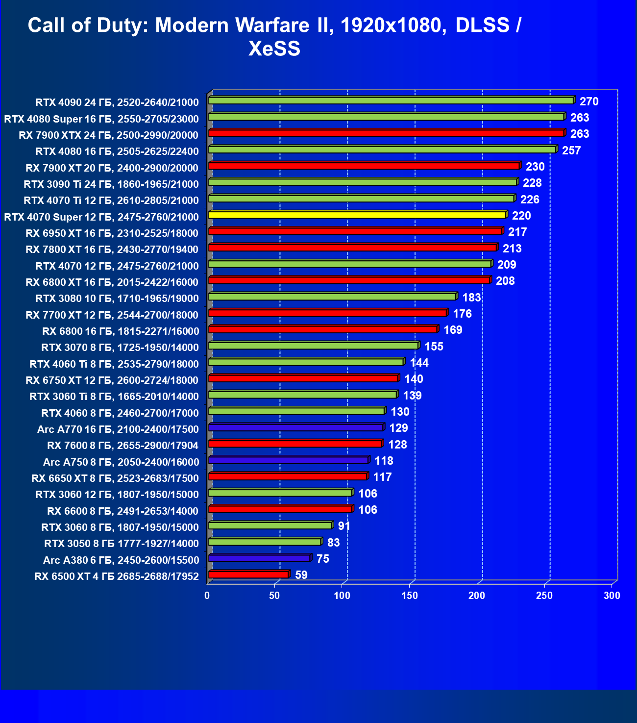 | 19 | RTX 4070 Super 12 ГБ, 2475—2760/21000 | 76 | 569 | 75 000 |