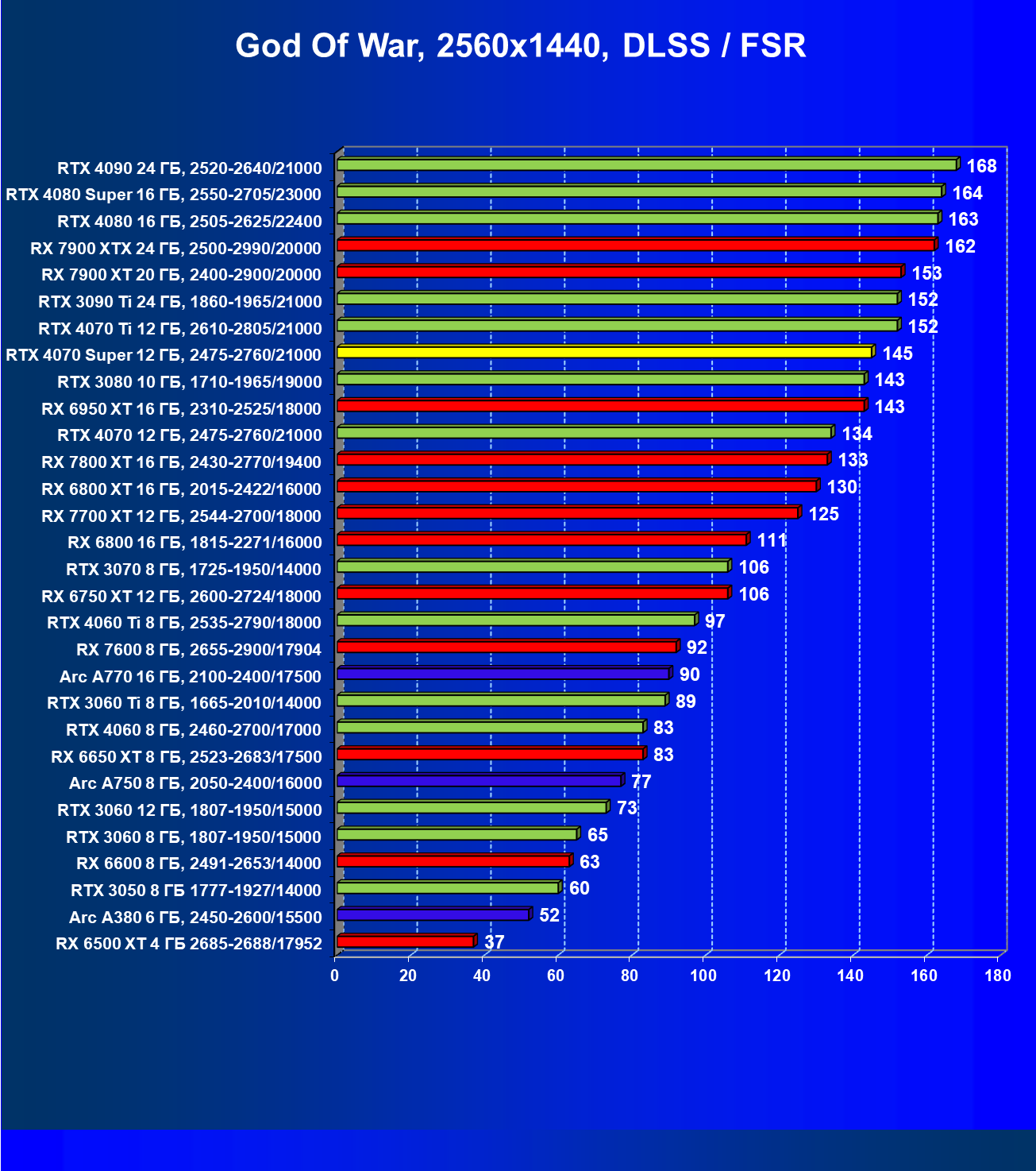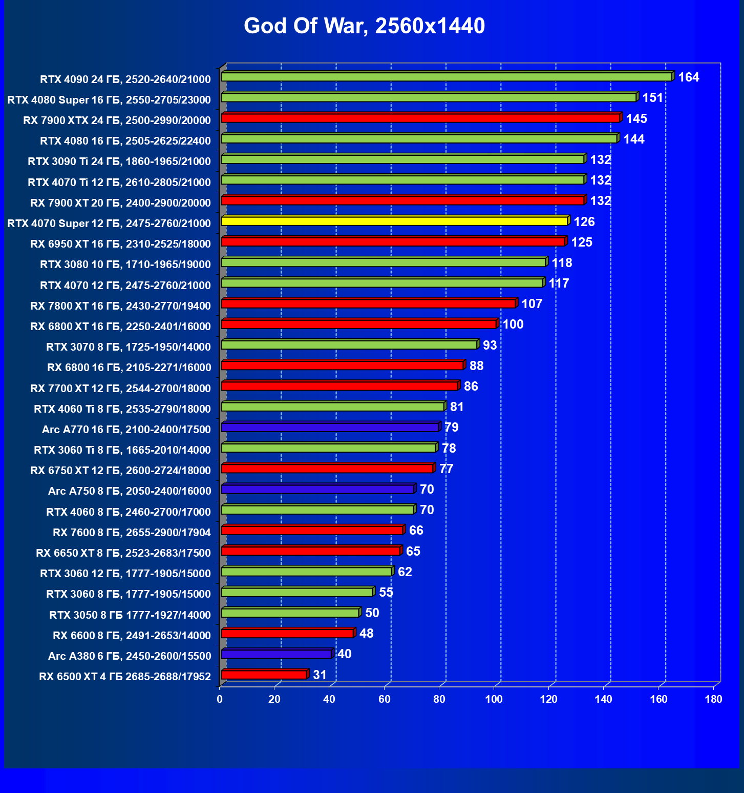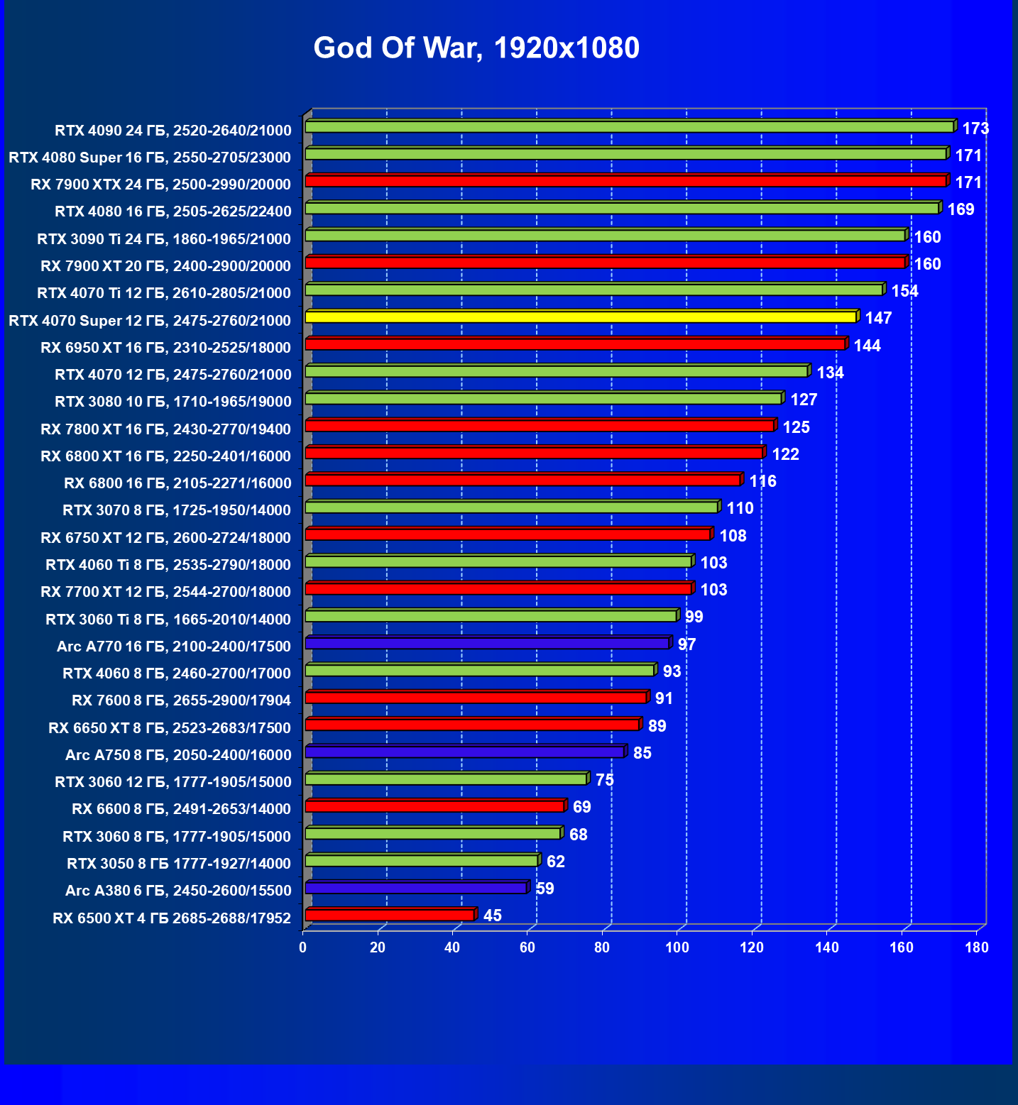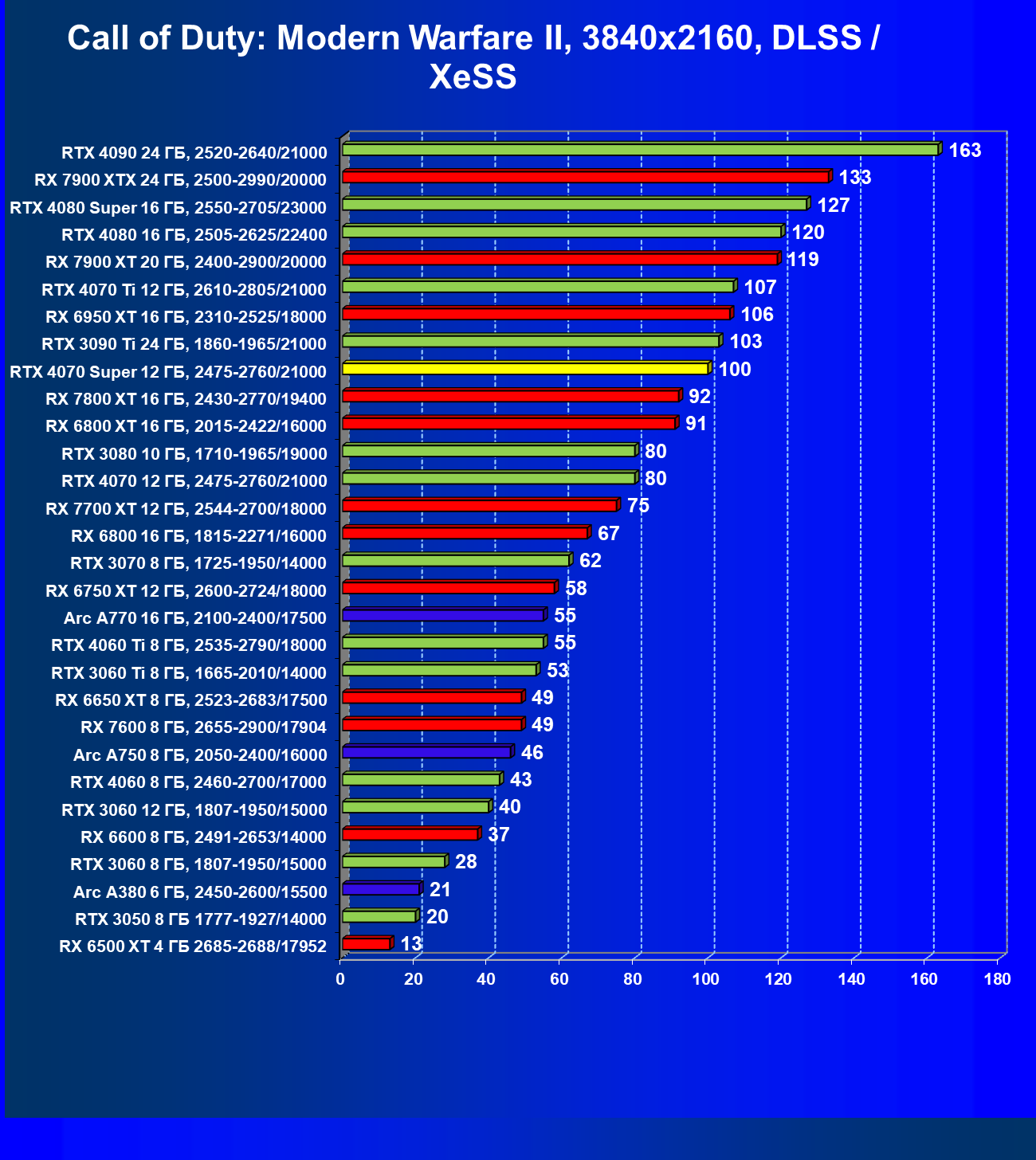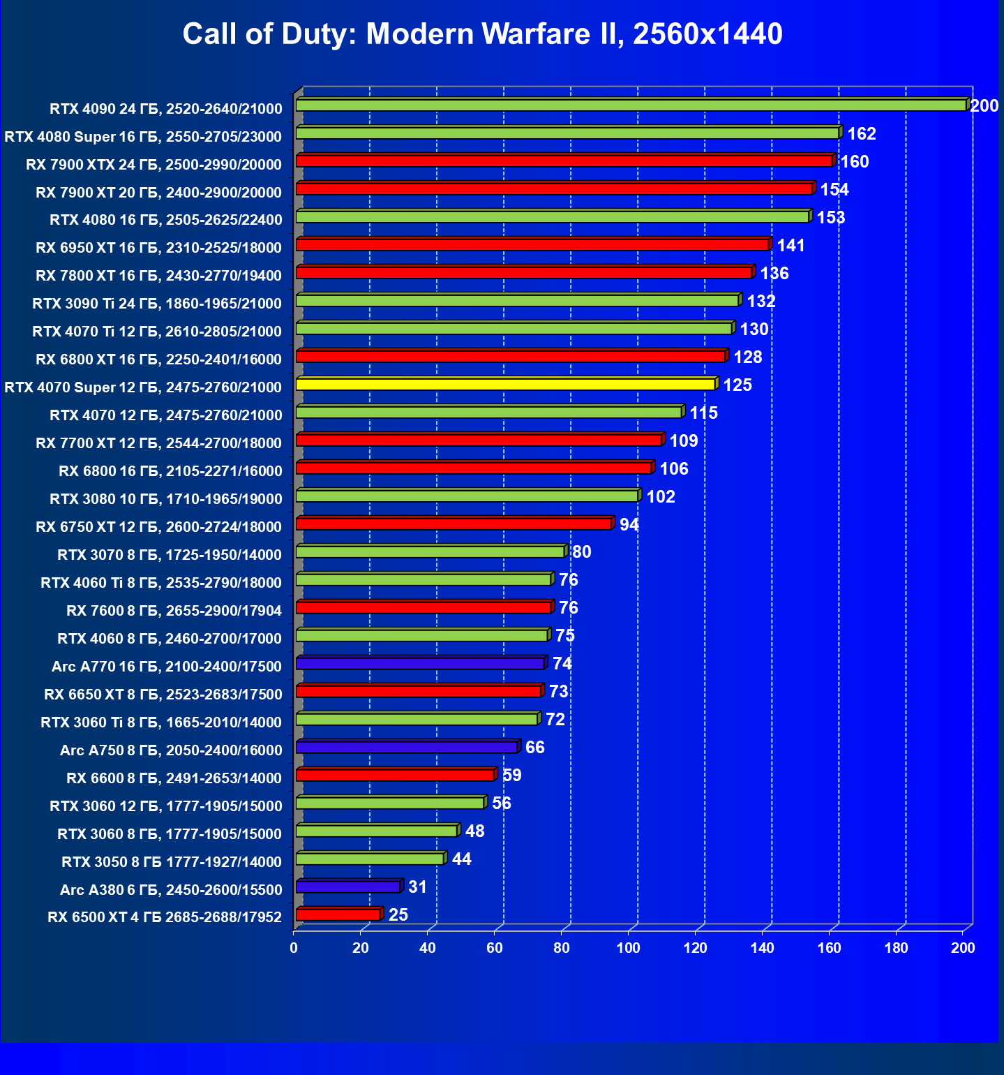 | 19 | RTX 4070 Super 12 ГБ, 2475—2760/21000 | 76 | 569 | 75 000 |