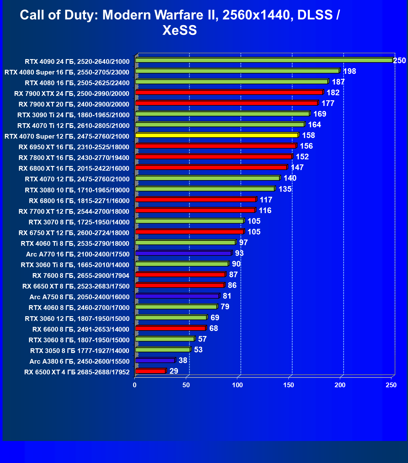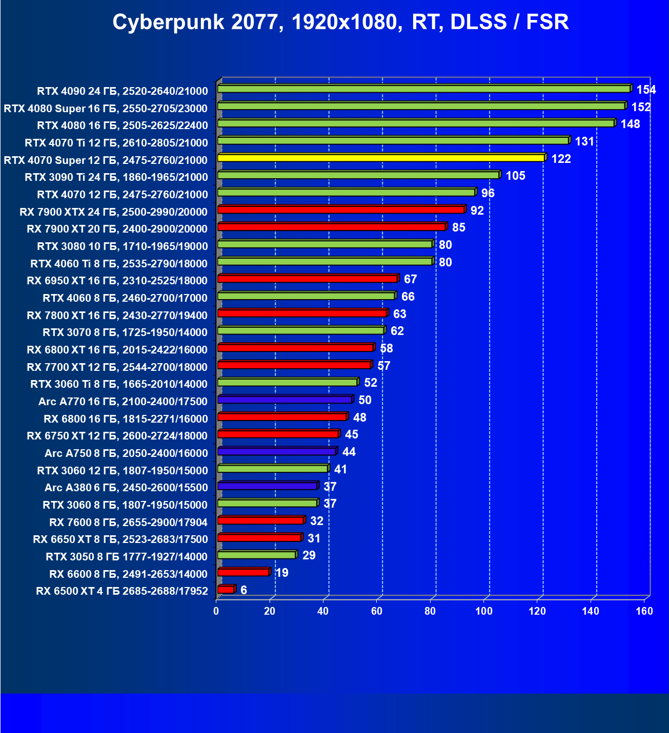 Мы помним, что в классических играх GeForce RTX 4070 Super опережает базовый GeForce RTX 4070 на 14% и отстает от GeForce RTX 4070 Ti на 9%. А что с ценами? Пока GeForce RTX 4070 Super в полтора раза дороже базовой GeForce RTX 4070, но при этом дешевле, чем GeForce RTX 4070 Ti, на... те же 9%. Очевидная диспропорция. Разумеется, для того чтобы GeForce RTX 4070 Super стал более привлекательным, по цене он должен быть примерно посередине между GeForce RTX 4070 и GeForce RTX 4070 Ti. Именно поэтому на сегодня GeForce RTX 4070 Super по привлекательности в классических играх всего лишь на пятом месте, пропустив вперед трех конкурентов AMD. Однако рассматриваемый нами сегодня ускоритель относится к числу весьма мощных, и использовать его без включения RT/DLSS неправильно и даже грешно.