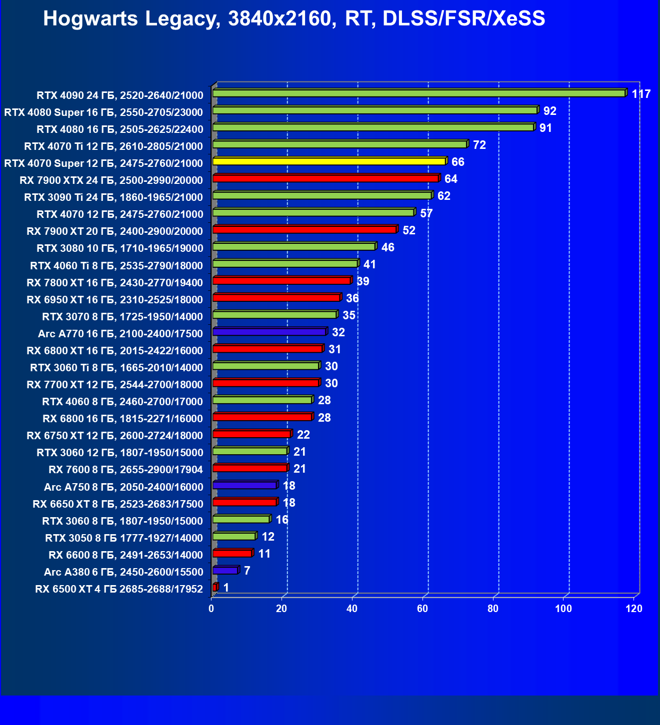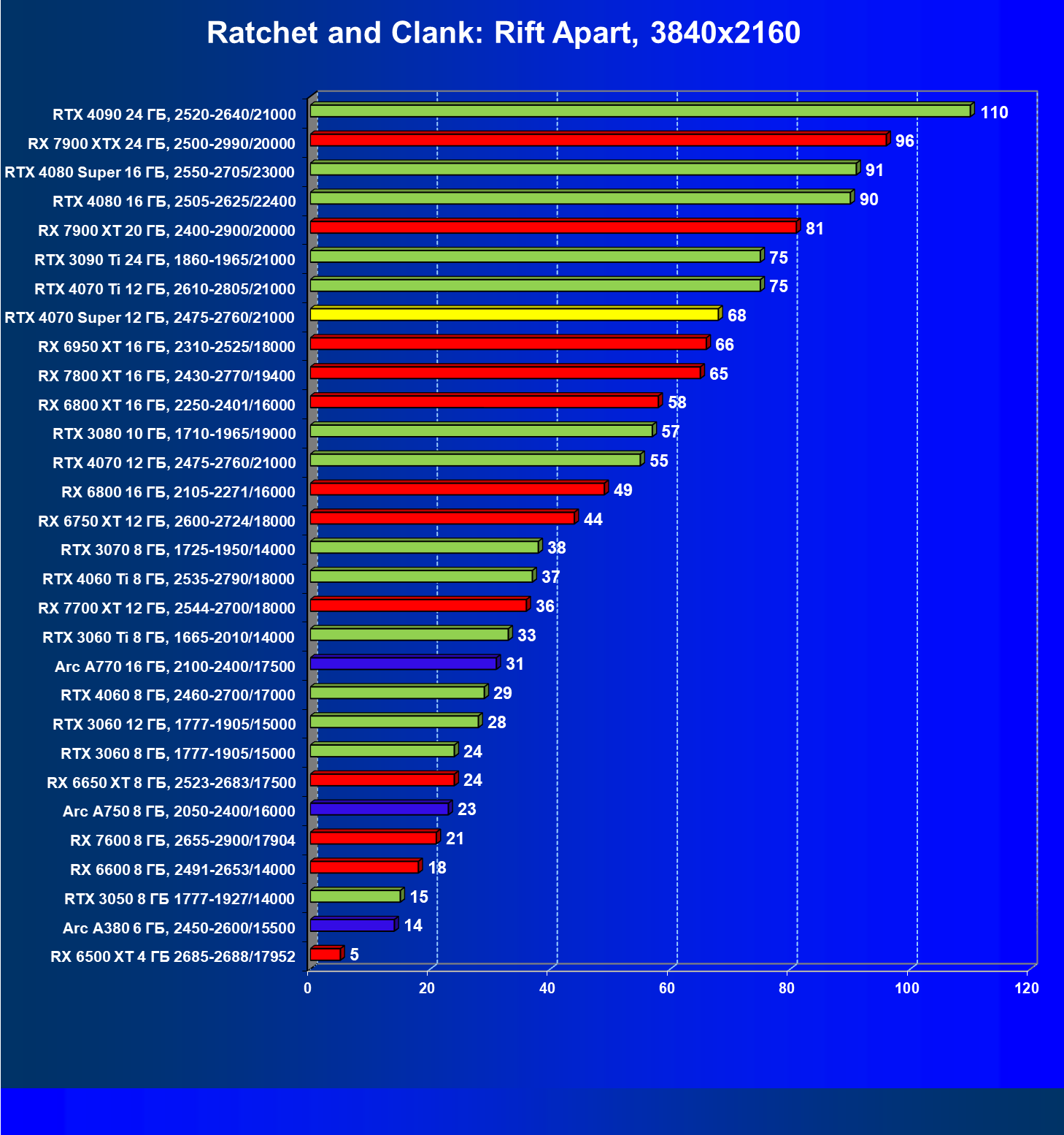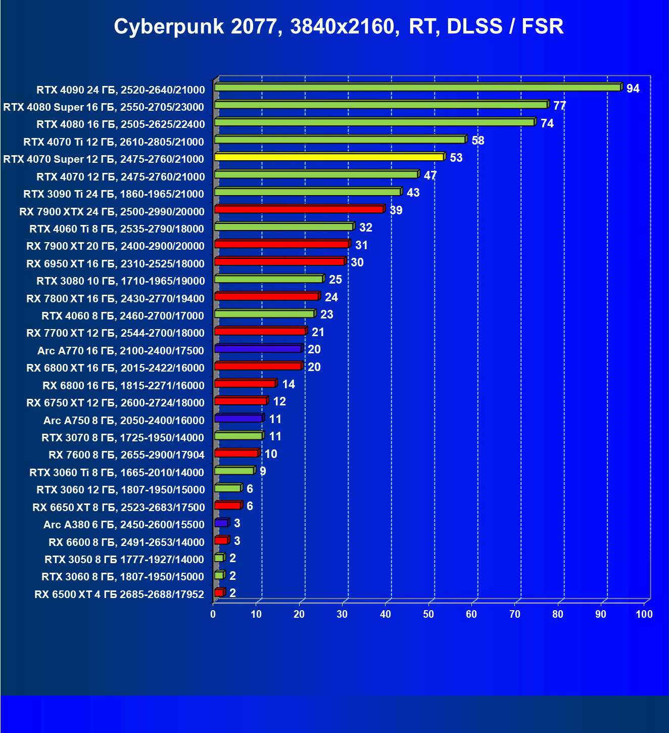 | 22 | RX 7900 XTX 24 ГБ, 2500—2990/20000 | 74 | 730 | 98 000 |