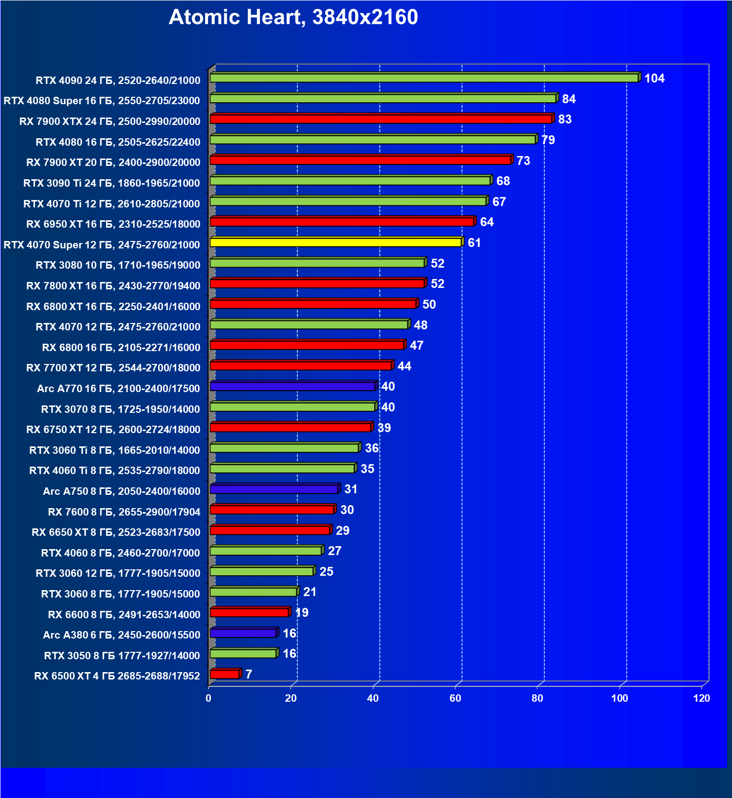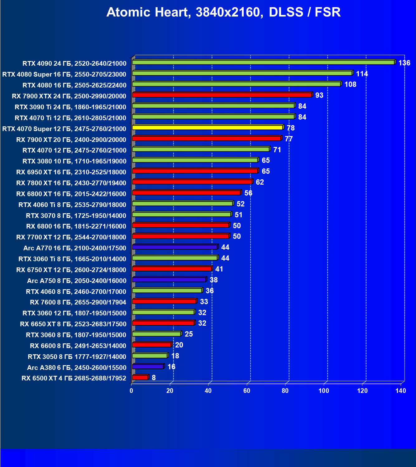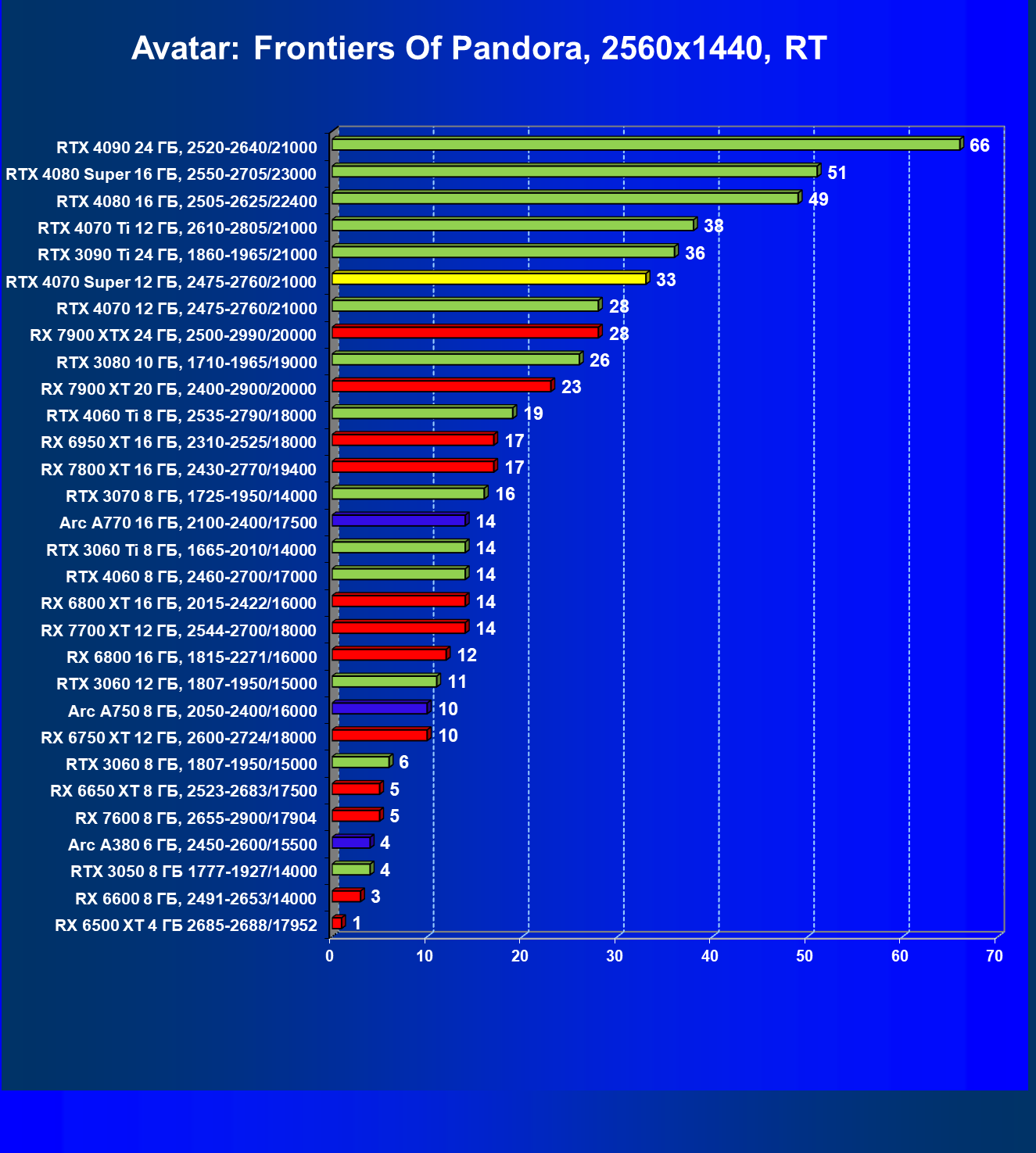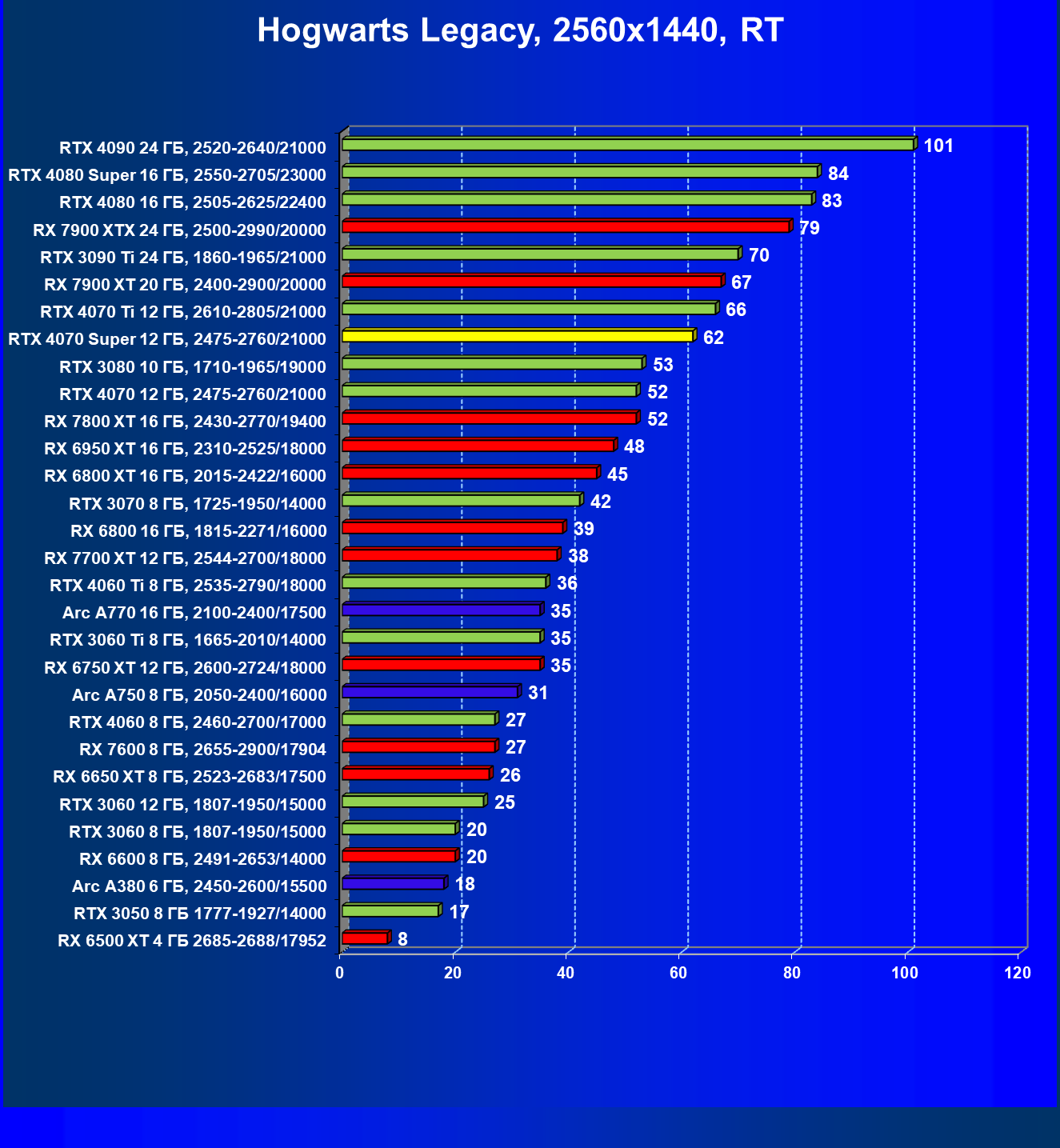 | 22 | RX 7900 XTX 24 ГБ, 2500—2990/20000 | 74 | 730 | 98 000 |