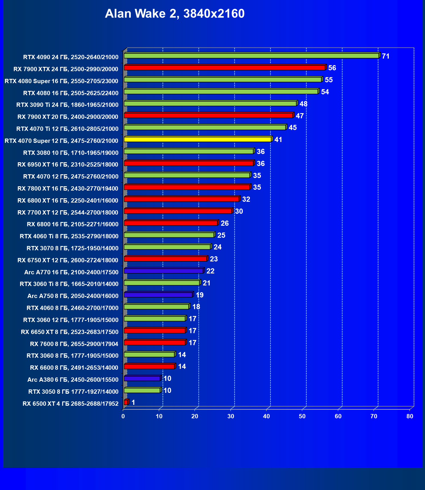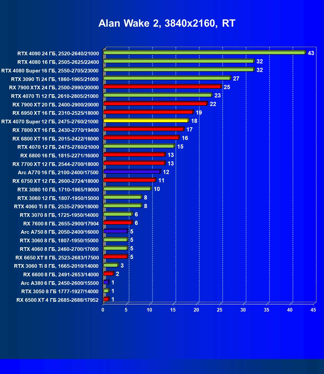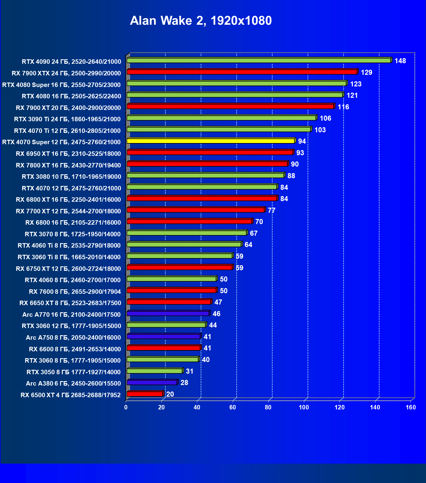 Все (или почти все) игры отлично работают с 12 ГБ при ультра-настройках даже в 4K-разрешении, но в таких условиях и при наличии таких игр, как Alan Wake 2, эти самые 12 ГБ — это прям самый минимум для подобных условий, и 16 ГБ были бы несколько предпочтительнее, особенно с учетом покупки на несколько следующих лет. И если вас всё же напрягает наличие всего лишь 12 ГБ видеопамяти, что в теории действительно может негативно сказаться в перспективе, то будет лучше приобрести видеокарту GeForce RTX 4070 Ti Super, продающуюся на $200 дороже. А GeForce RTX 4070 Super хороша всем (за свои деньги), и ей не хватает только еще чуть-чуть видеопамяти.