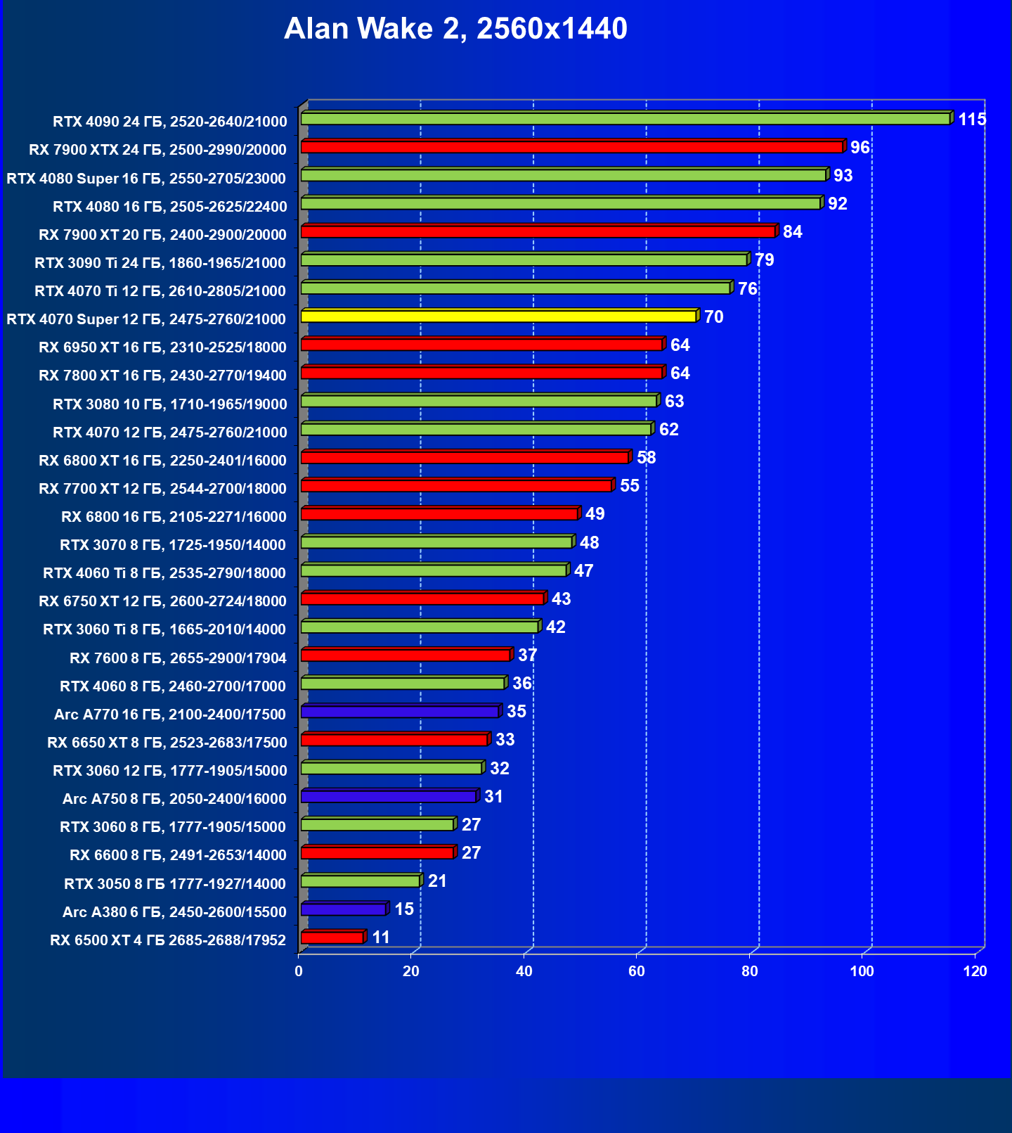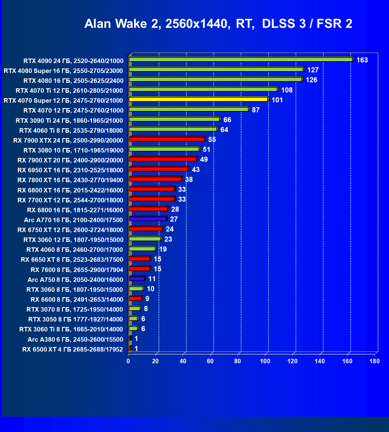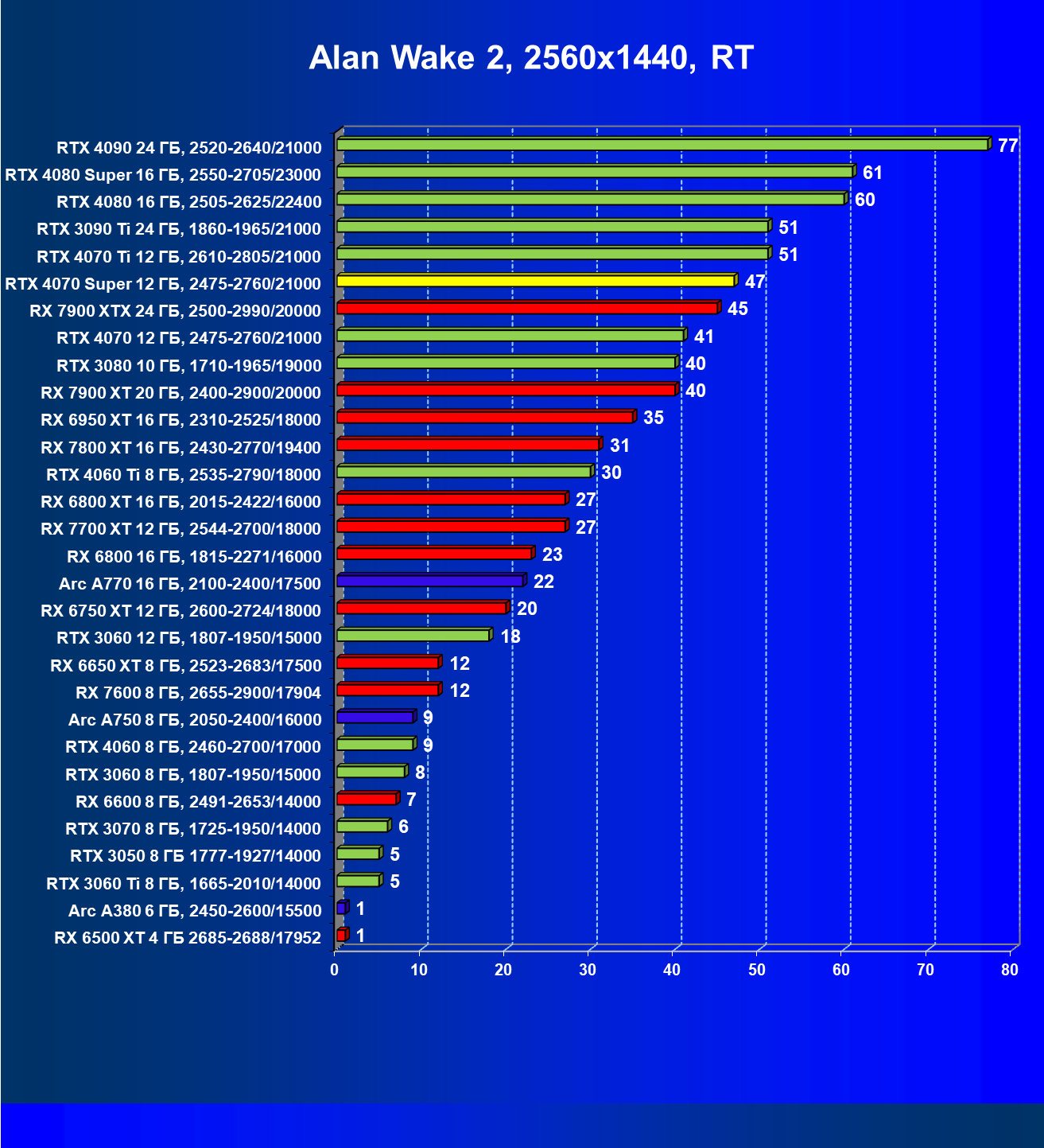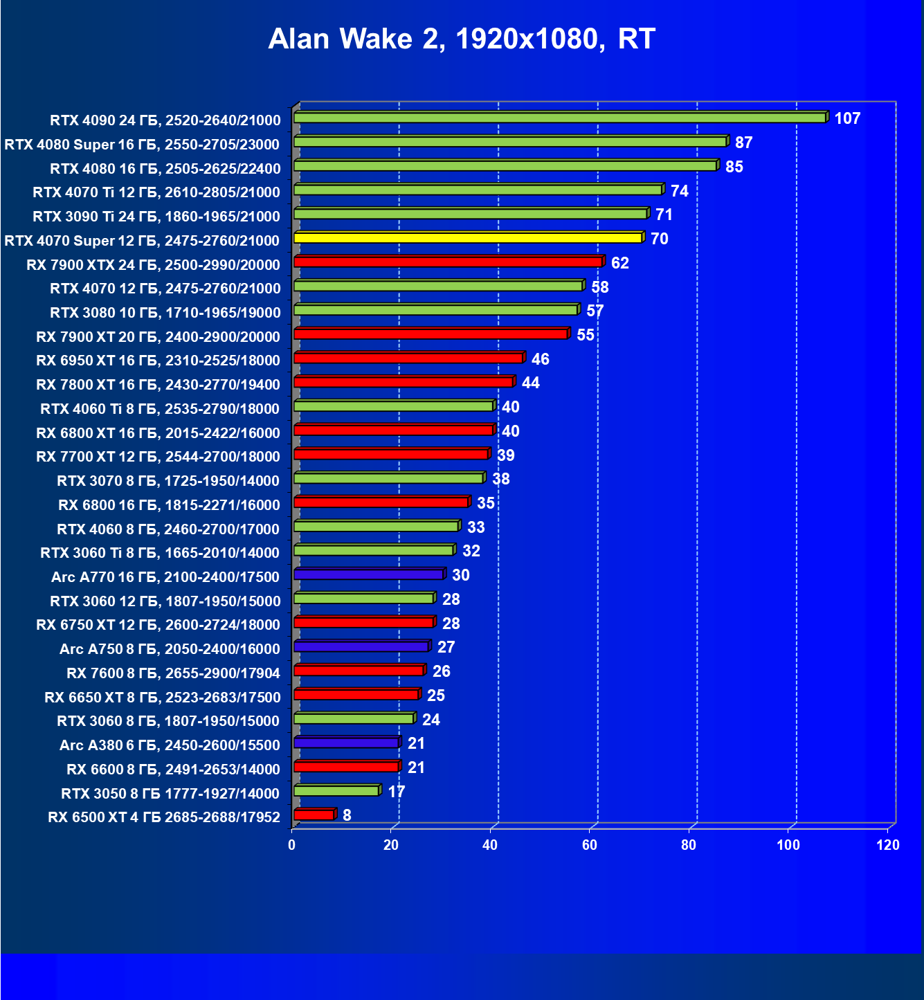Все (или почти все) игры отлично работают с 12 ГБ при ультра-настройках даже в 4K-разрешении, но в таких условиях и при наличии таких игр, как Alan Wake 2, эти самые 12 ГБ — это прям самый минимум для подобных условий, и 16 ГБ были бы несколько предпочтительнее, особенно с учетом покупки на несколько следующих лет. И если вас всё же напрягает наличие всего лишь 12 ГБ видеопамяти, что в теории действительно может негативно сказаться в перспективе, то будет лучше приобрести видеокарту GeForce RTX 4070 Ti Super, продающуюся на $200 дороже. А GeForce RTX 4070 Super хороша всем (за свои деньги), и ей не хватает только еще чуть-чуть видеопамяти.