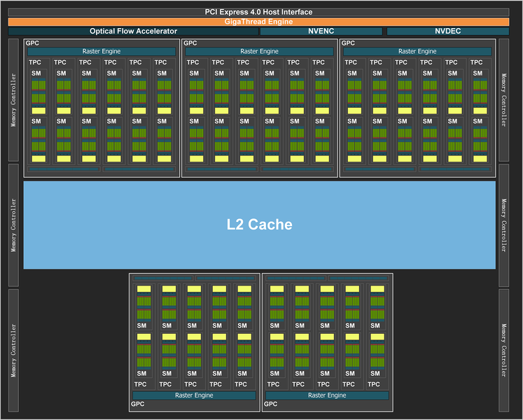 Как и все графические процессоры компании Nvidia, чип AD104 состоит из укрупненных кластеров Graphics Processing Cluster (GPC), которые включают несколько кластеров текстурной обработки Texture Processing Cluster (TPC), содержащих потоковые процессоры Streaming Multiprocessor (SM), блоки растеризации ROP и контроллеры памяти. Кластер GPC самостоятельно производит основные вычисления внутри кластера, и включает свой движок растеризации Raster Engine, пять-шесть кластеров TPC, состоящих из вдвое большего количества мультипроцессоров SM. Рассмотрим блок-схему графического процессора в полной конфигурации:
