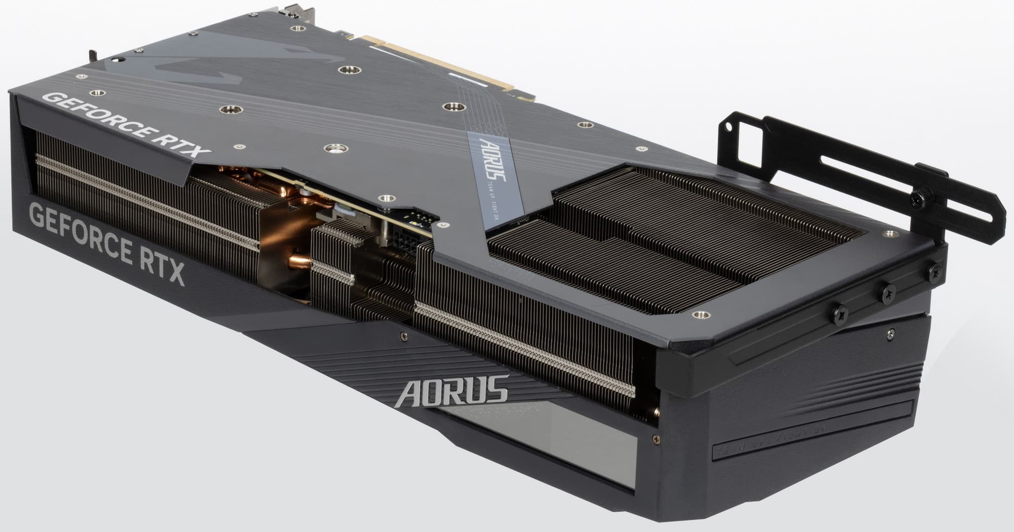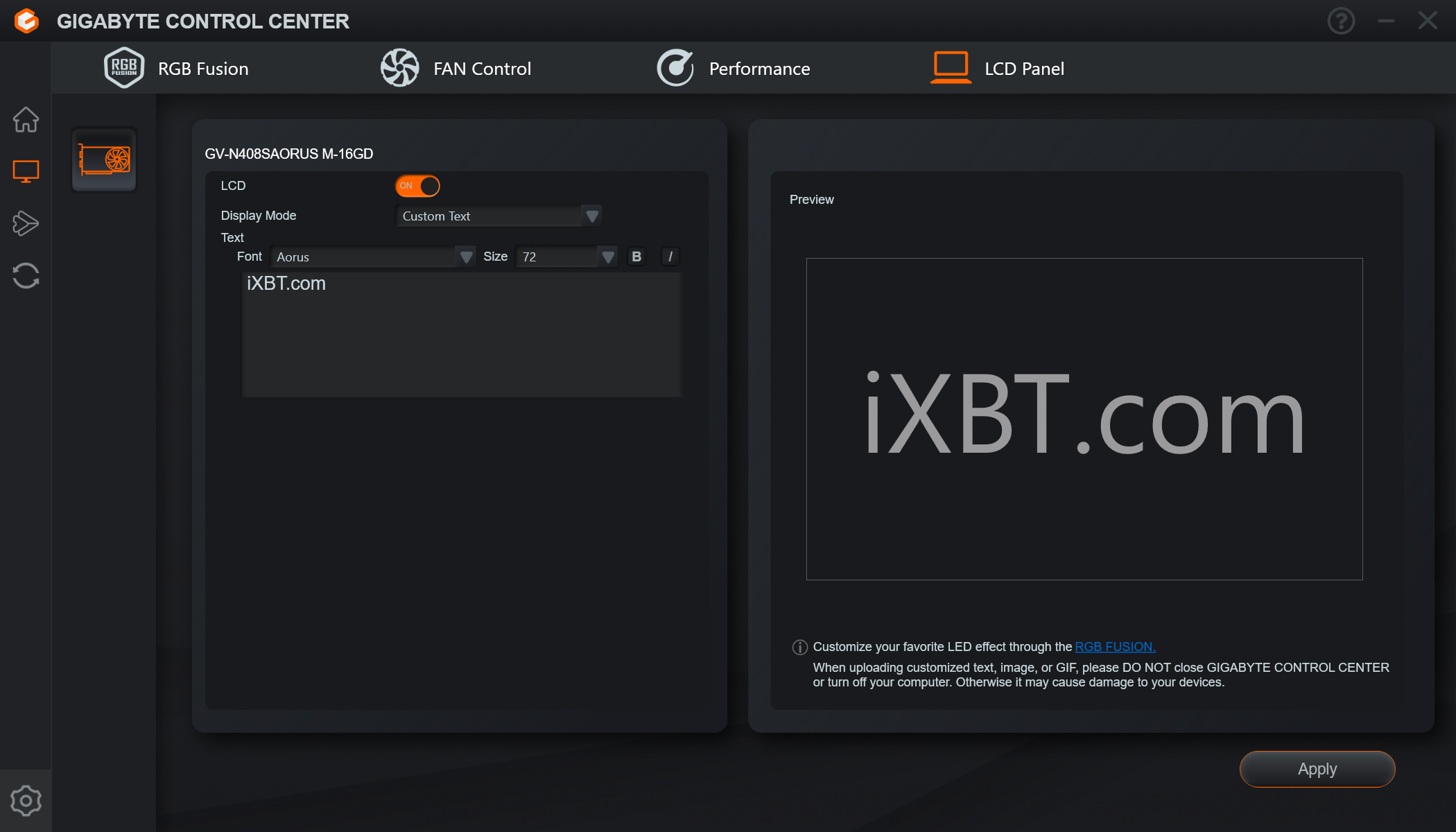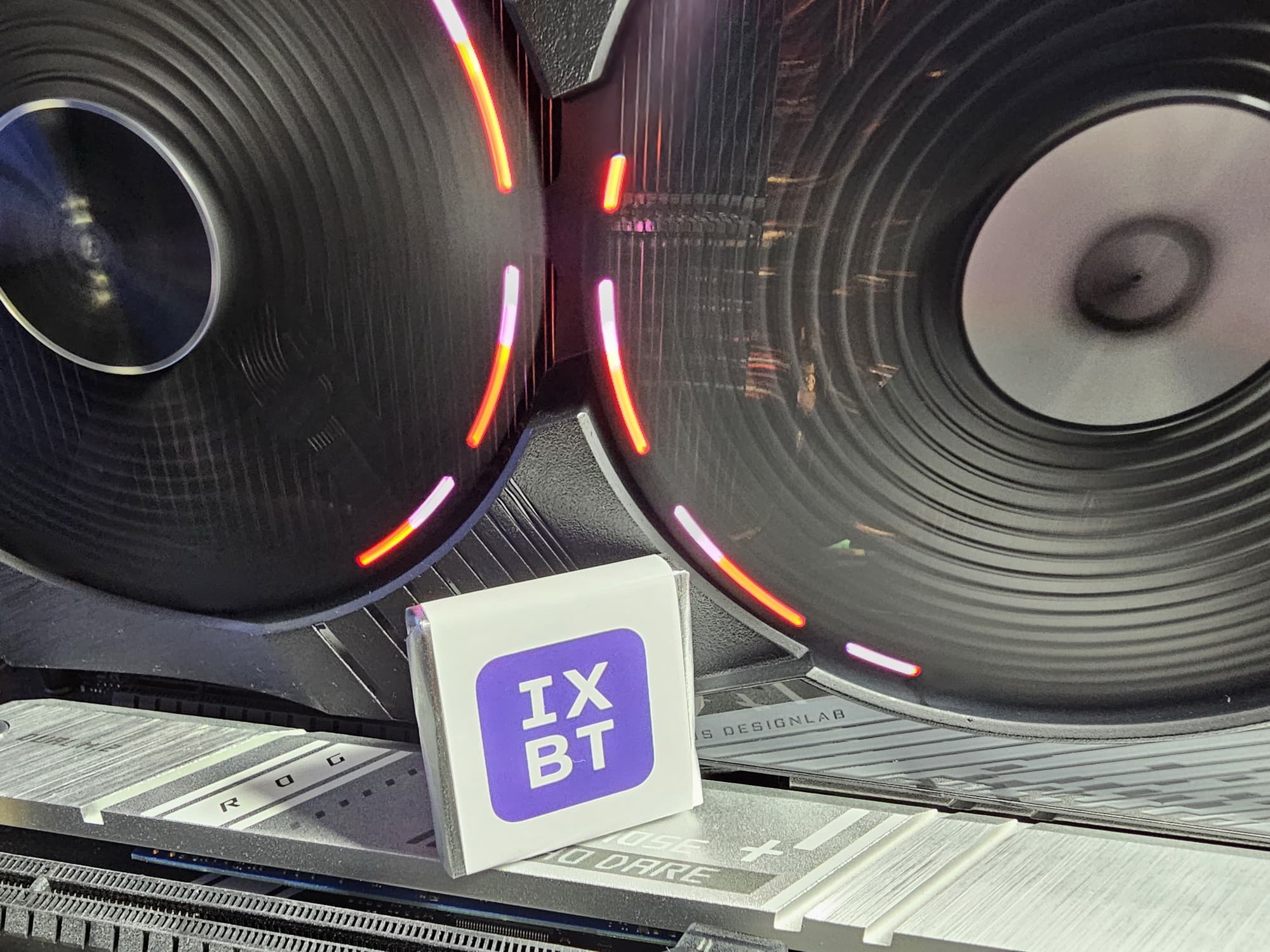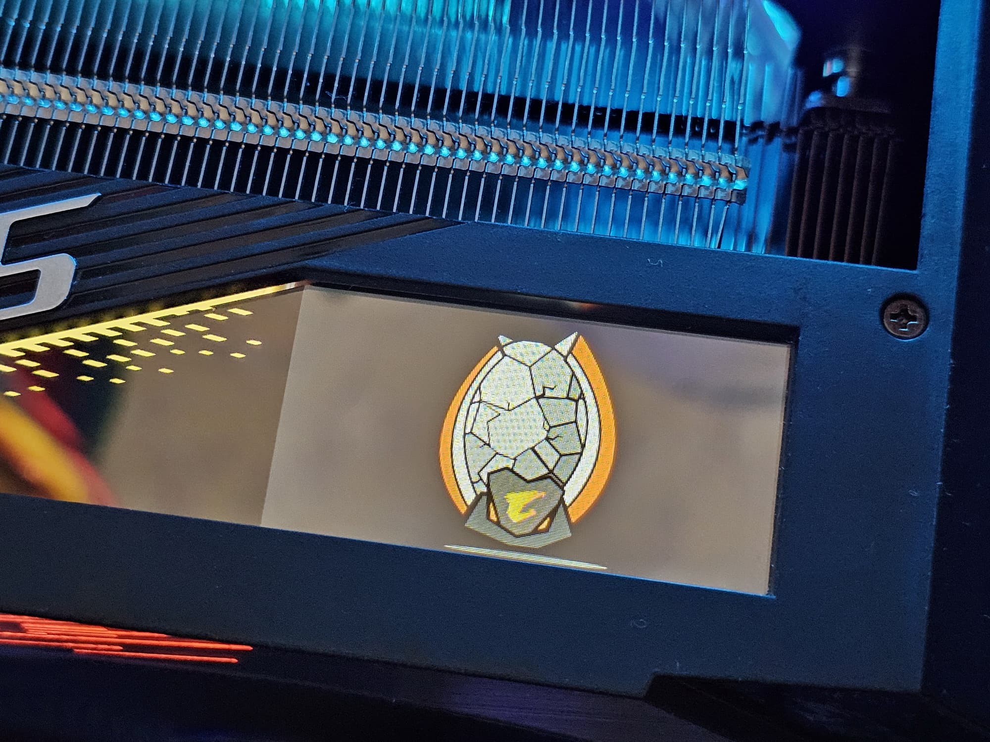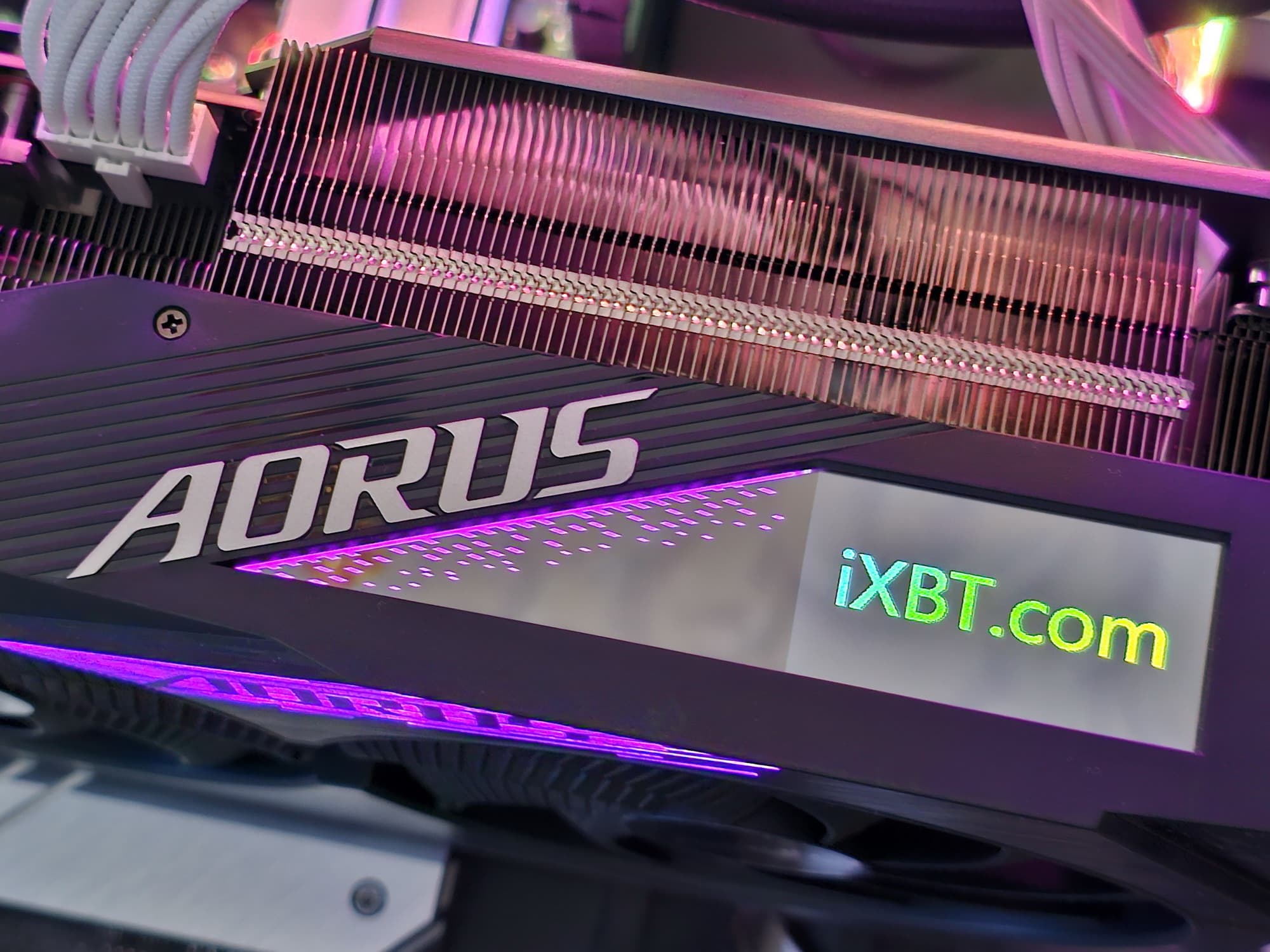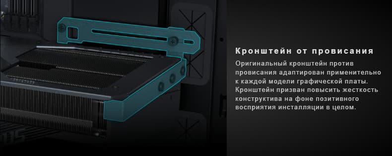 Изюминкой этой карты является оригинальная и стильная подсветка вентиляторов, а также наличие ЖК-экрана на торце, куда полезно выводить данные мониторинга. Также стоит отметить наличие в комплекте поставки надежного (хоть и без изысков) кронштейна, с помощью которого хвостовая часть ускорителя жестко крепится к корпусу ПК, что гарантирует отсутствие провисания тяжелой карты.