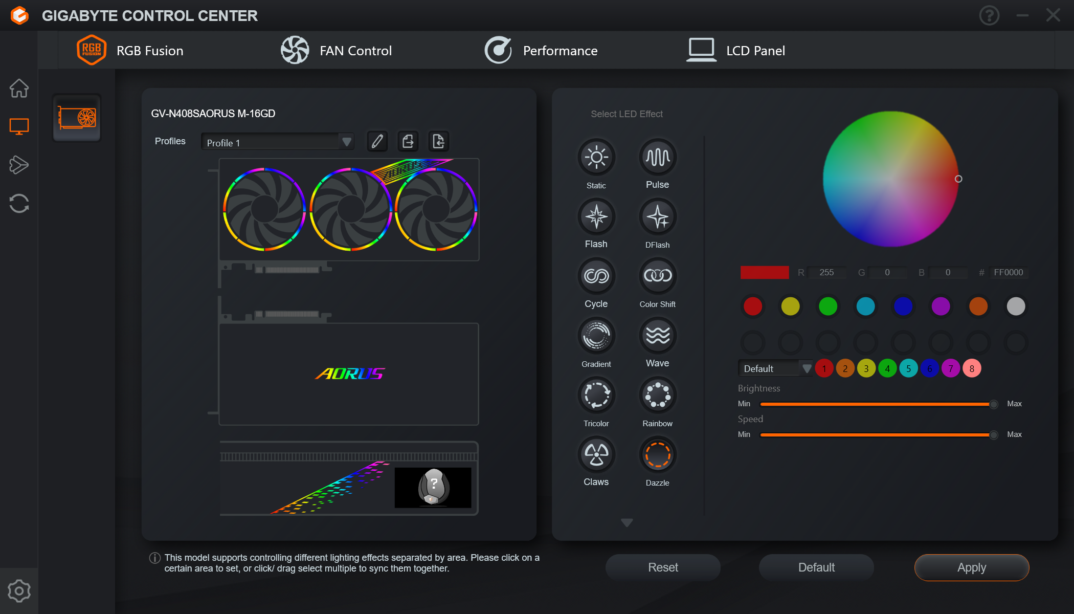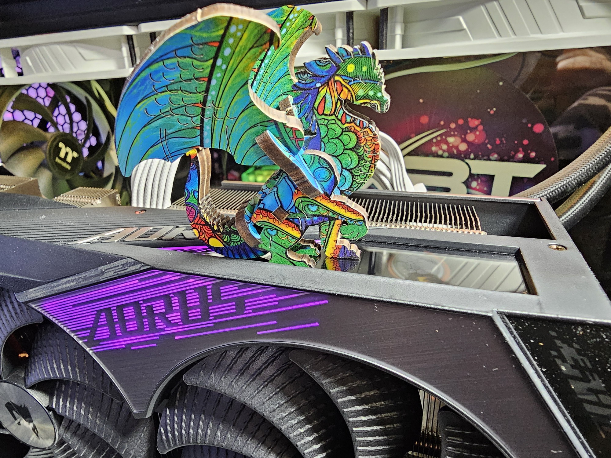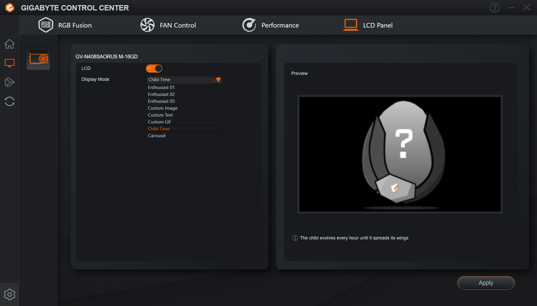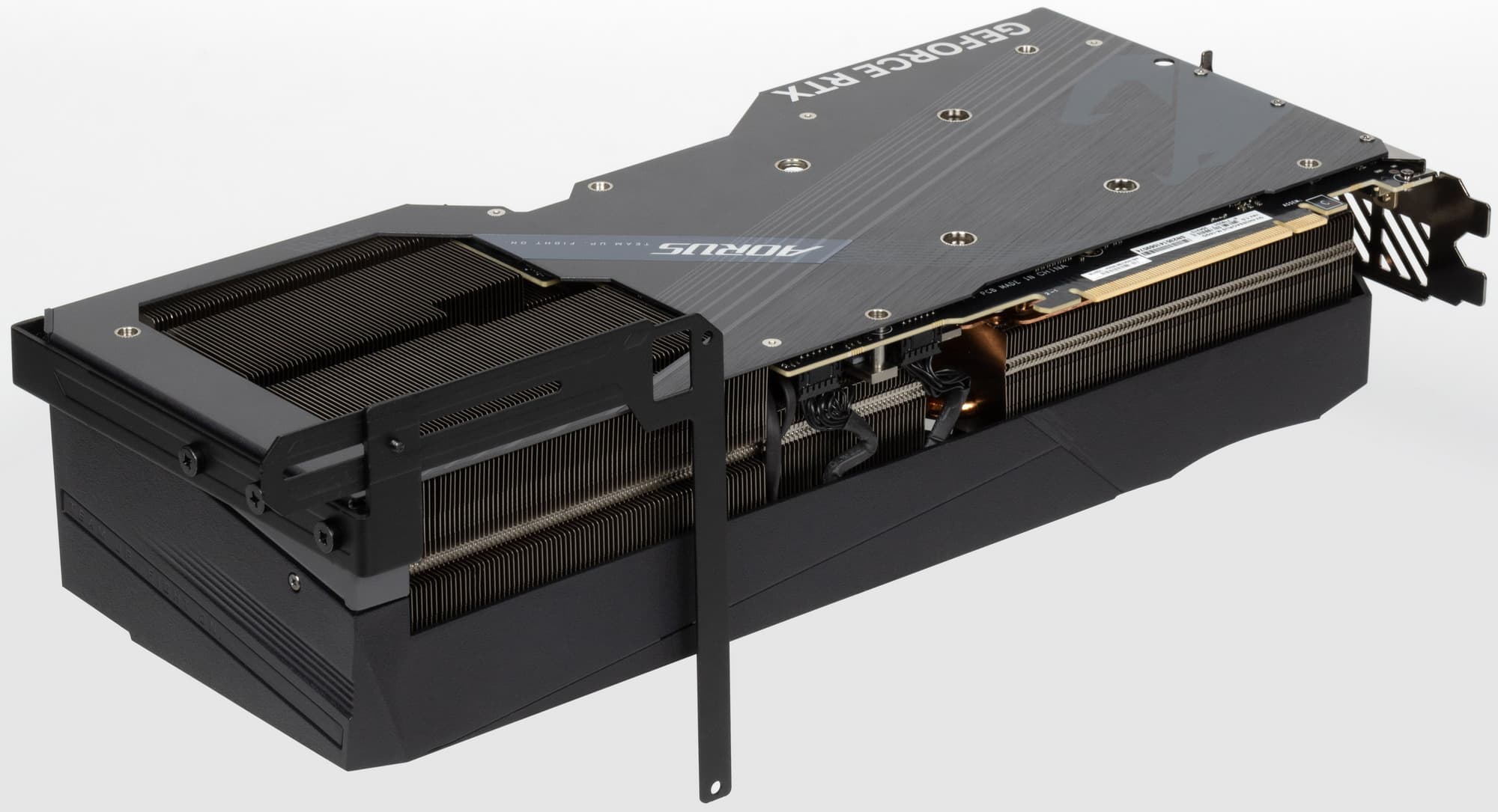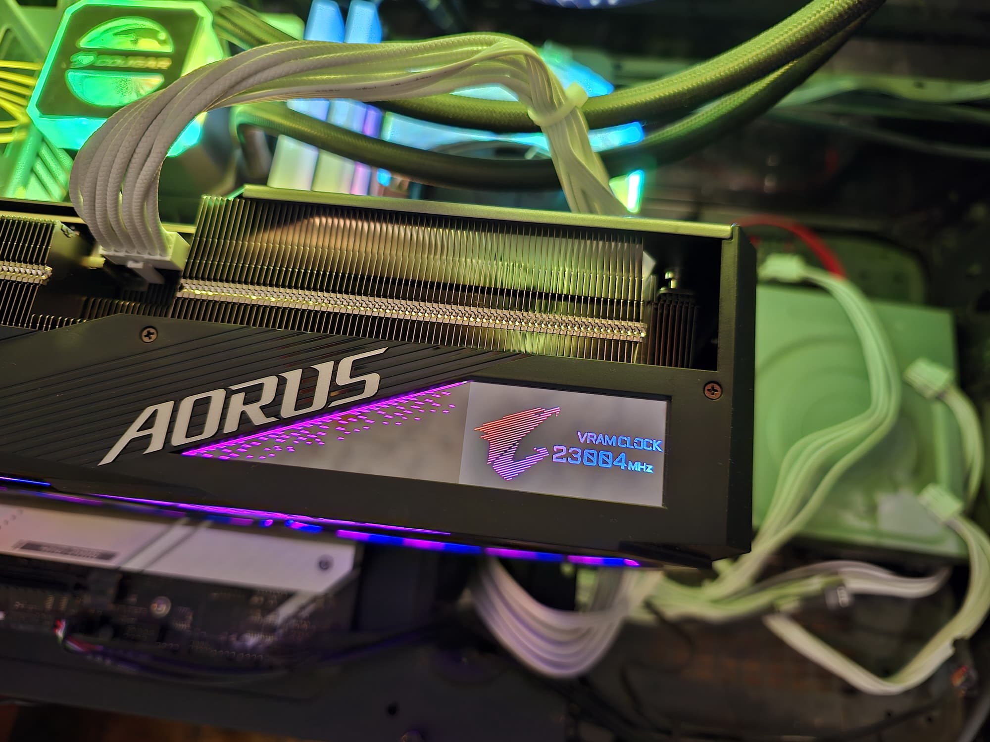 Изюминкой этой карты является оригинальная и стильная подсветка вентиляторов, а также наличие ЖК-экрана на торце, куда полезно выводить данные мониторинга. Также стоит отметить наличие в комплекте поставки надежного (хоть и без изысков) кронштейна, с помощью которого хвостовая часть ускорителя жестко крепится к корпусу ПК, что гарантирует отсутствие провисания тяжелой карты.