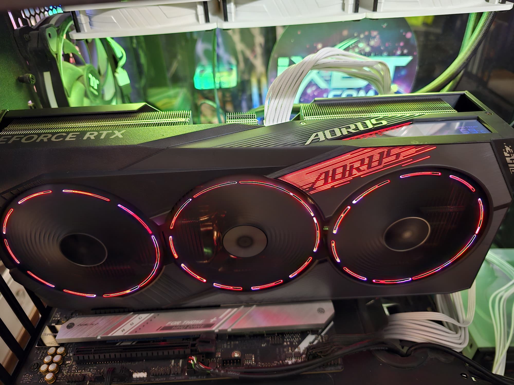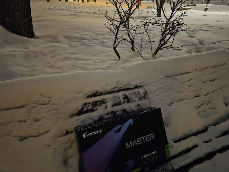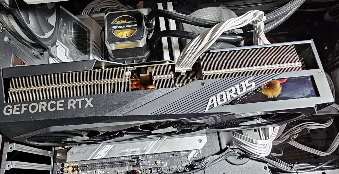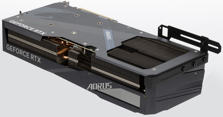 Конкретная протестированная карта Gigabyte Aorus GeForce RTX 4080 Super Master 16G (16 ГБ) — очень крупный представитель флагманского ускорителя игрового класса последнего поколения. Размеры карты просто завораживают: 35,5 см в длину и 16,5 см в высоту, а по ширине видеокарта занимает 4 слота в корпусе! При этом она потребляет не более 310-320 Вт, система охлаждения тихая, температурные параметры с запасом в пределах нормы.
