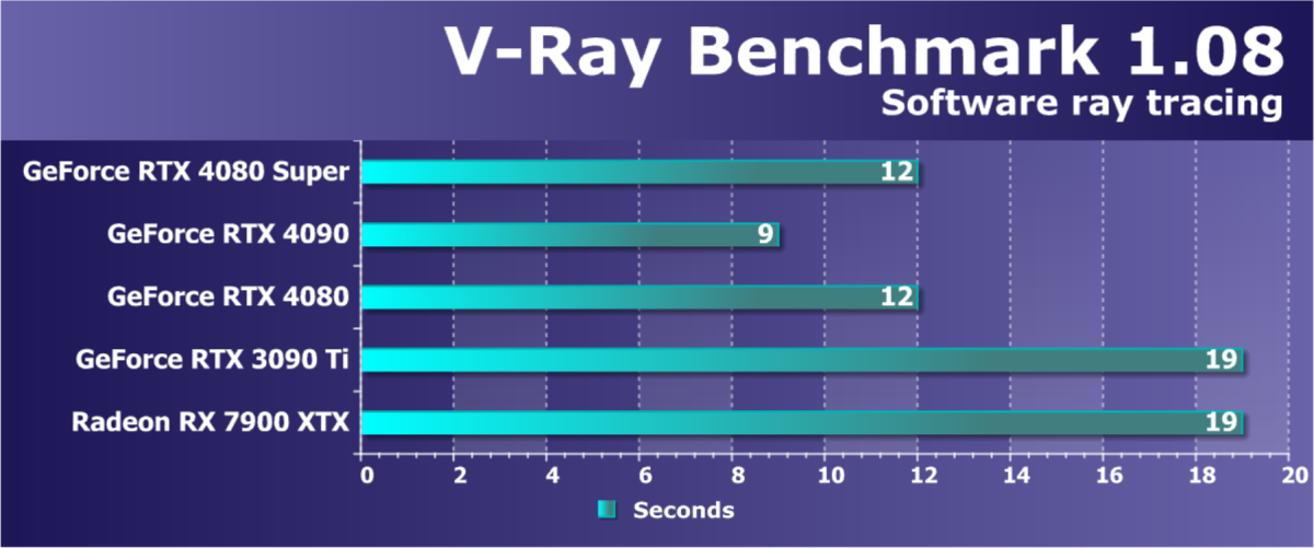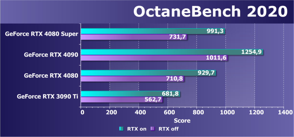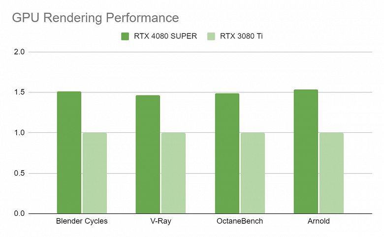 GeForce RTX 4080 Super неплохо подходит и для применения в профессиональных задачах по созданию цифрового контента: она достаточно производительная, имеет тензорные ядра, которые способны ускорять инструменты на основе искусственного интеллекта, а также аппаратные блоки для ускорения трассировки лучей, работа которых поддерживается в таких 3D-пакетах и движках, как Blender Cycles, Redshift, V-Ray, Octane и других. Всё это позволит ускорить визуализацию сложных сцен и эффективнее работать над проектами. Новинка опережает по производительности GeForce RTX 3080 Ti в таких задачах раза в полтора, что весьма неплохо: