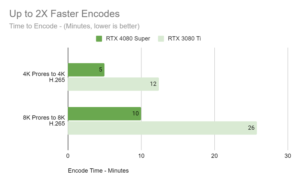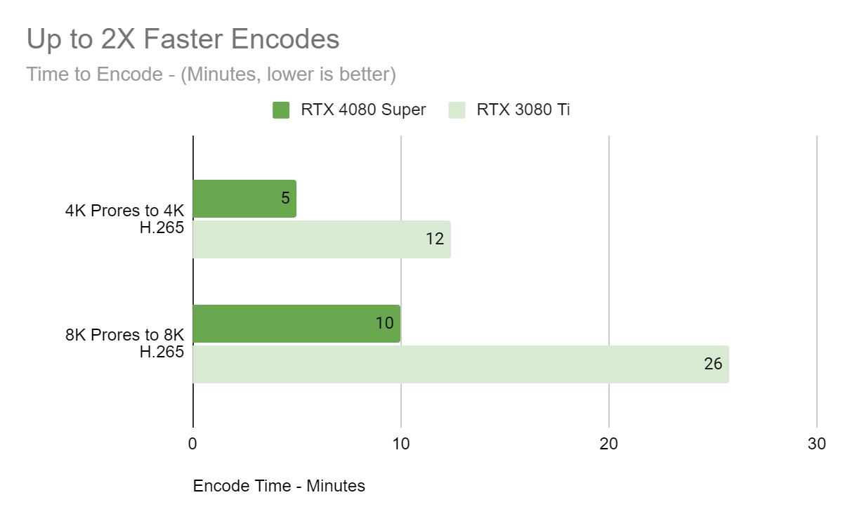 Кроме этого, почти все представленные графические процессоры Ada имеют по два аппаратных кодировщика NVEnc на борту, что позволяет им кодировать видеоданные с разрешением 8K при 60 FPS или сразу четыре видеопотока разрешения 4K при 60 FPS. И при этом процесс будет проходить более чем вдвое быстрее, чем на GeForce RTX 3080 Ti, что также может быть весьма полезно:
