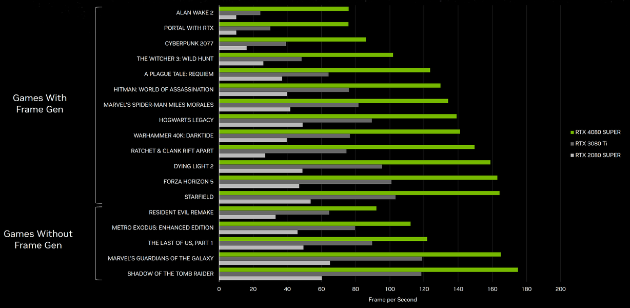 По собственным тестам компании Nvidia, новинка значительно опережает аналоги из двух предыдущих (полноценных) поколений, с GeForce RTX 4080 ее по понятным причинам не сравнивают — разница слишком незначительна. Если присмотреться к диаграмме, то становится видно, что бо́льшая часть из протестированных игр использует генерацию кадров DLSS 3, что воспринимается однозначно не всеми игроками. Плюс, как обычно, от игры к игре ситуация может сильно отличаться, но в целом GeForce RTX 4080 Super раза в полтора быстрее, чем GeForce RTX 3080 Ti, с генерацией кадров — вдвое и больше, а уж GeForce RTX 2080 Super вообще где-то очень далеко позади, особенно в самых современных играх с активной трассировкой лучей.