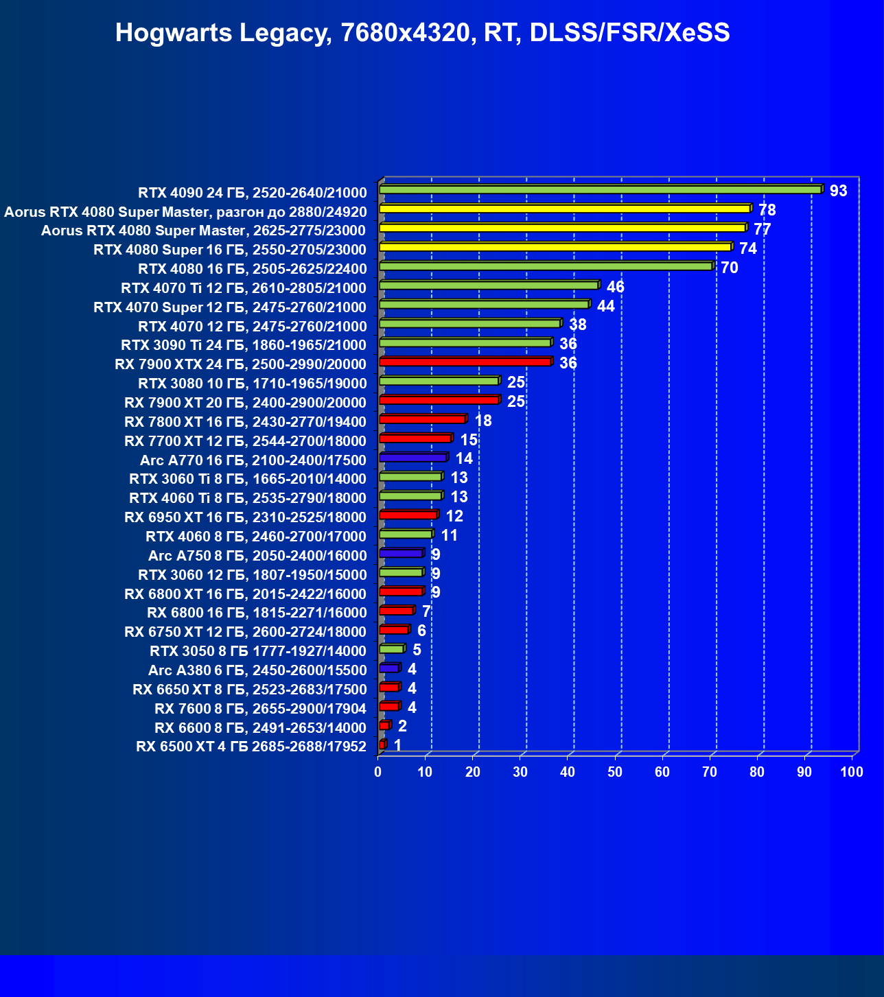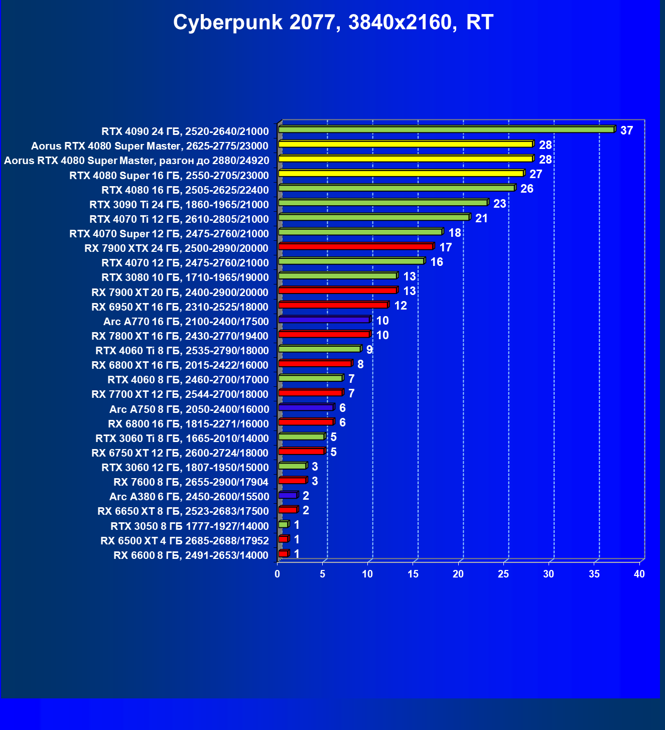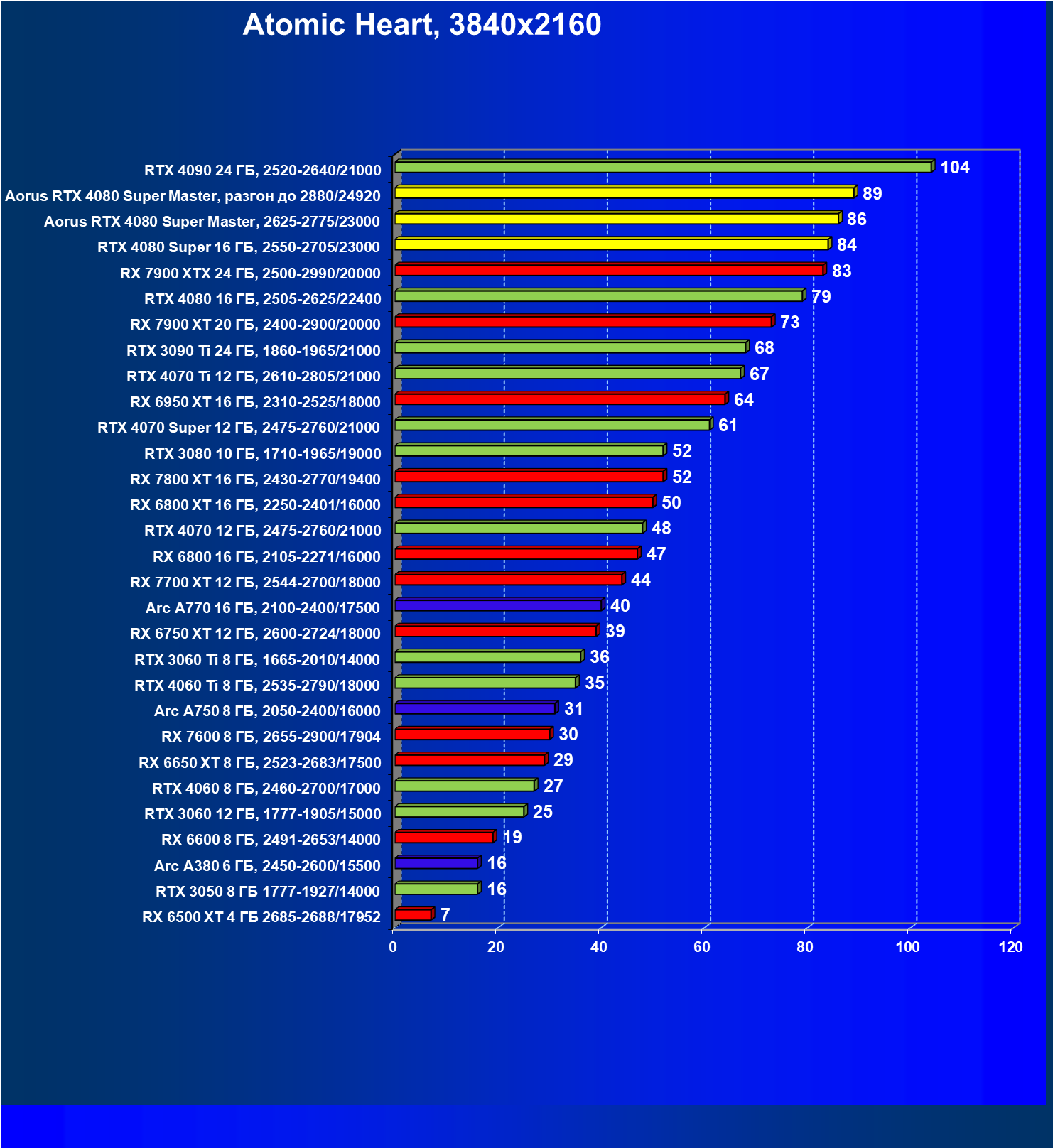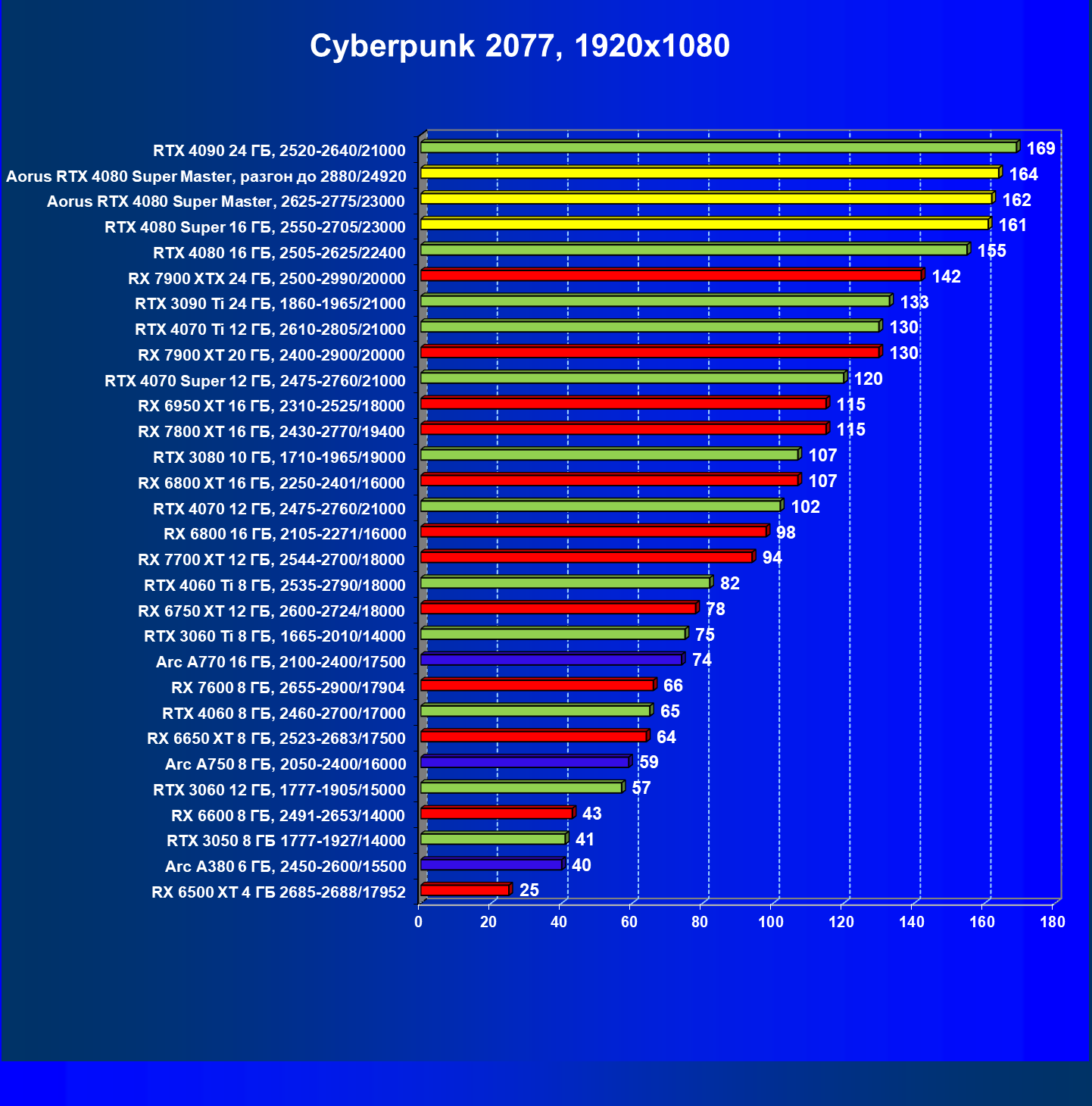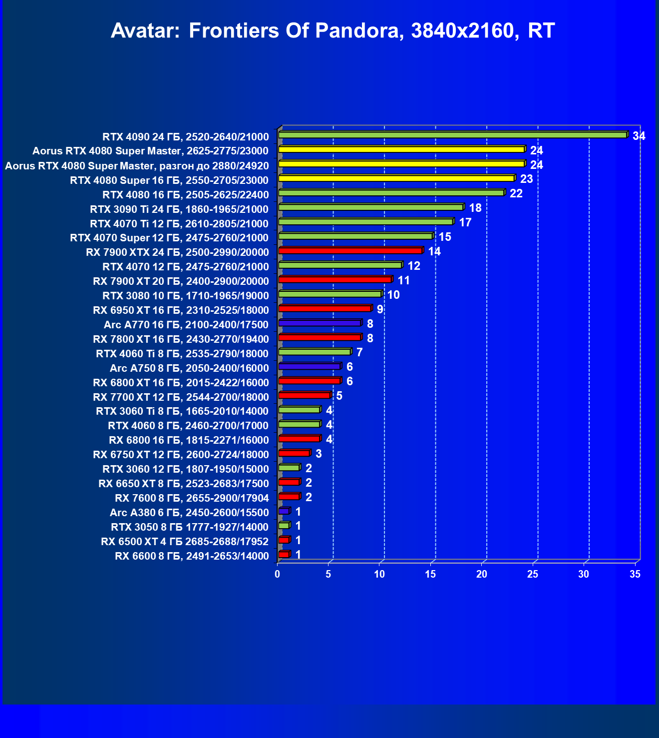 | 25 | Aorus RTX 4080 Super Master, разгон до 2880/24920 | 131 | 1764 | 135 000 |