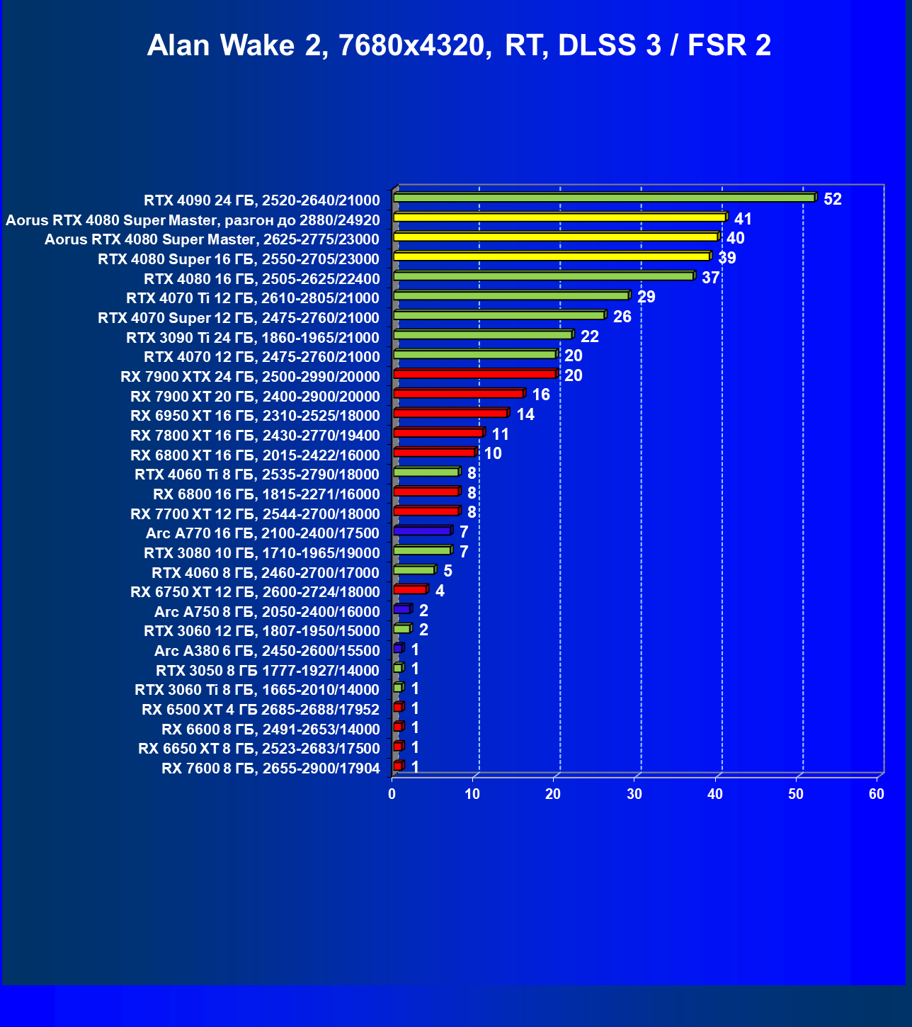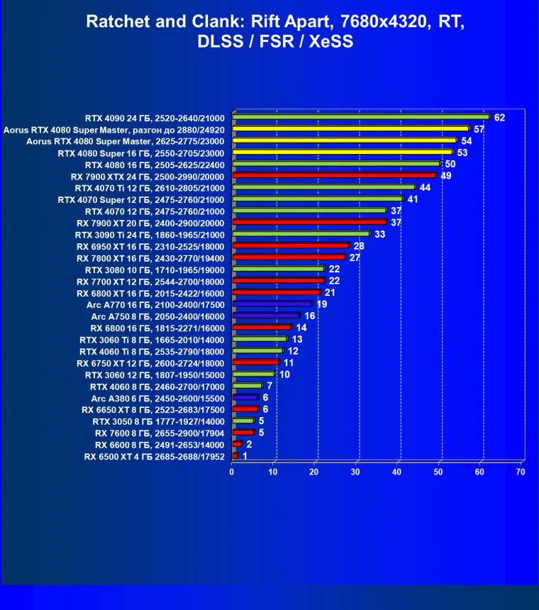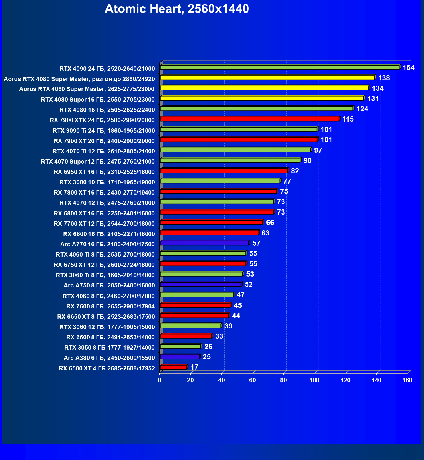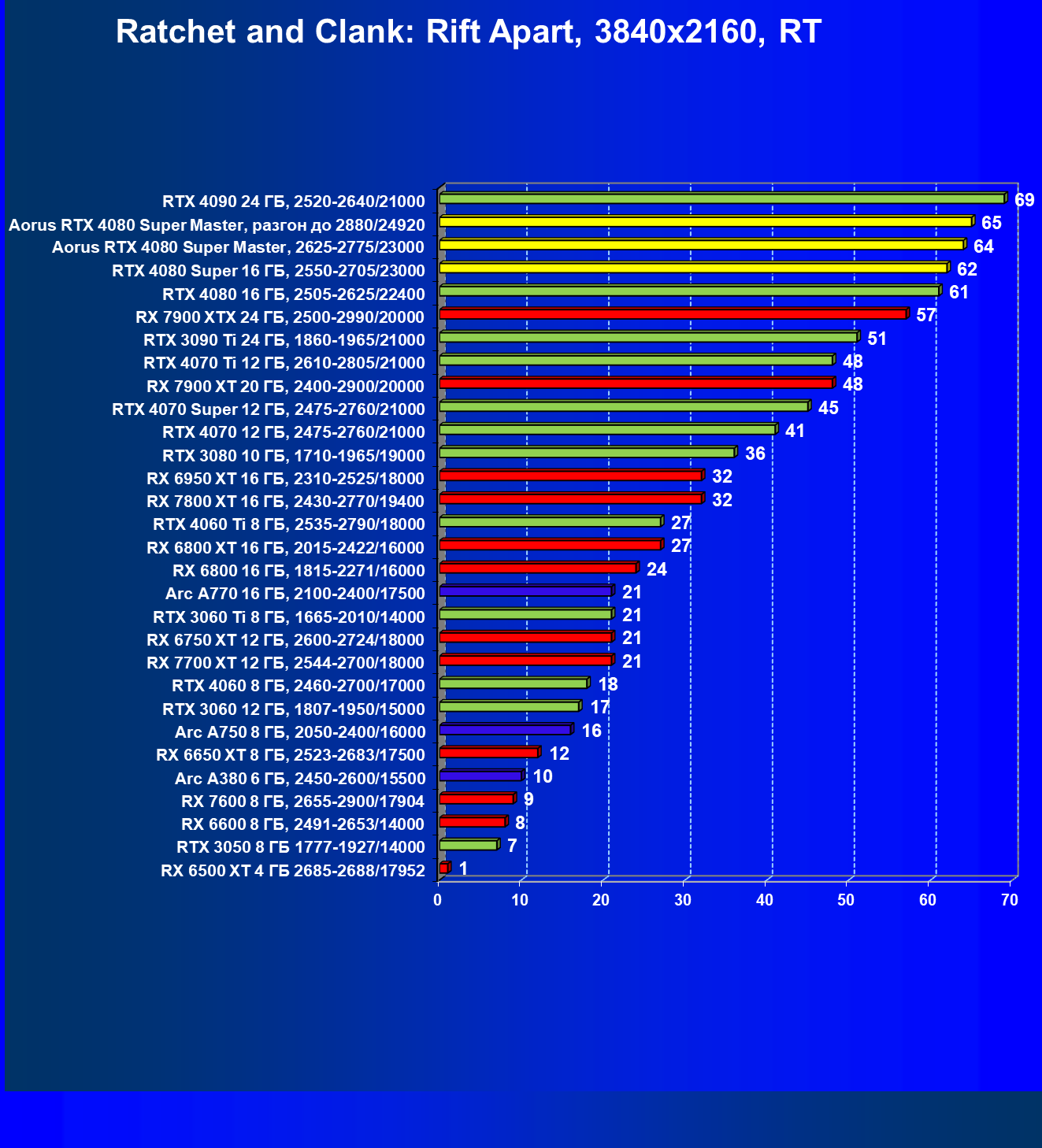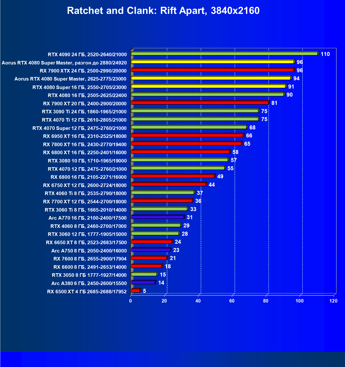 | 25 | Aorus RTX 4080 Super Master, разгон до 2880/24920 | 131 | 1764 | 135 000 |