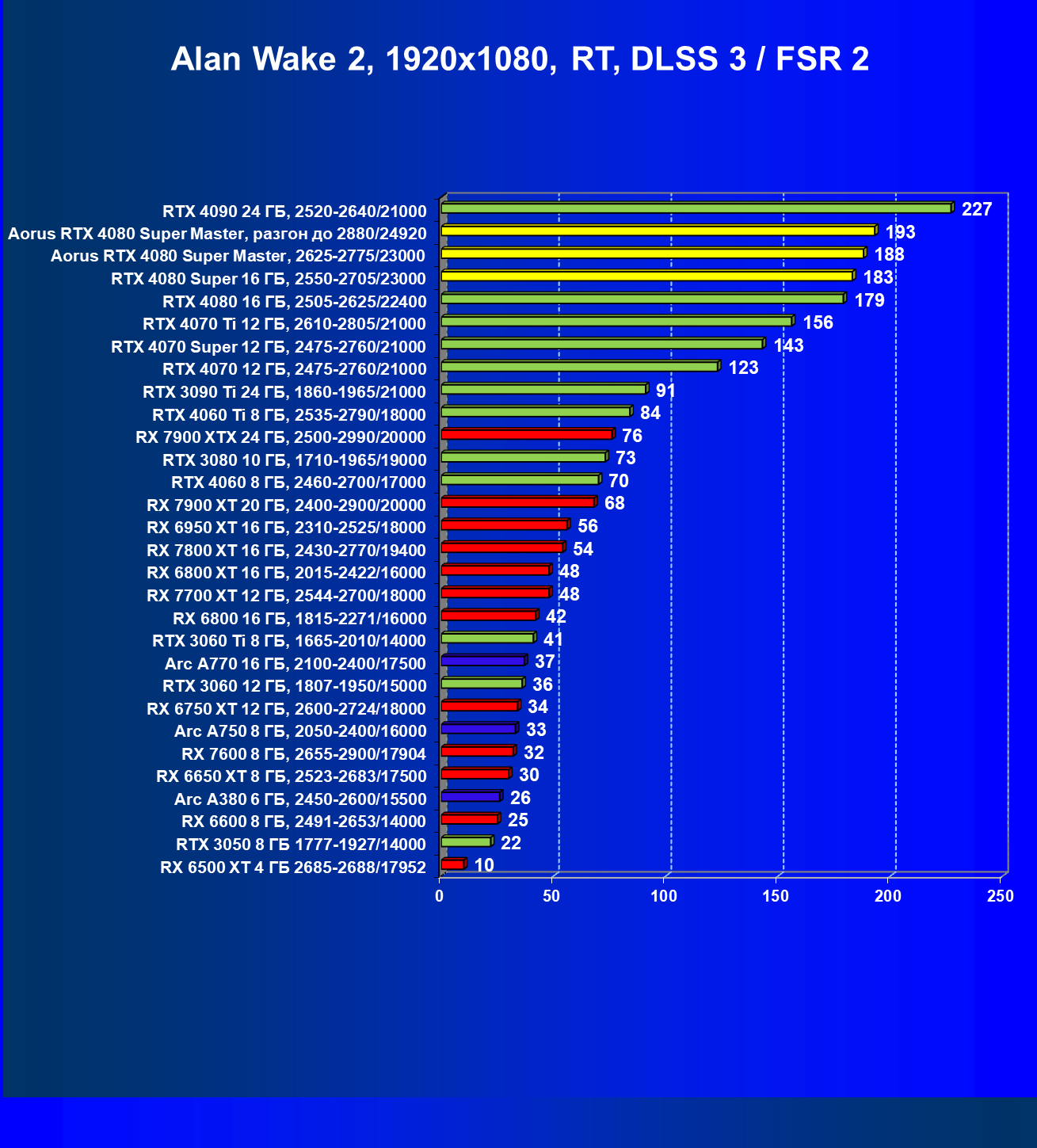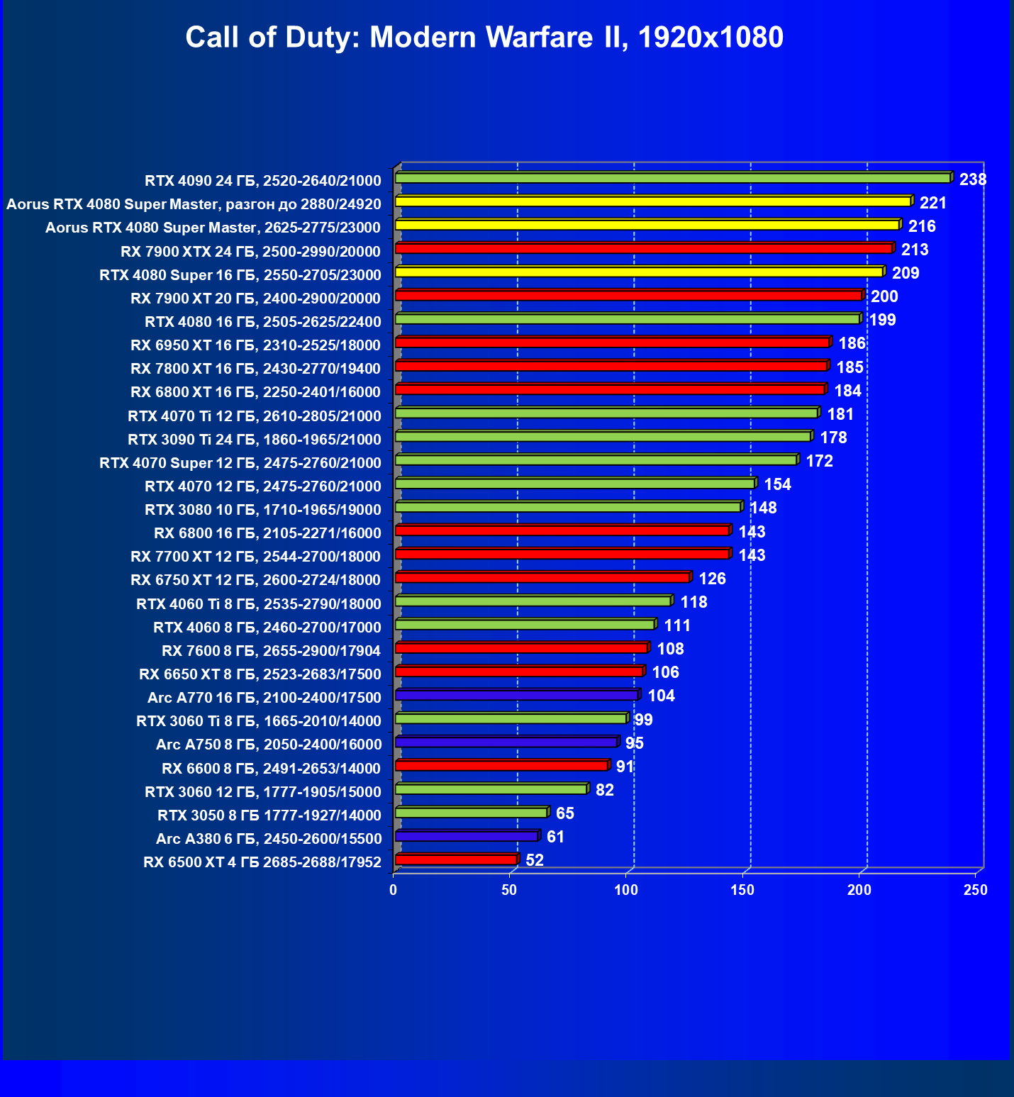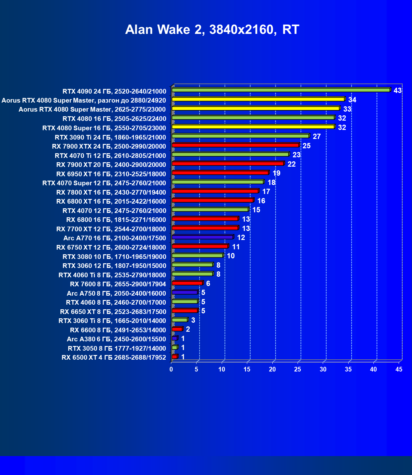 | 07 | RX 7900 XTX 24 ГБ, 2500—2990/20000 | 2163 | 221 | 98 000 |