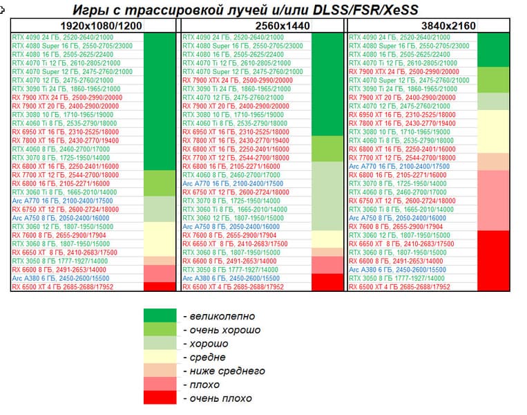 И вот когда в дело вступает трассировка лучей, решения AMD сникают и выбывают за пределы призовых мест. В этом рейтинге Radeon RX 7900 XTX весьма существенно уступает даже GeForce RTX 4080, не говоря уже о GeForce RTX 4080 Super. Учитывая, что в перспективе львиная доля 3D-игр по умолчанию будет поддерживать и RT, и DLSS/FSR/XeSS, данный рейтинг более показателен для тех, кто покупает дорогую видеокарту именно на приличную перспективу.