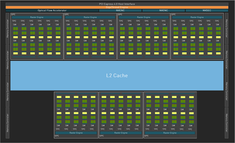 Как и все графические процессоры компании Nvidia, чип AD103 состоит из укрупненных кластеров Graphics Processing Cluster (GPC), которые включают несколько кластеров текстурной обработки Texture Processing Cluster (TPC), содержащих потоковые процессоры Streaming Multiprocessor (SM), блоки растеризации ROP и контроллеры памяти. Кластер GPC самостоятельно производит основные вычисления внутри кластера, и включает свой движок растеризации Raster Engine, пять-шесть кластеров TPC, состоящих из вдвое большего количества мультипроцессоров SM. Рассмотрим блок-схему графического процессора в полной конфигурации: