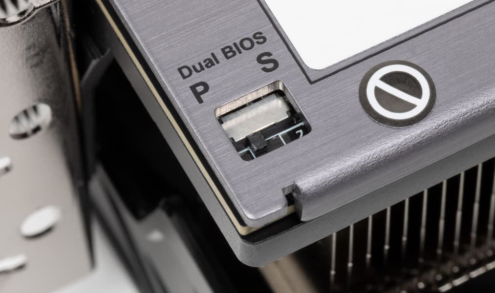 Карта имеет два режима работы, они заложены в двух вариантах BIOS, которые переключаются с помощью переключателя на верхнем торце карты: P (performance / производительный, он же 1) и S (silent / тихий, он же 2). Разница между режимами заключается не только в оборотах вентиляторов, также у GPU в этих режимах разные максимальные и бустовые частоты. При этом предел энергопотребления для BIOS P заложен в 500 Вт, а для BIOS S — 450 Вт.