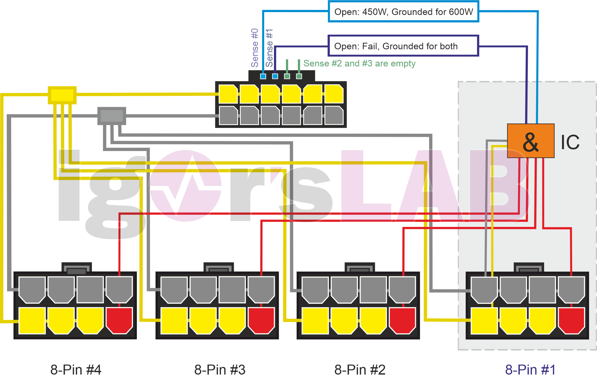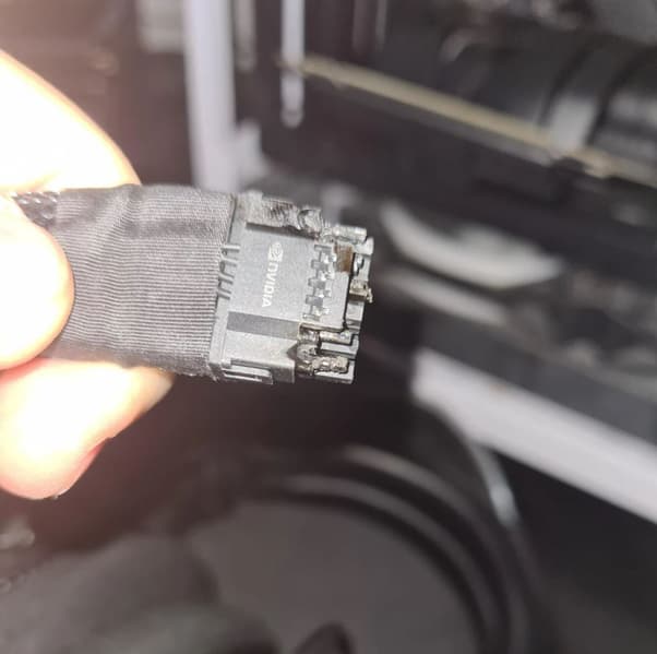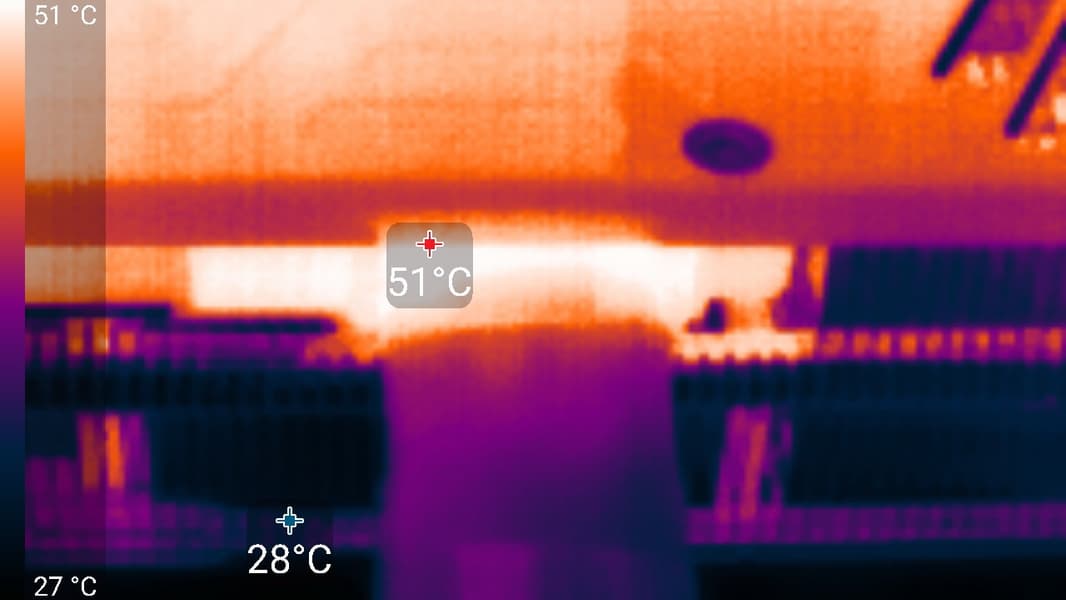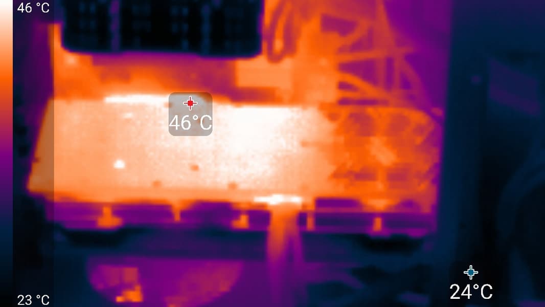 Максимальный нагрев наблюдался около разъема питания, о чем можно было догадаться и так: ведь в такой небольшой по размерам разъем сходятся четыре 8-контактных разъема, а максимально пропускаемая через данный 16-контактный разъем мощность достигает 600 Вт. Конечно же, в этом месте сам разъем и текстолит могут максимально нагреваться. Зачем так сделали разработчики спецификации PCIe — не очень понятно (ранее просто росло число устанавливаемых на PCB 8-контактных разъемов, что помогало распределять тепловую нагрузку на бо́льшую площадь).